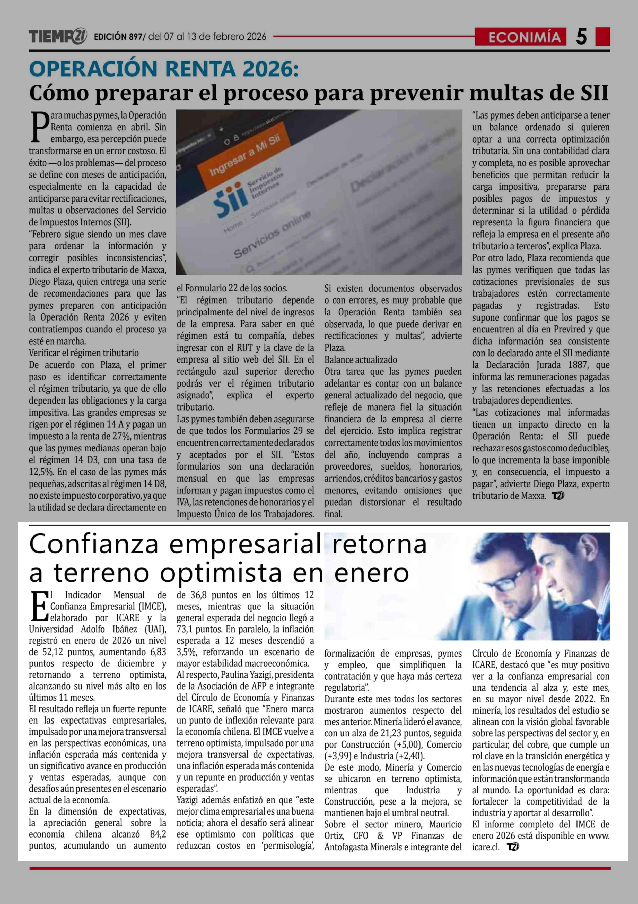 Confianza empresarial retorna a terreno optimista en enero Indicador Mensual de de 36,8 puntos en los últimos 12 07-02-2026 Tiempo 21 |