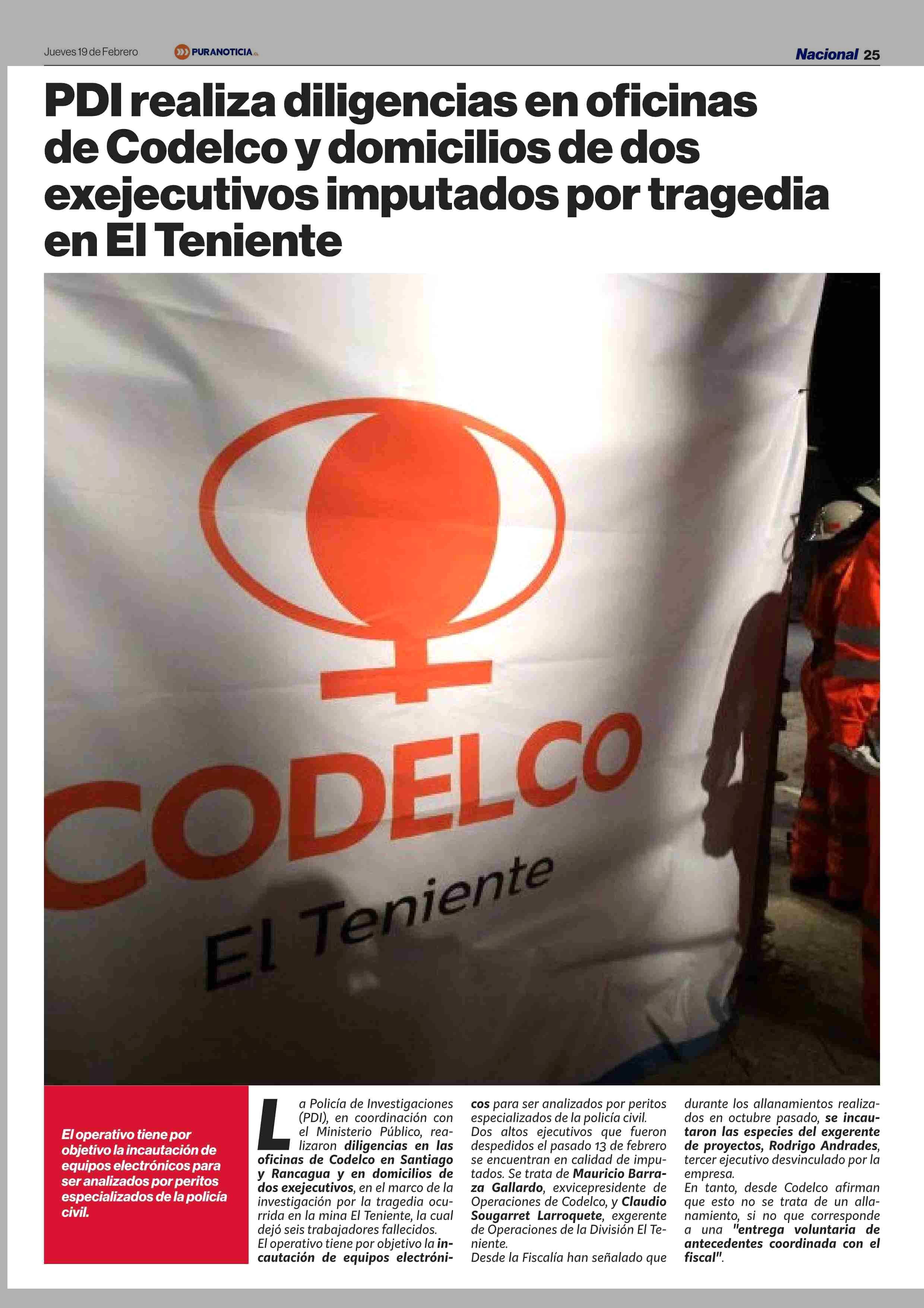 PDI realiza diligencias en oficinas de Codelco y domicilios de dos imputados por tragedia en El Teniente 19-02-2026 Puranoticia.cl |
