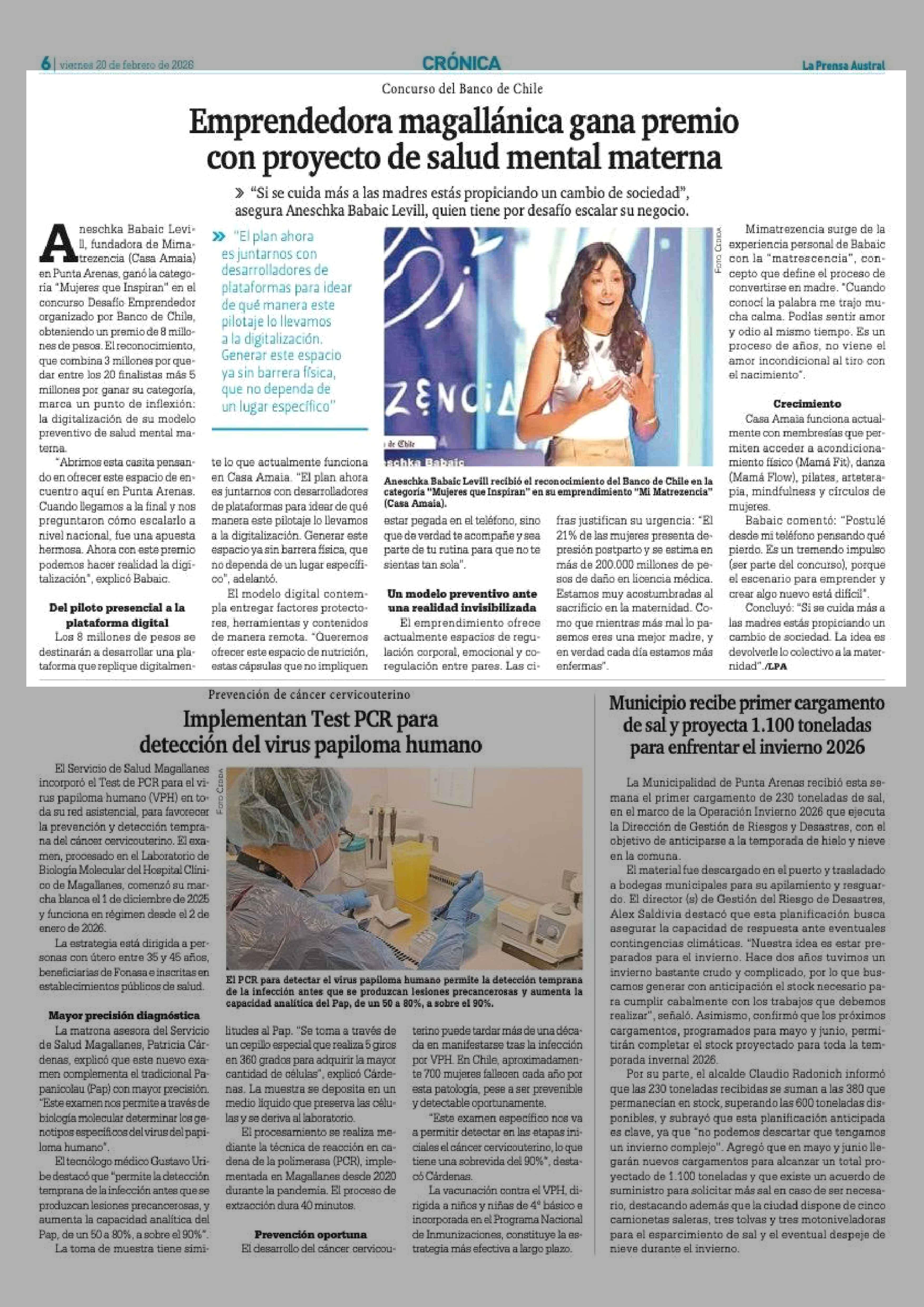 Emprendedora magallánica gana premio con proyecto de salud mental materna 20-02-2026 La Prensa Austral |