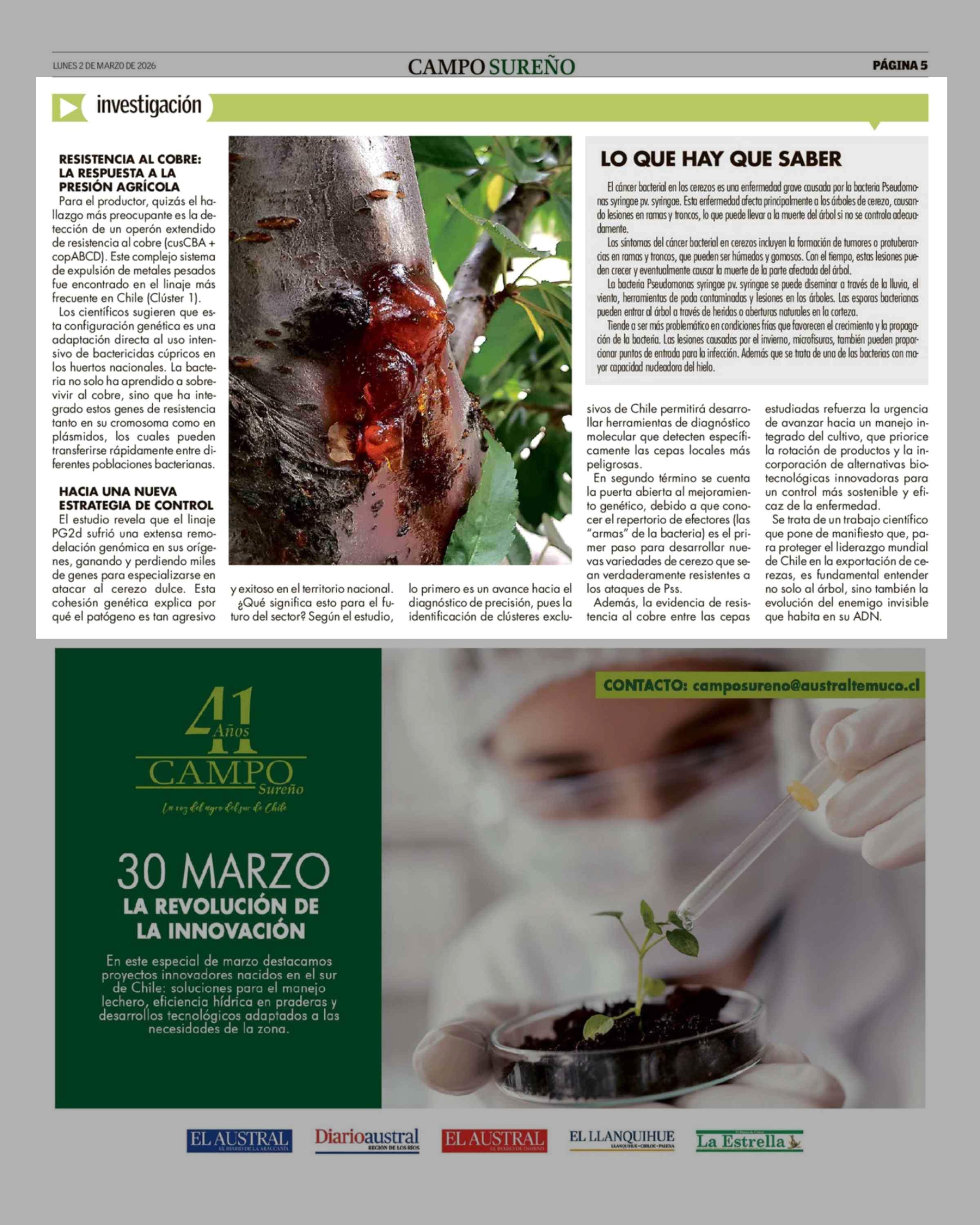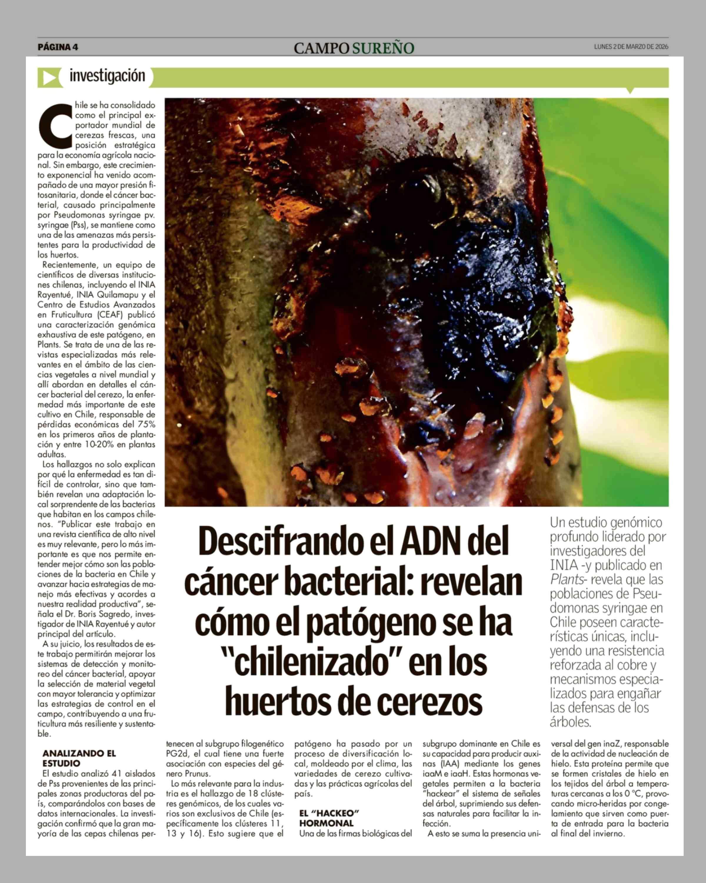 Título: Descifrando el ADN del cáncer bacterial: revelan cómo el patógeno se ha "chilenizado" en los huertos de cerezos
