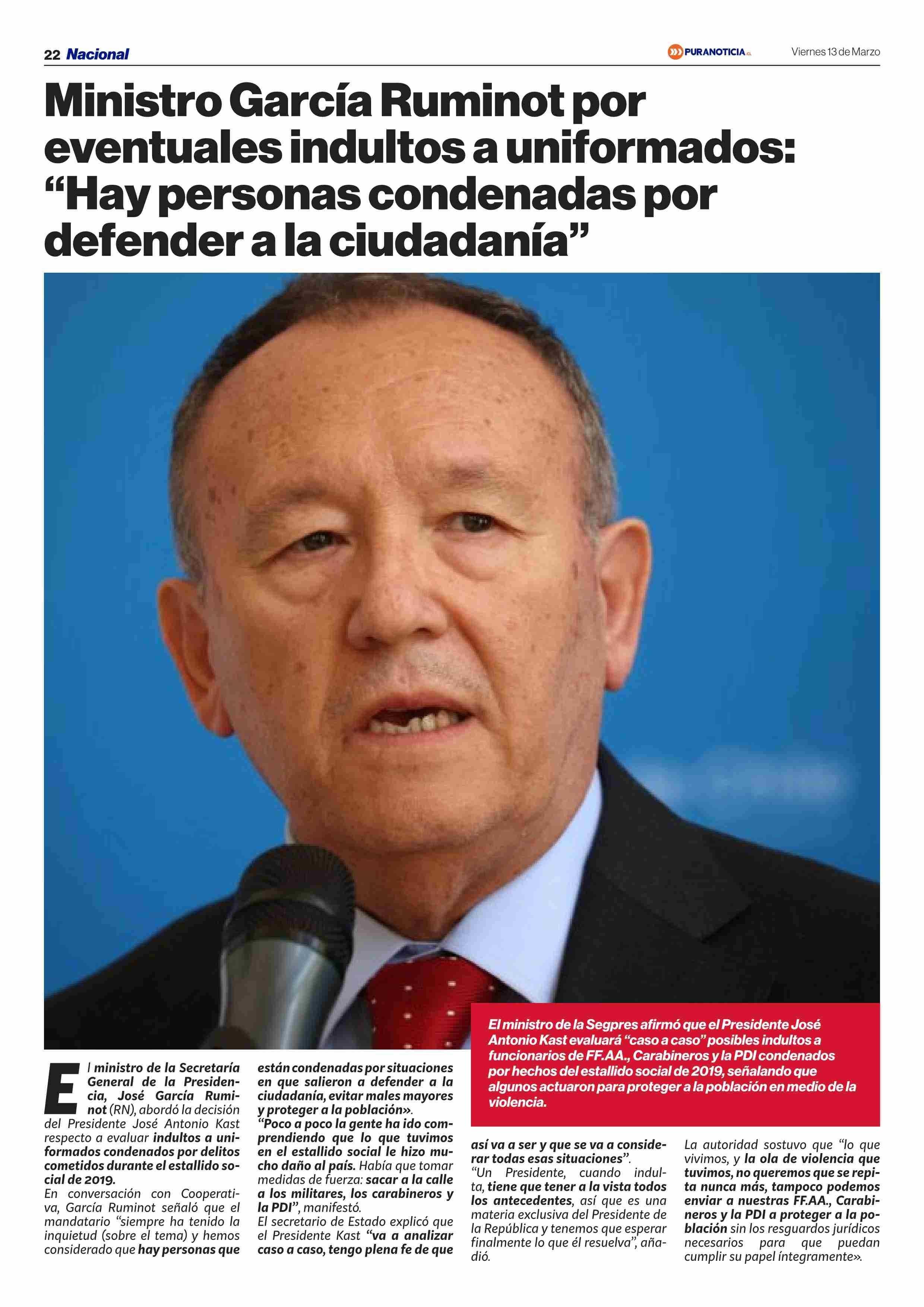 Título: Ministro García Ruminot por eventuales indultos a uniformados: “Hay personas condenadas por defender a la ciudadanía”