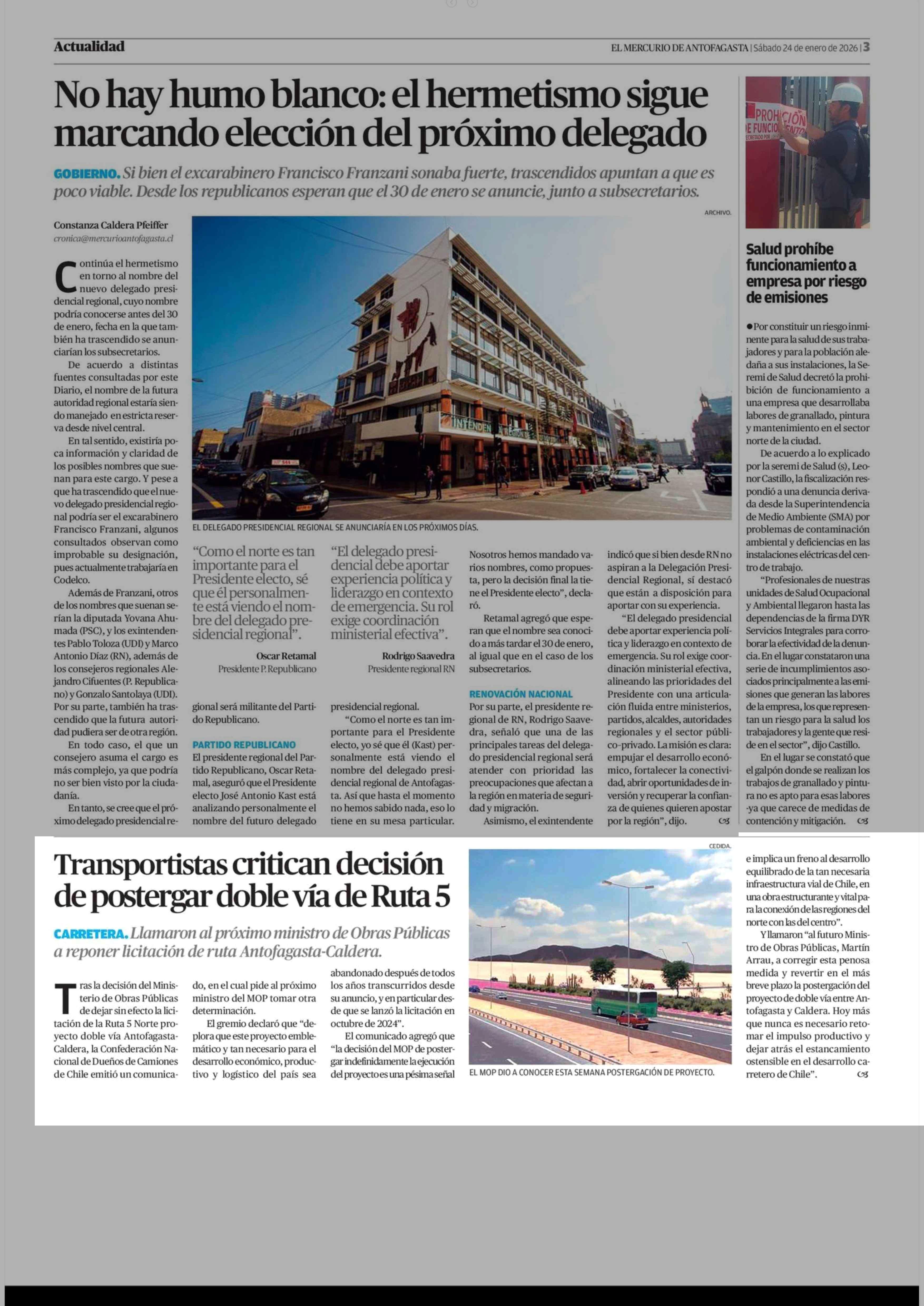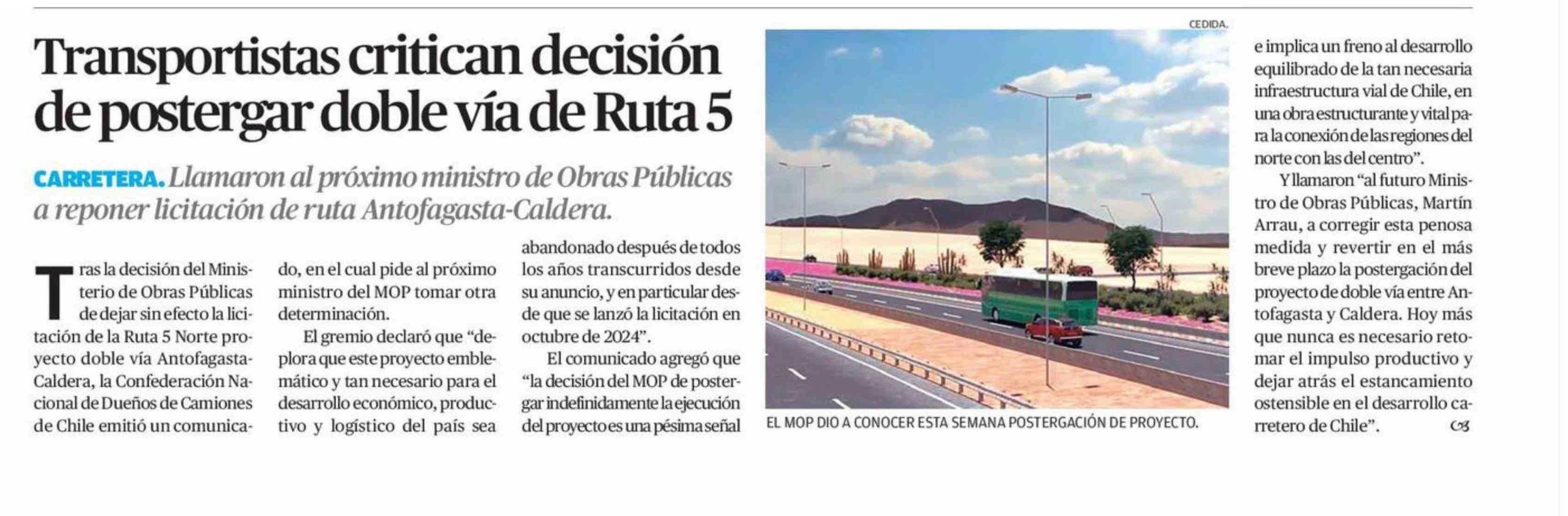 Transportistas critican decisión de postergar doble vía de Ruta 5 24-01-2026 El Mercurio de Antofagasta |