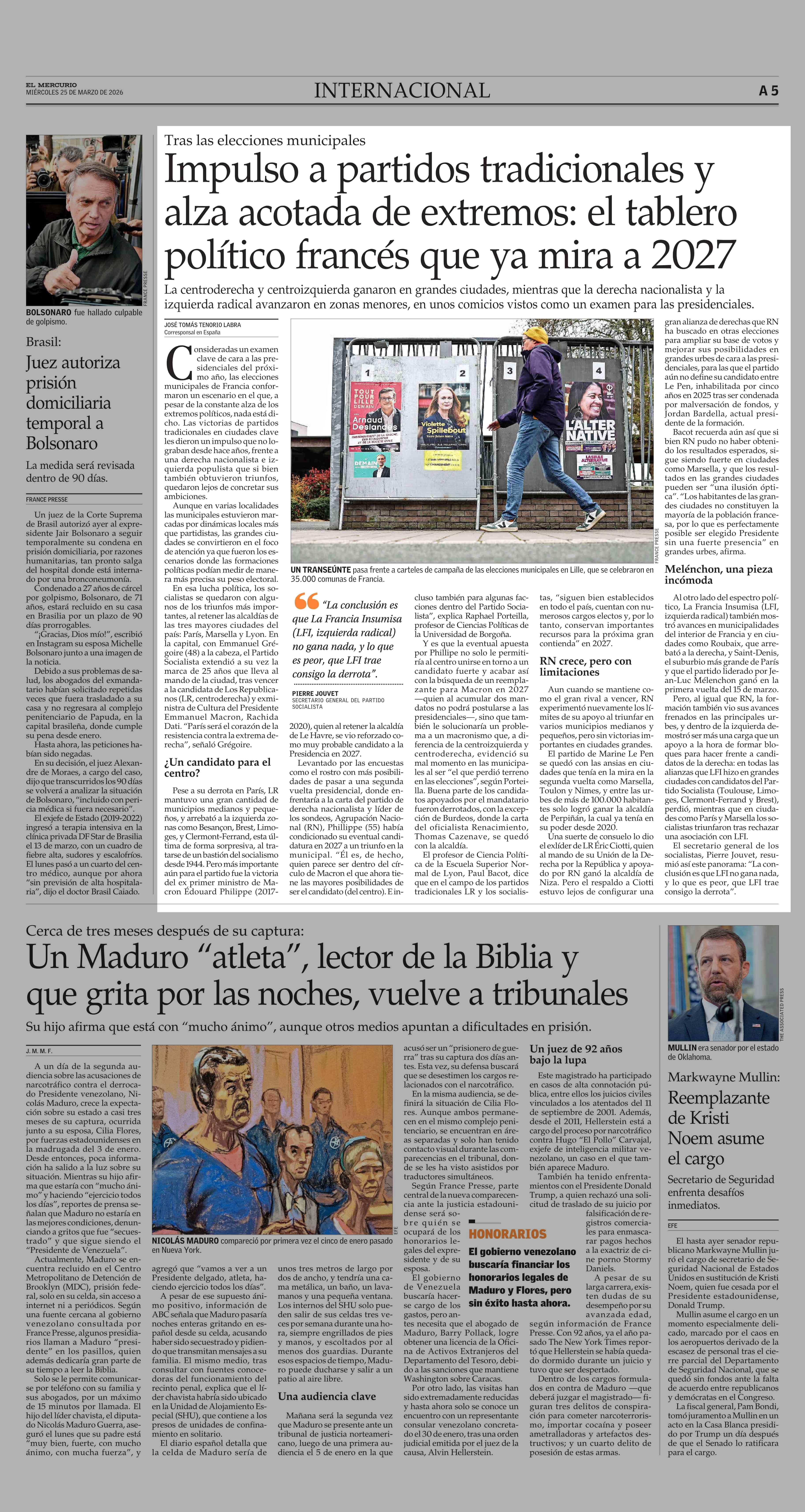 Impulso a partidos tradicionales y alza acotada de extremos: el tablero político francés que ya mira a 2027 25-03-2026 El Mercurio |