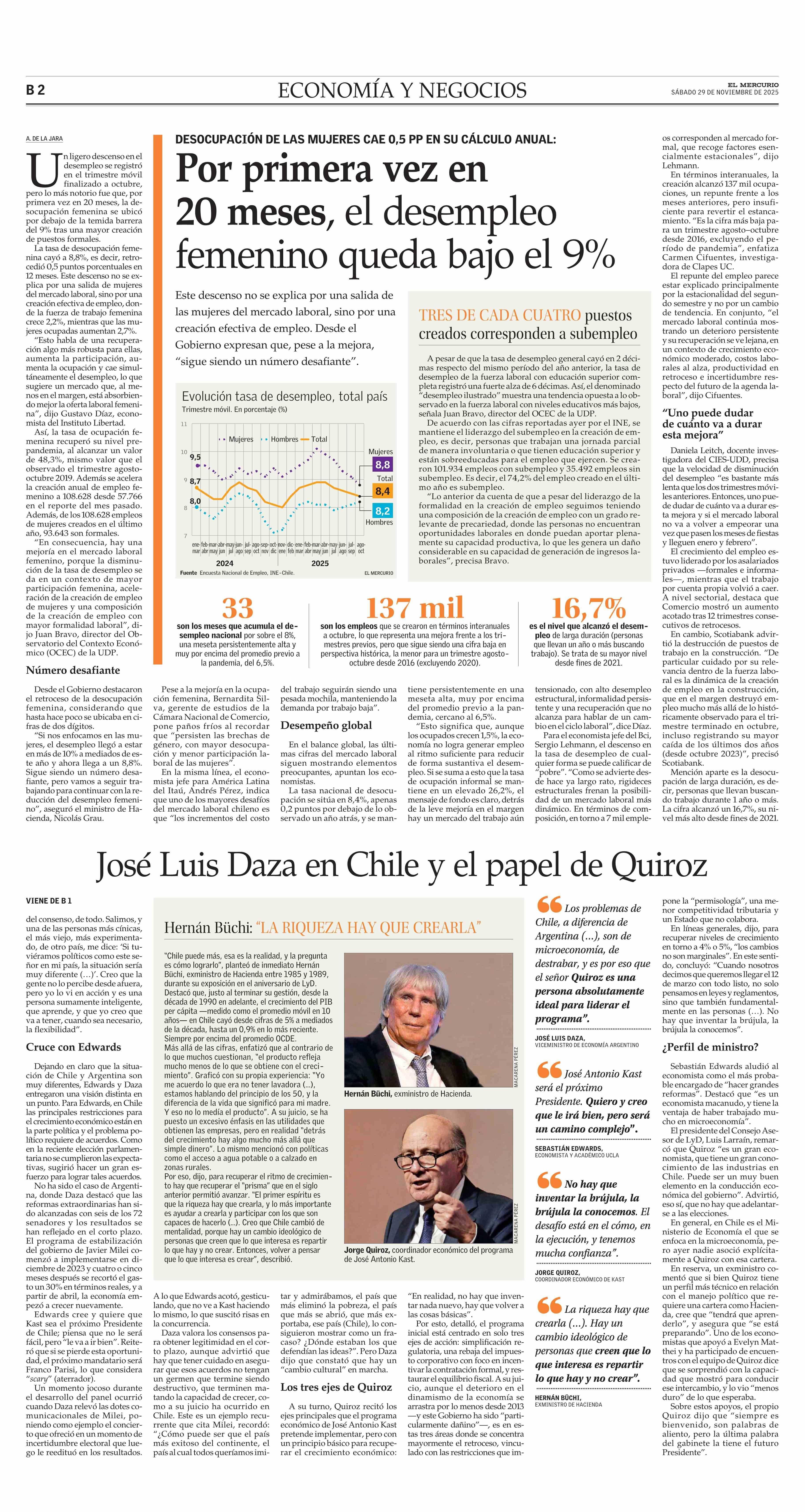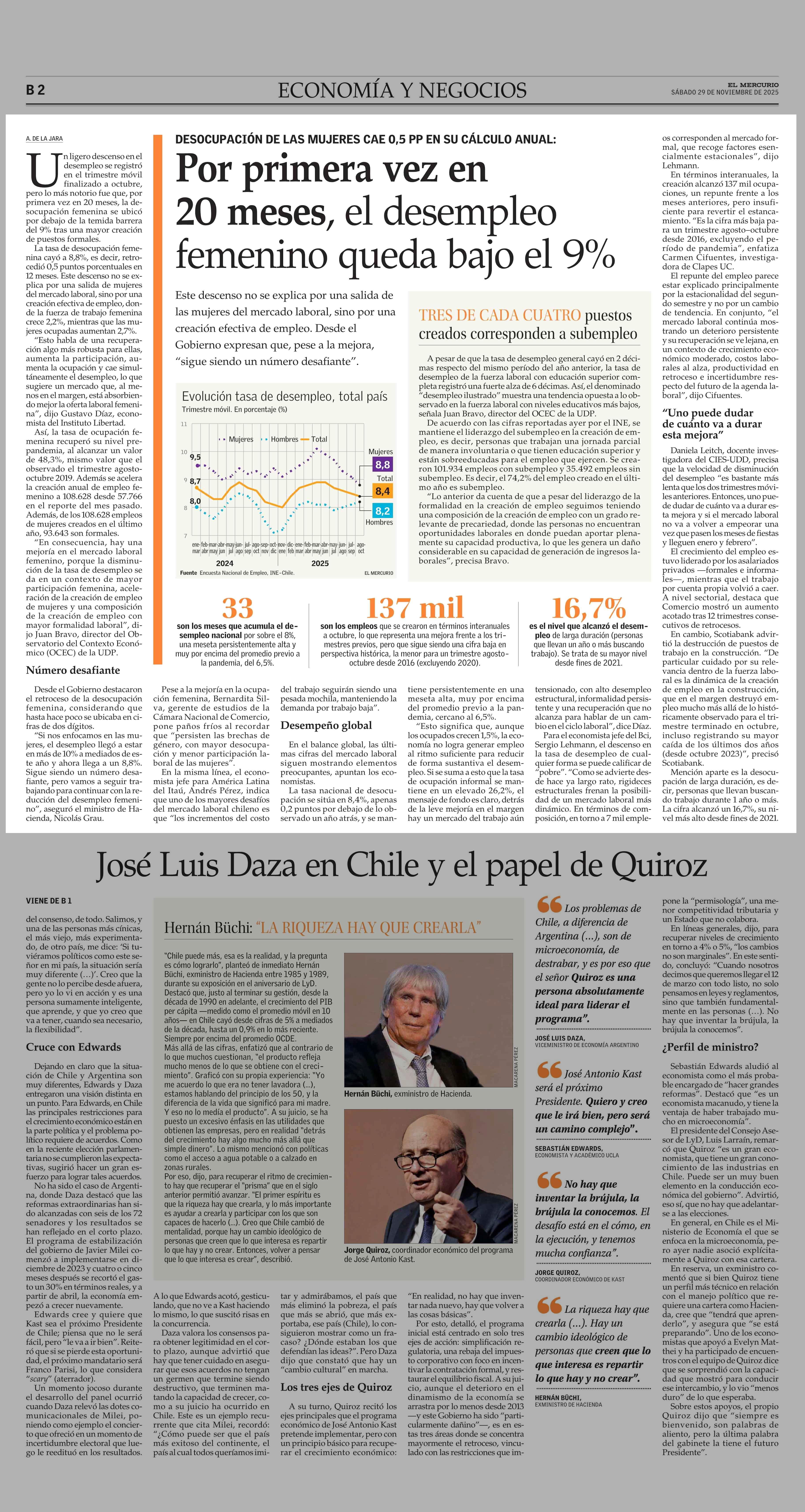 Por primera vezen 20 meses, el desempleo femenino queda bajo el 9% 29-11-2025 El Mercurio |