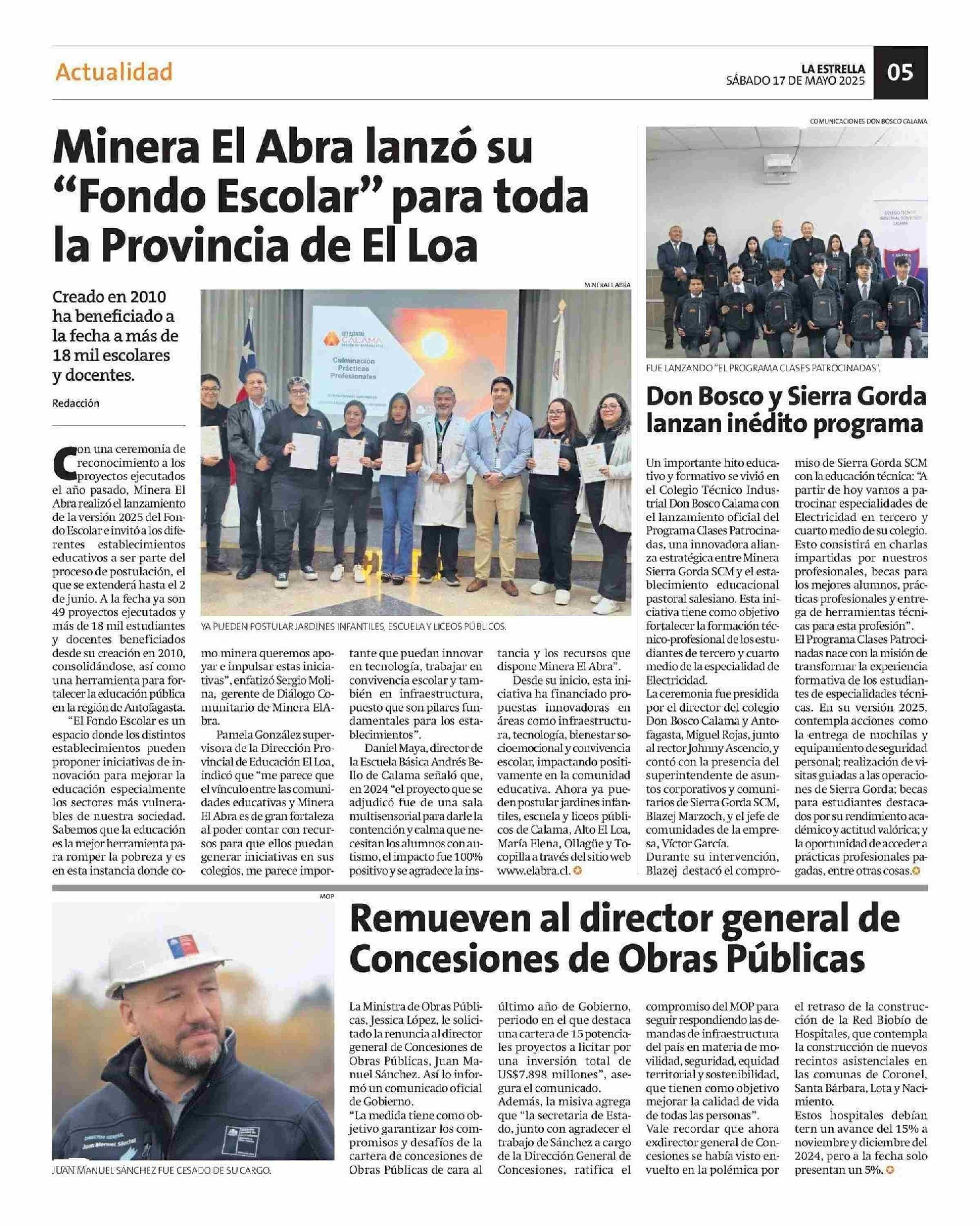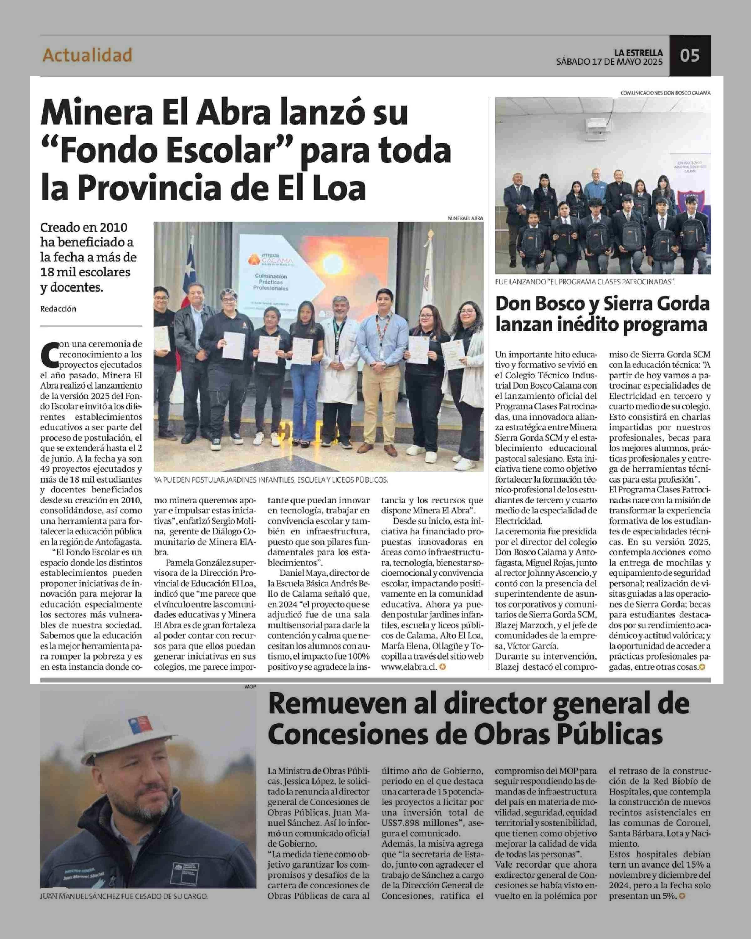Minera El Abra lanzó su “Fondo Escolar” para toda la Provincia de El Loa 17-05-2025 La Estrella de Antofagasta |