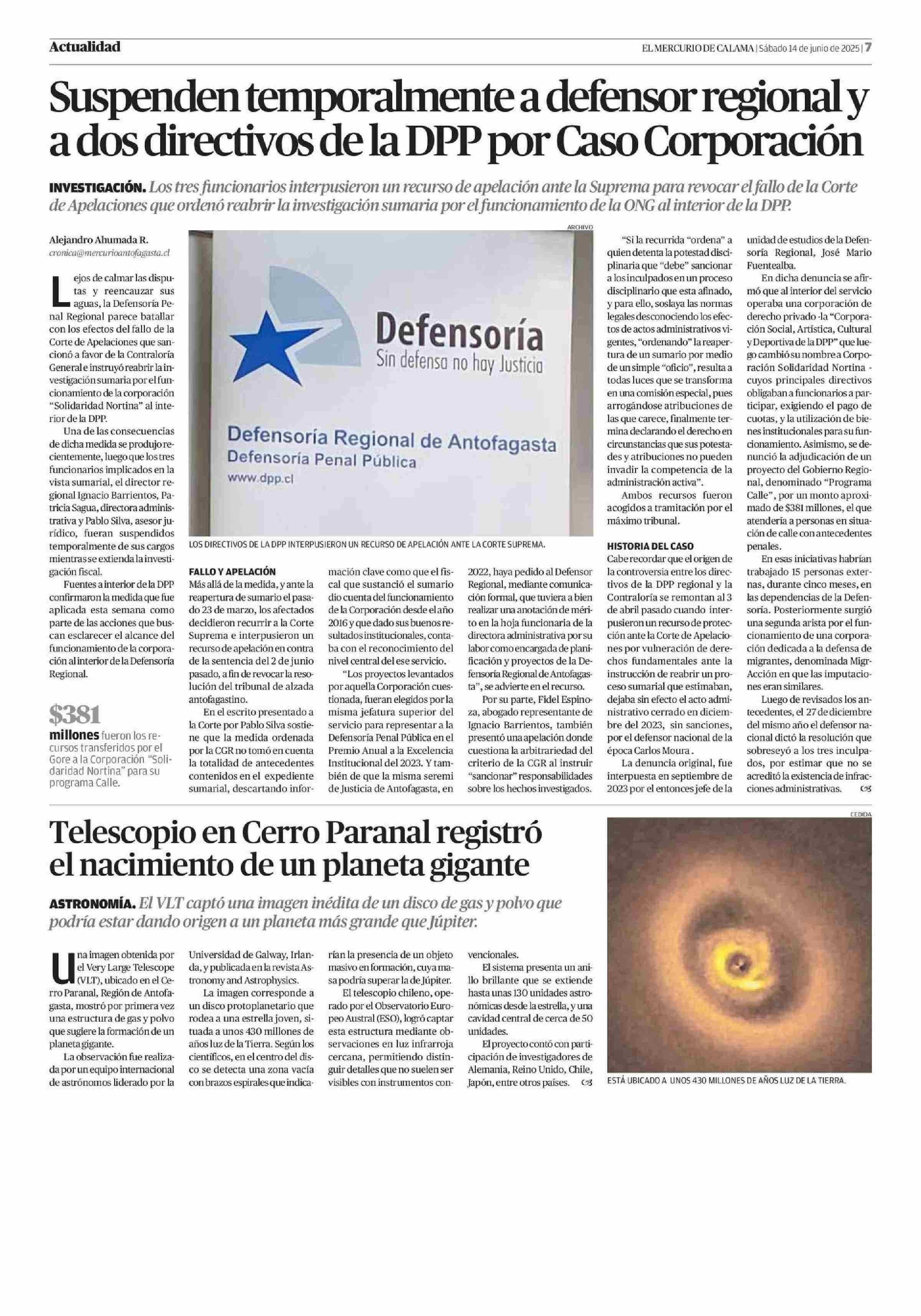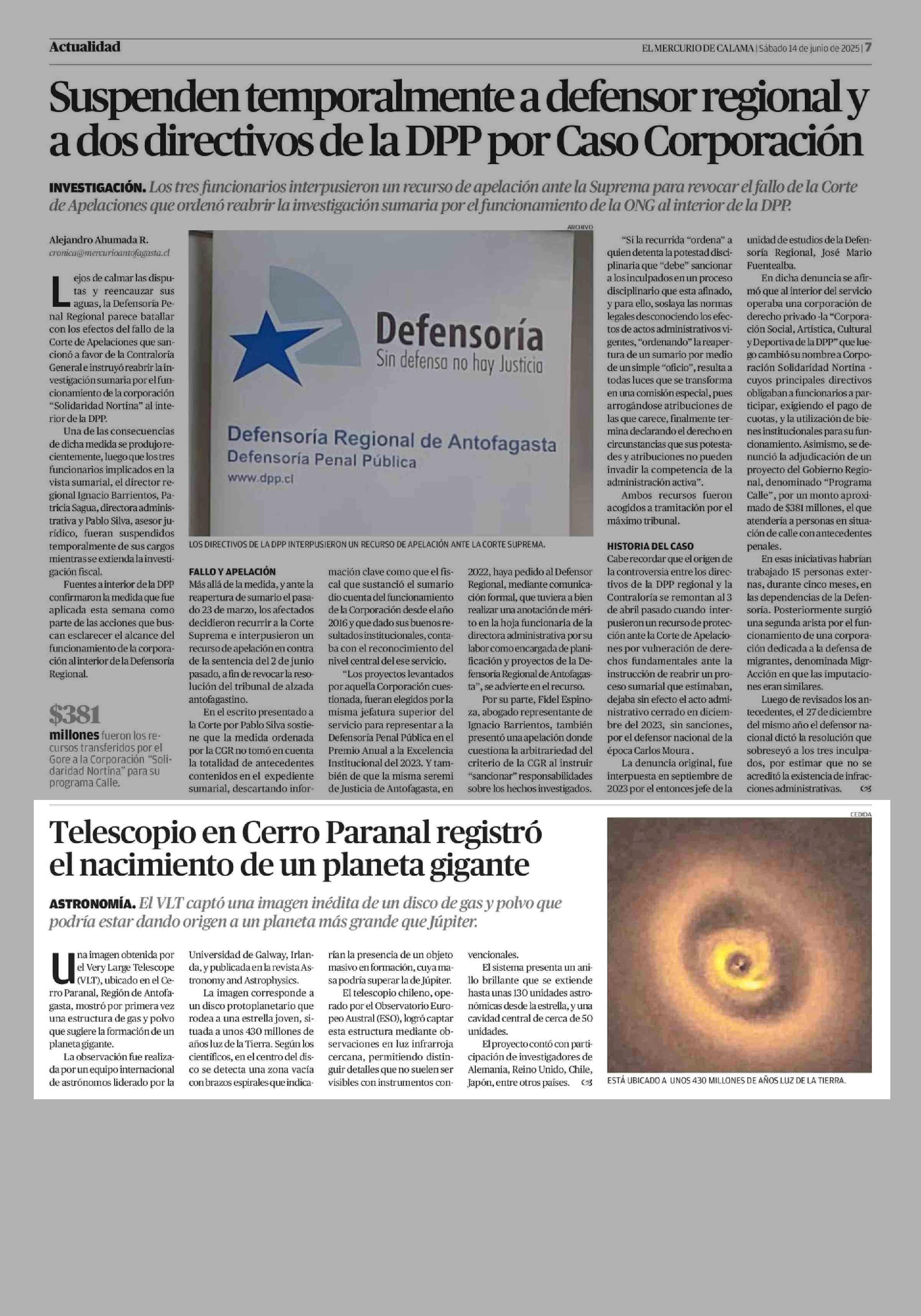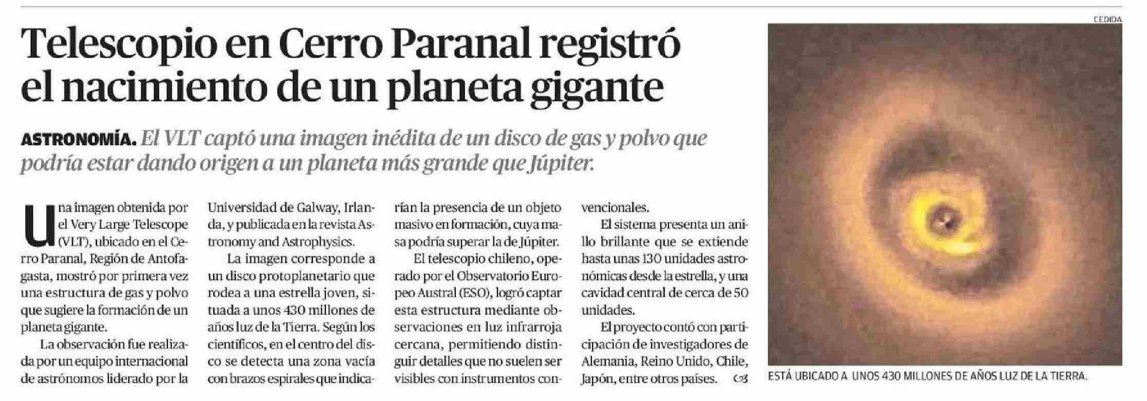Telescopio en Cerro Paranal registró el nacimiento de un planeta gigante 14-06-2025 El Mercurio de Calama |