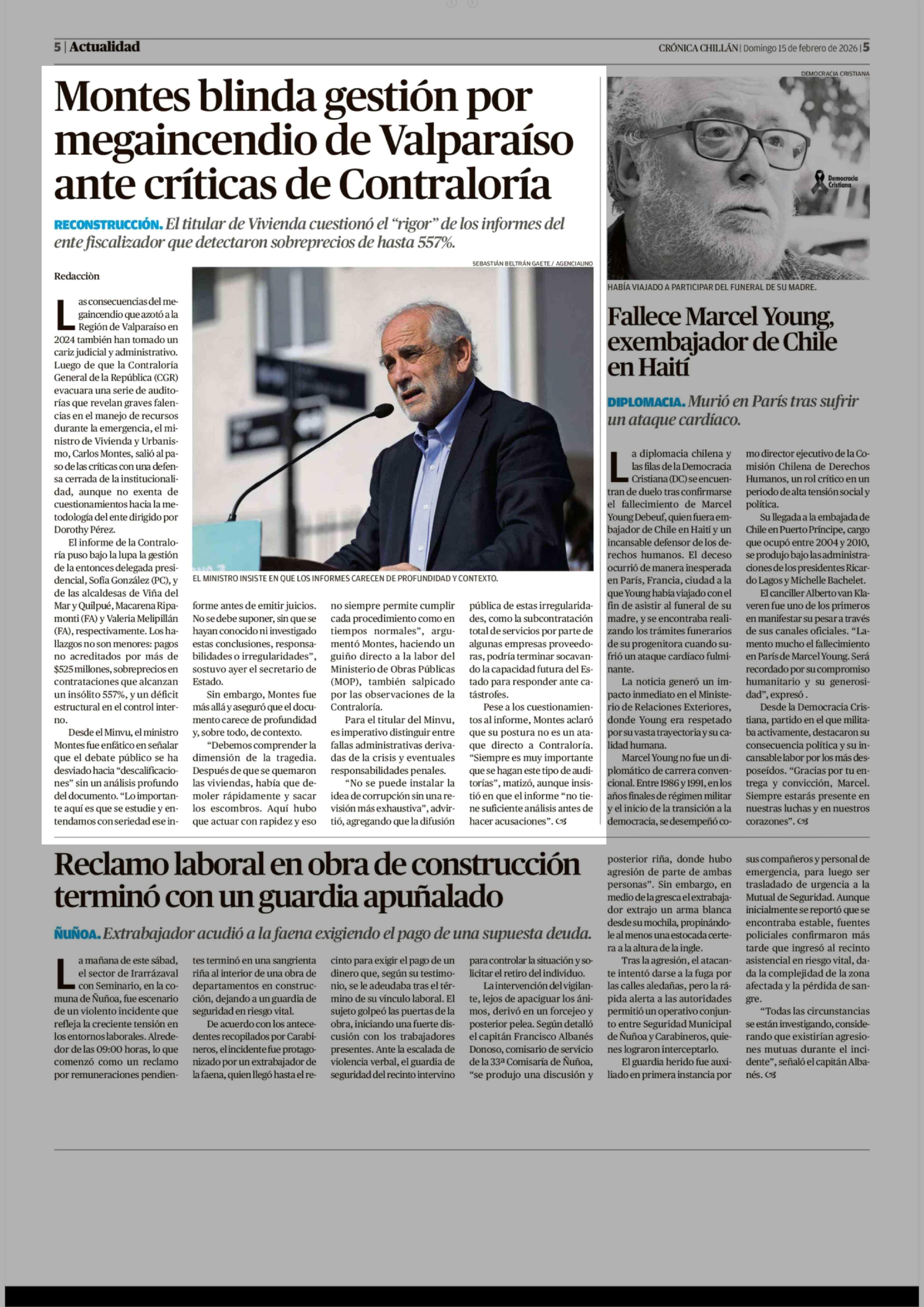Montes blinda gestión por megaincendio de Valparaíso ante críticas de Contraloría 15-02-2026 Crónica de Chillán |