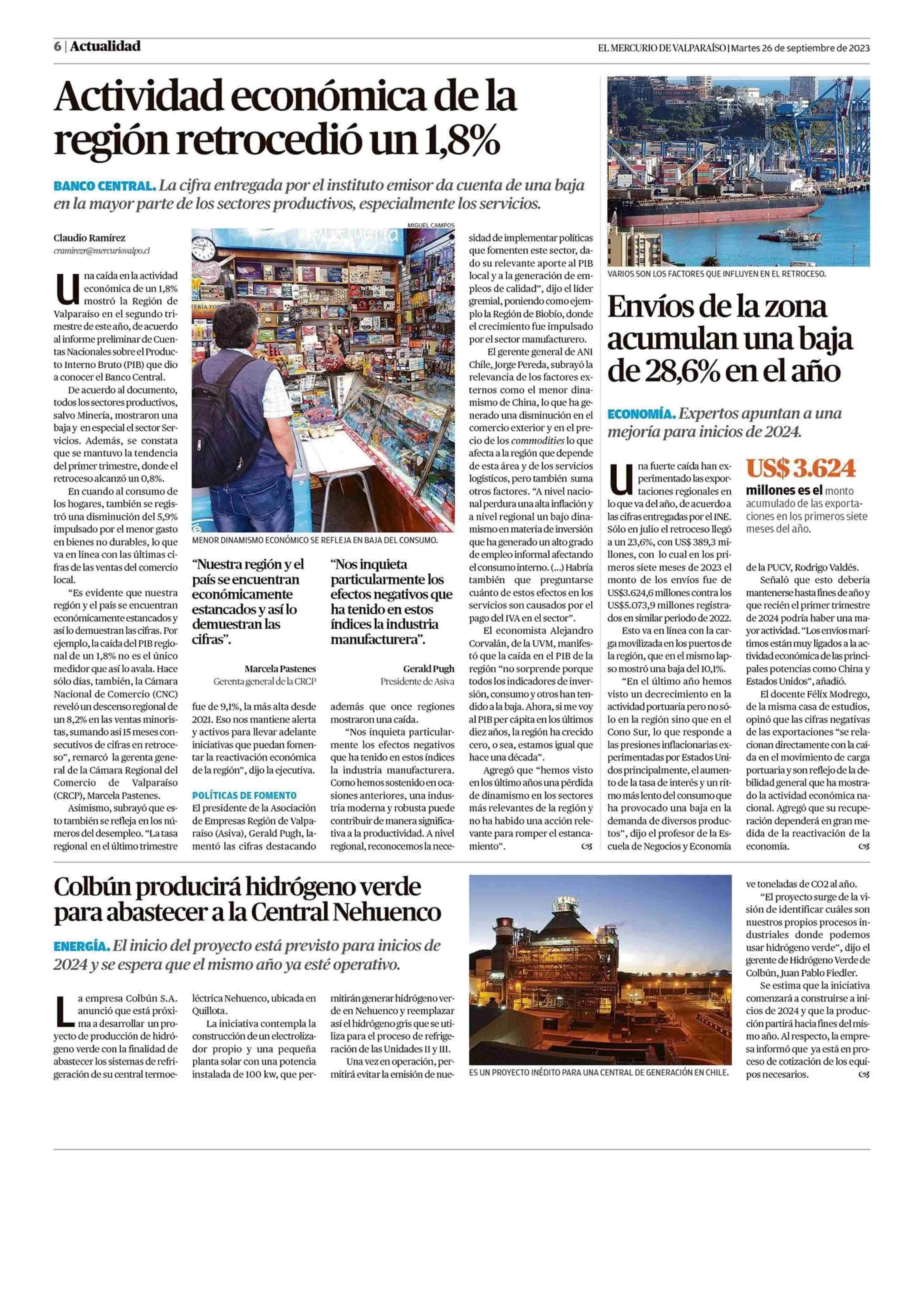 Actividad económica de la región retrocedió un 1,8% 26-09-2023 El Mercurio de Valparaíso |