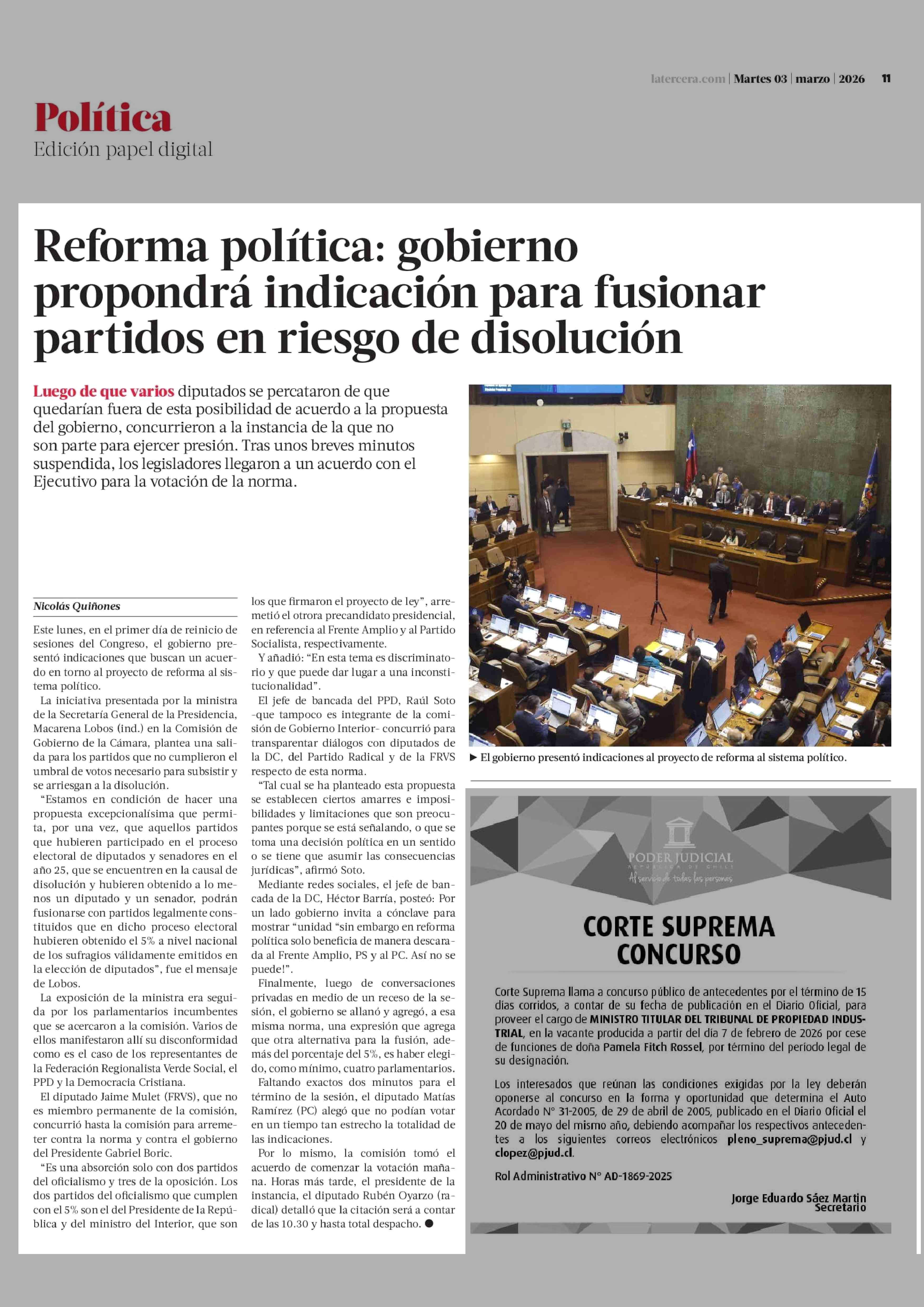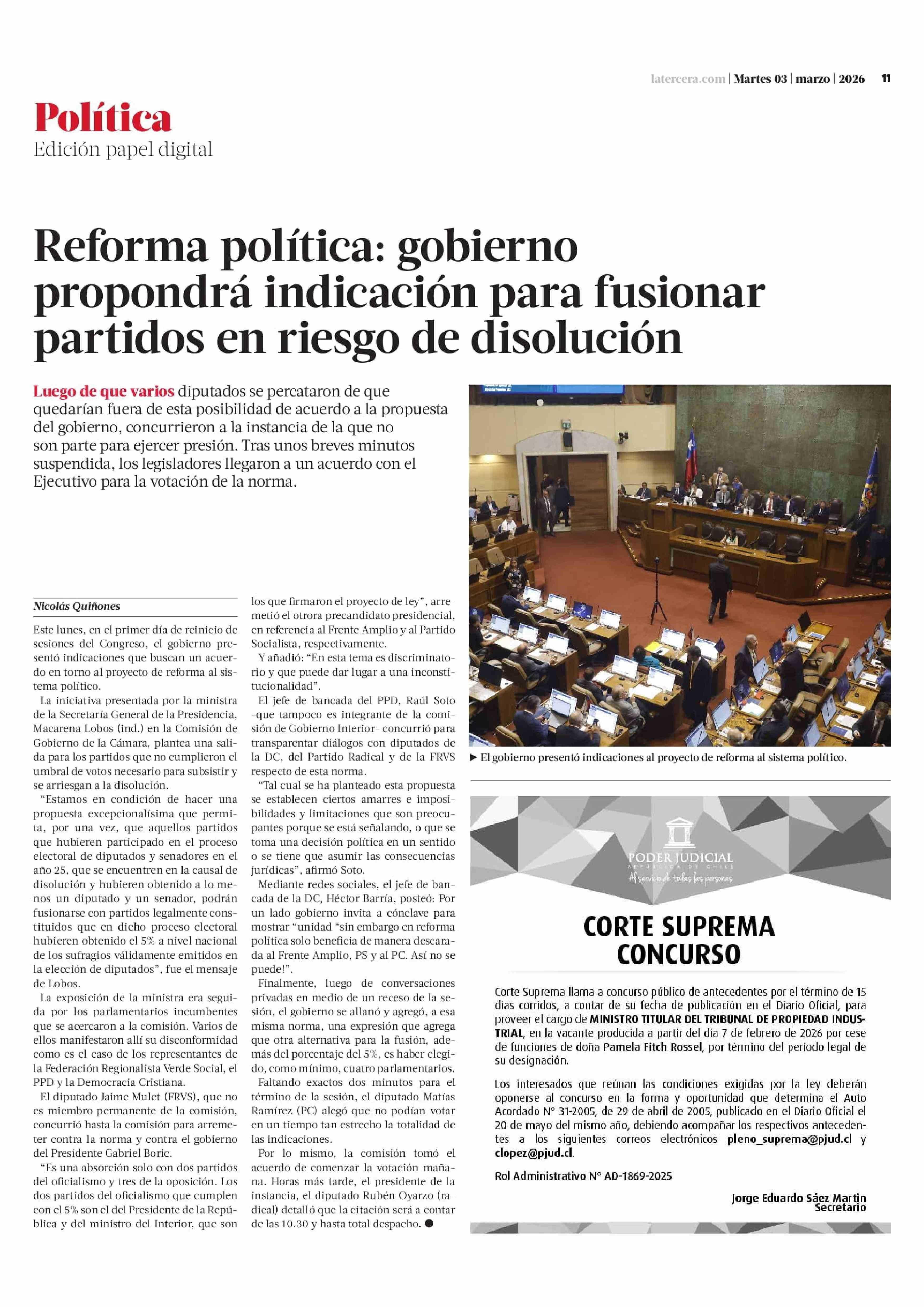 Reforma política: gobierno propondrá indicación para fusionar partidos en riesgo de disolución 03-03-2026 La Tercera |