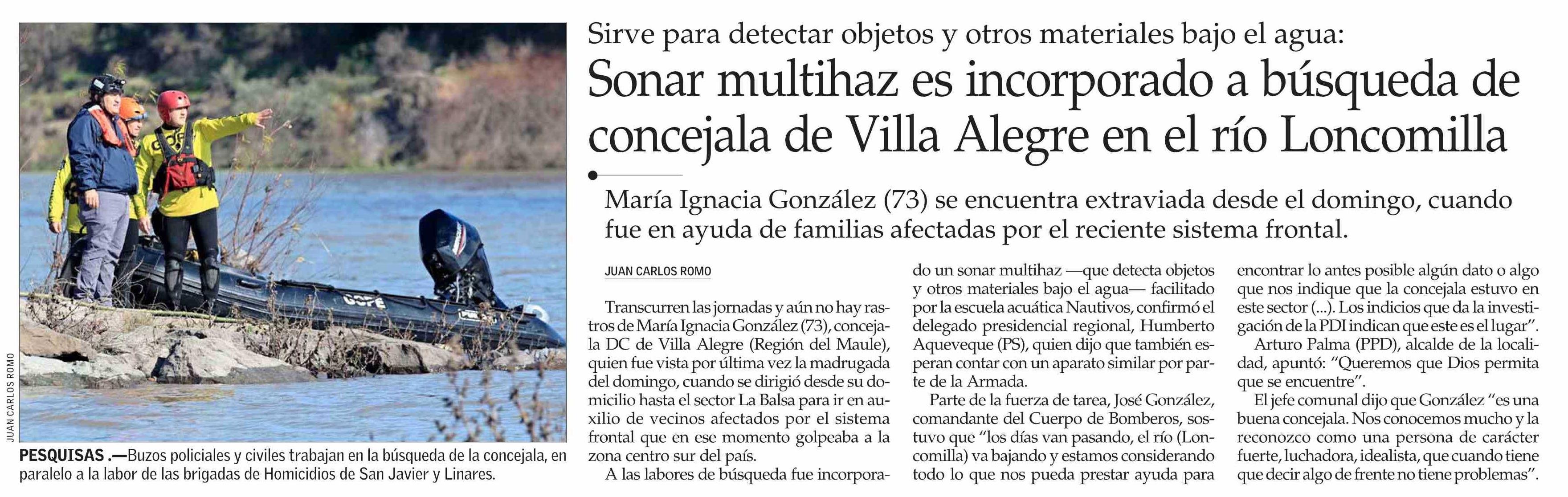 Sonar multihaz es incorporado a búsqueda de concejala de Villa Alegre en el río Loncomilla 20-06-2025 El Mercurio |