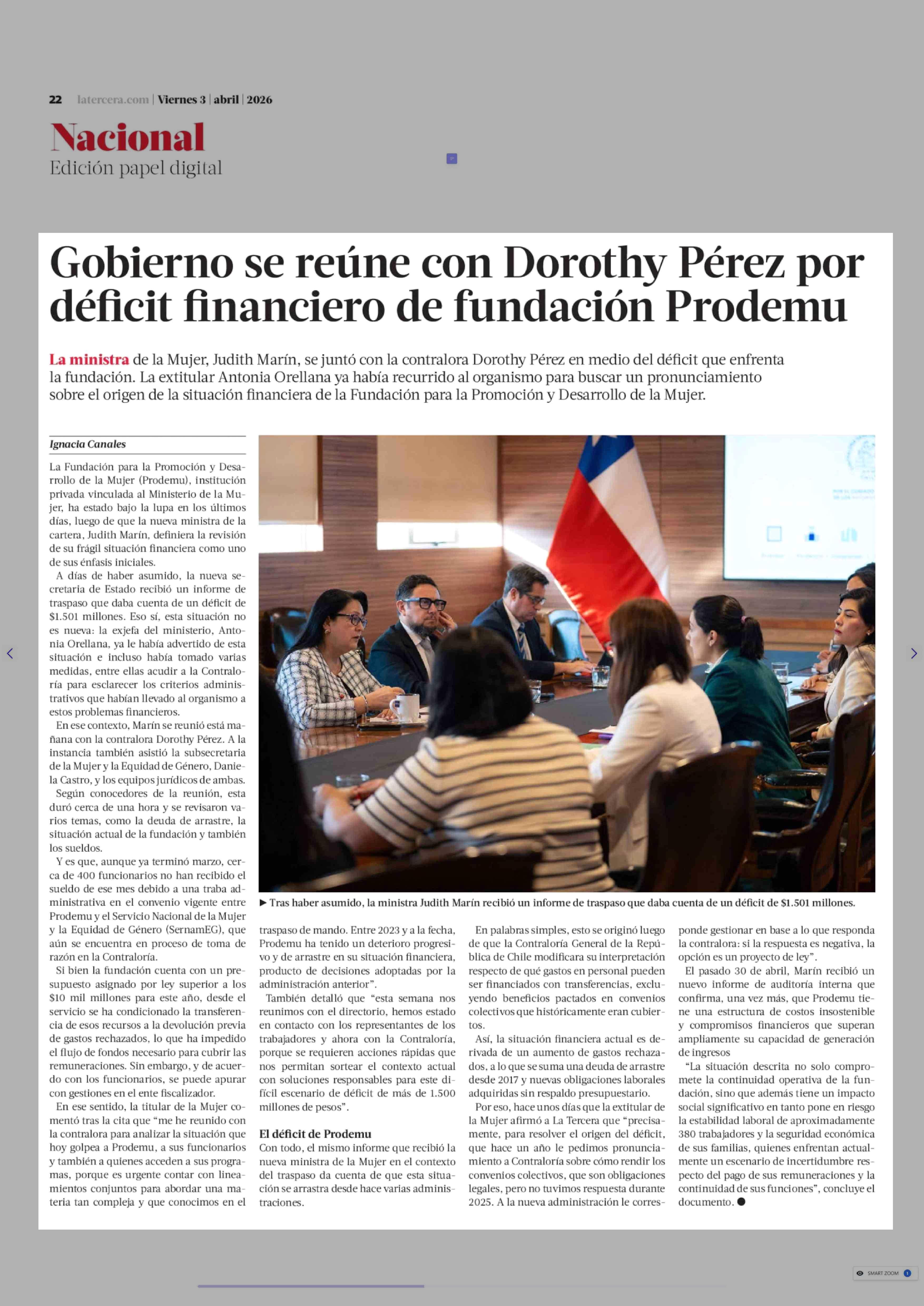 Gobierno se reúne con Dorothy Pérez por déficit financiero de fundación Prodemu 03-04-2026 La Tercera |