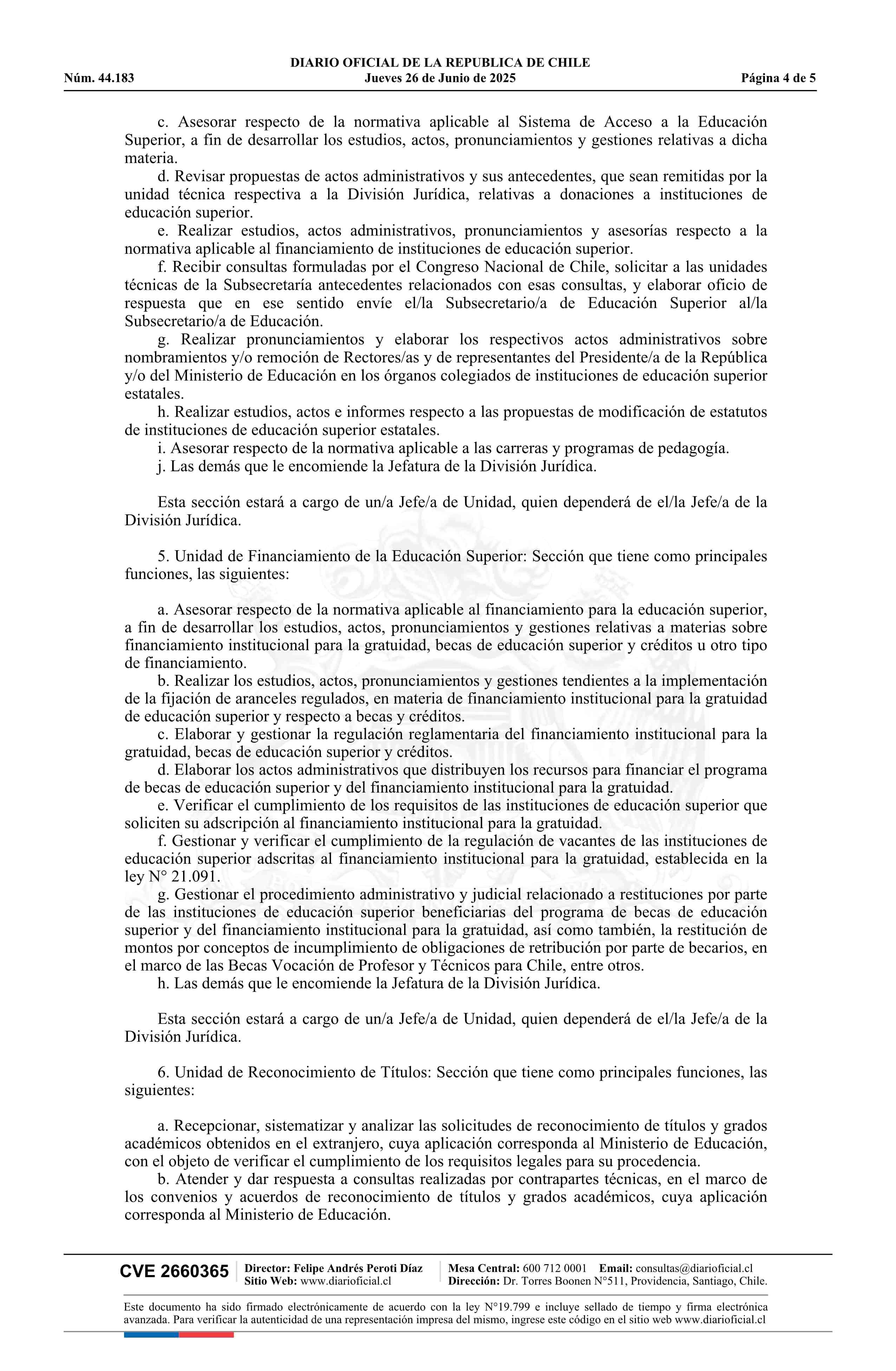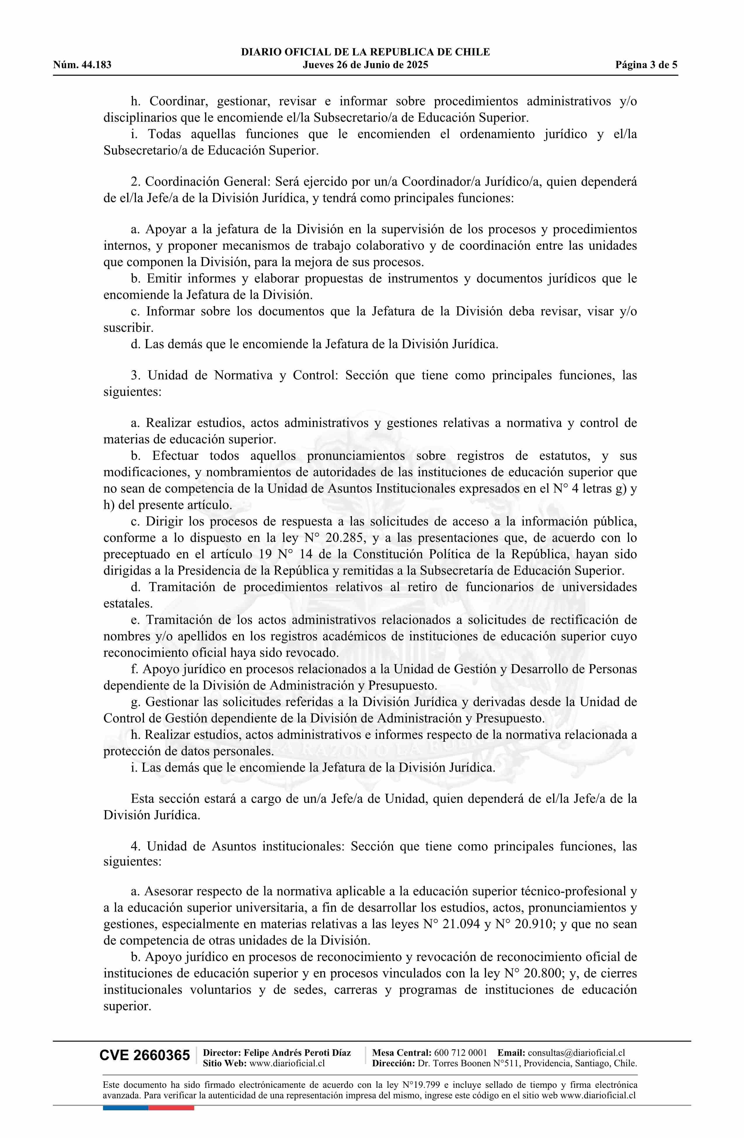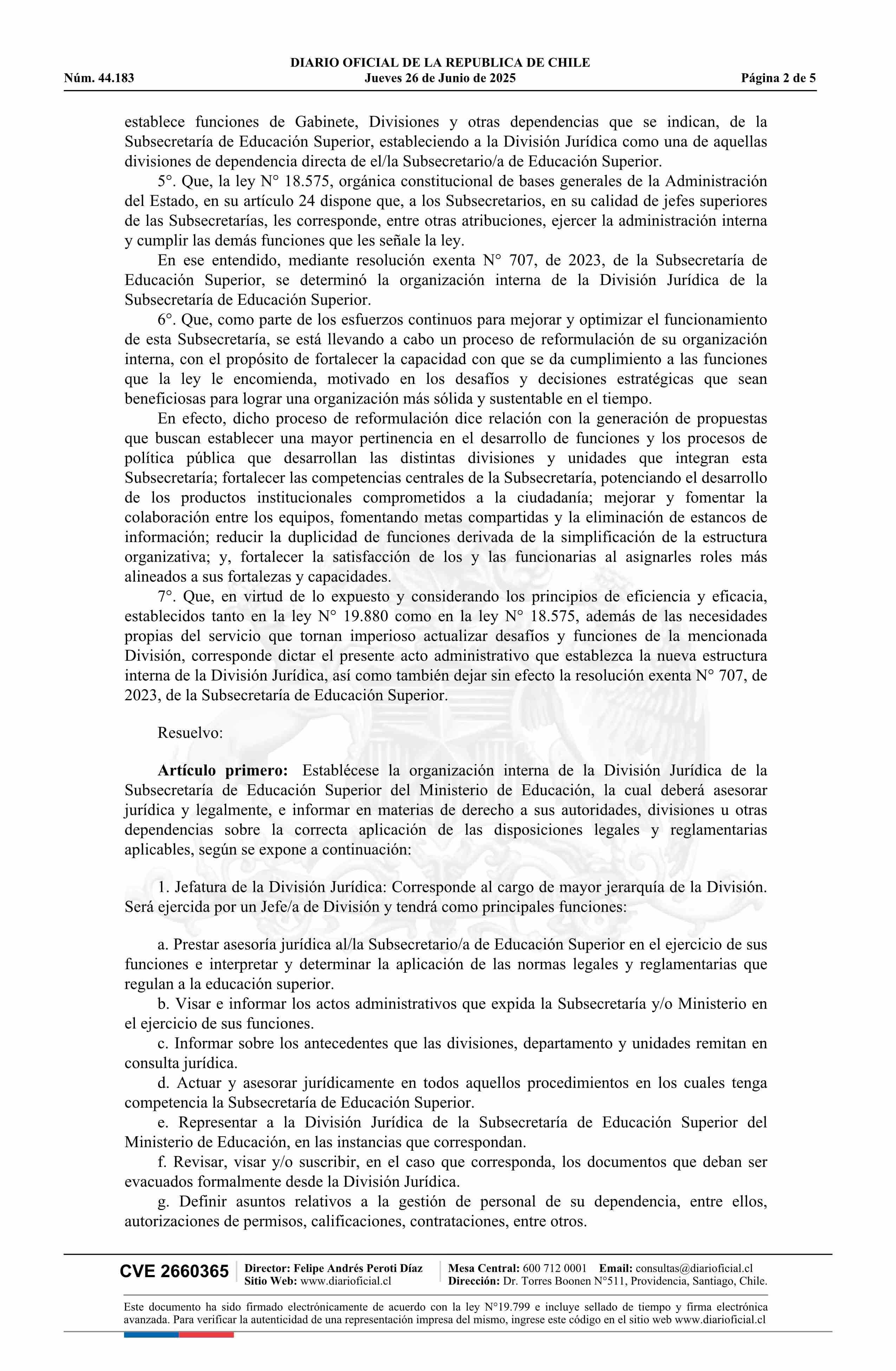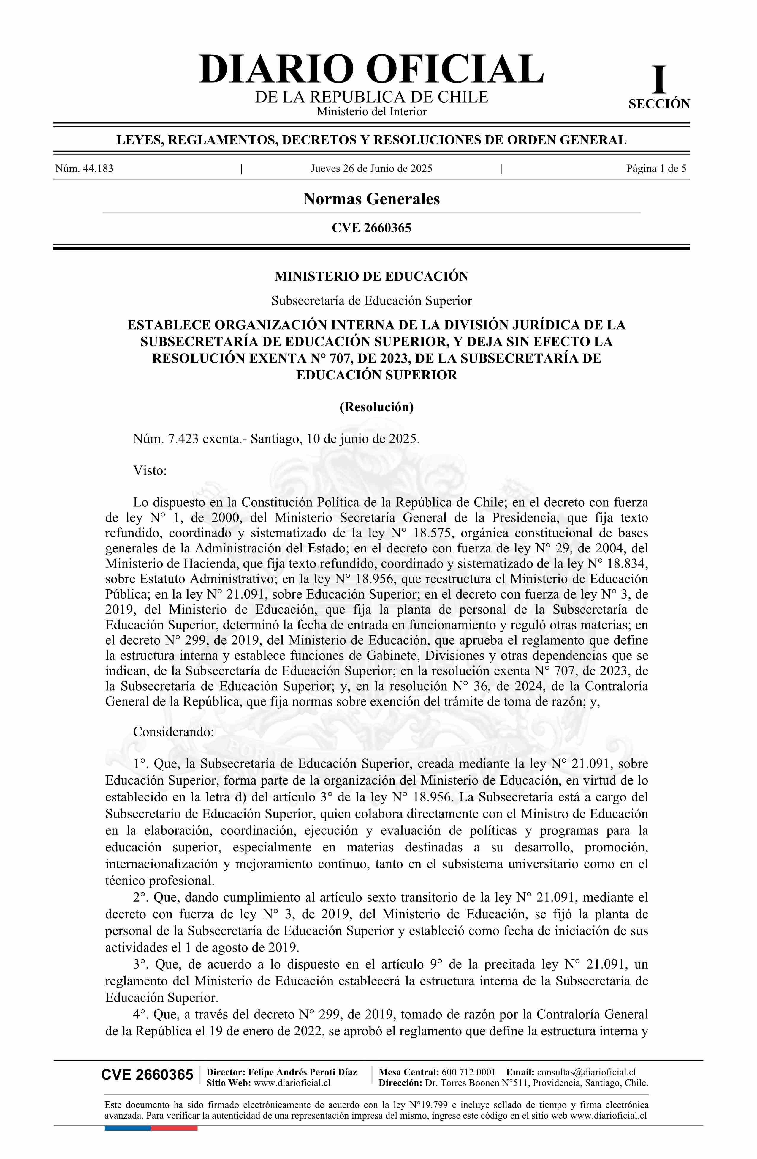 | Título: | Resolución exenta número 7.423, de 2025.- Establece organización interna de la División Jurídica de la Subsecretaría de Educación Superior y deja sin efecto la resolución N° 707 exenta, de 2023 |