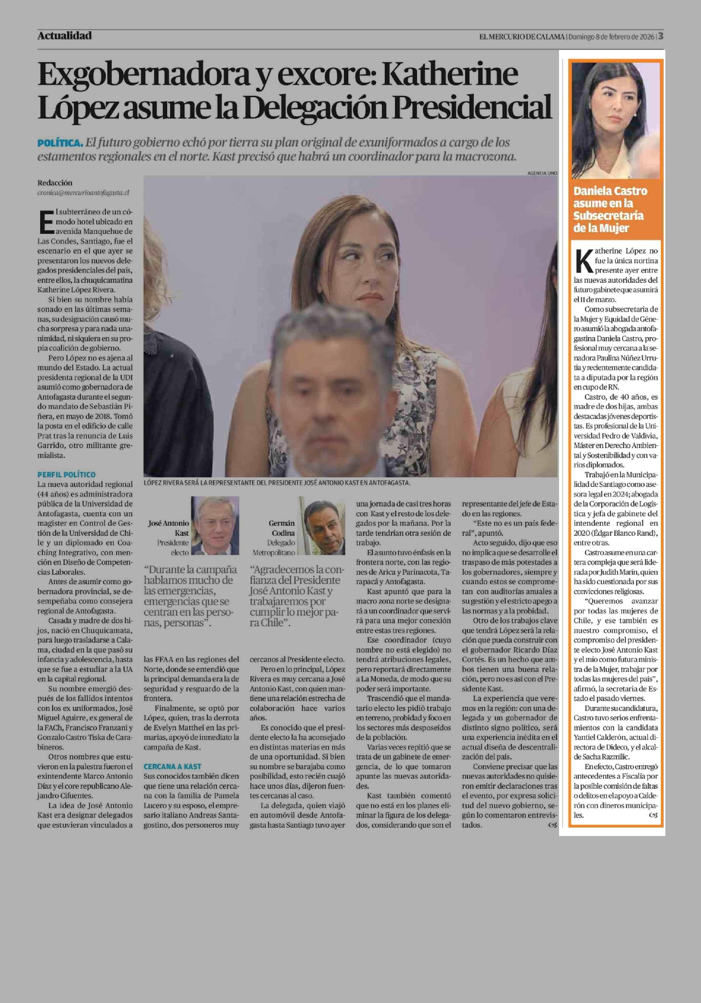 Daniela Castro asume en la Subsecretaría de la Mujer 08-02-2026 El Mercurio de Calama |