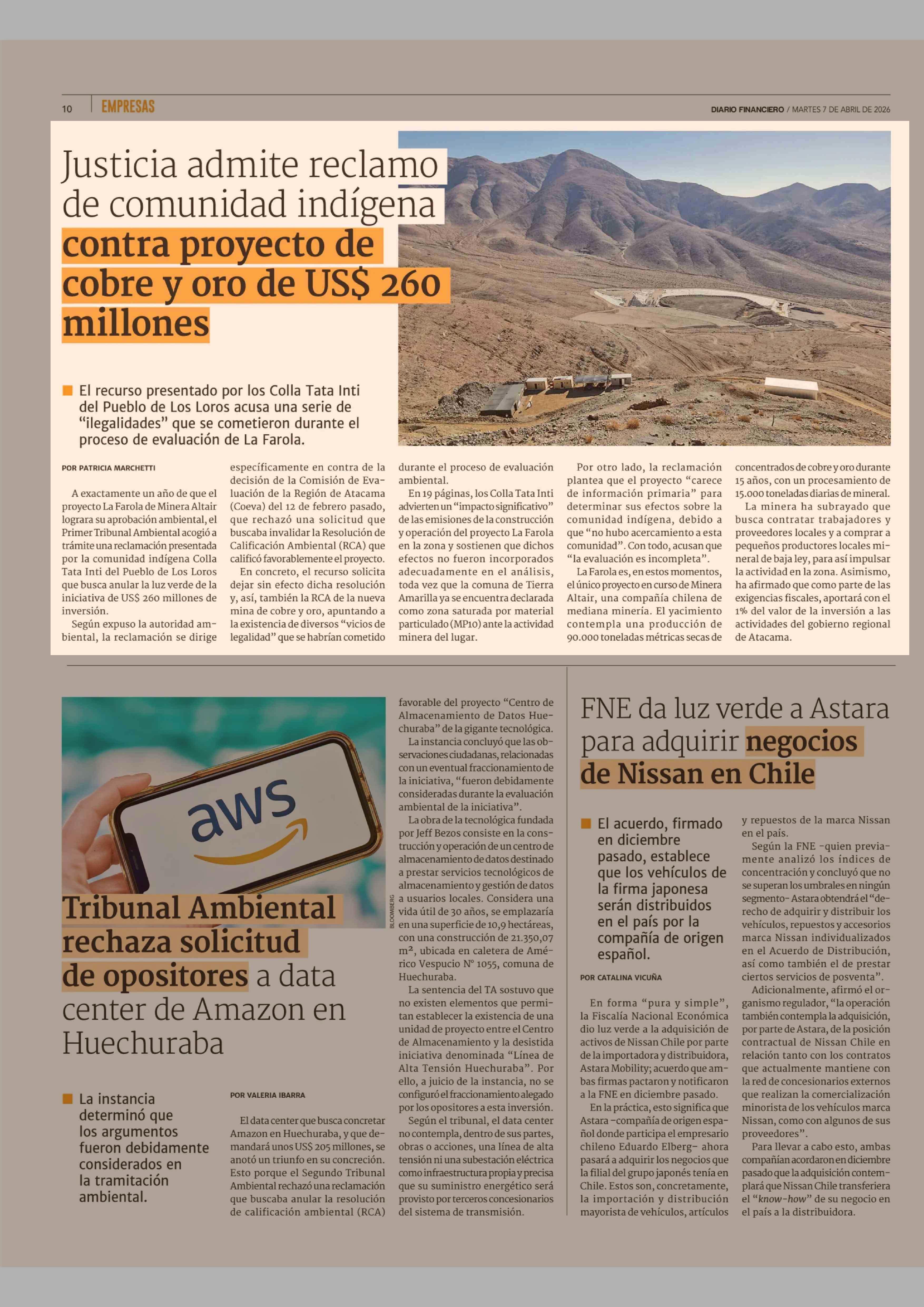 Justicia admite reclamo de comunidad indígena contra proyecto de cobre y oro de US$ 260 millones 07-04-2026 Diario Financiero |