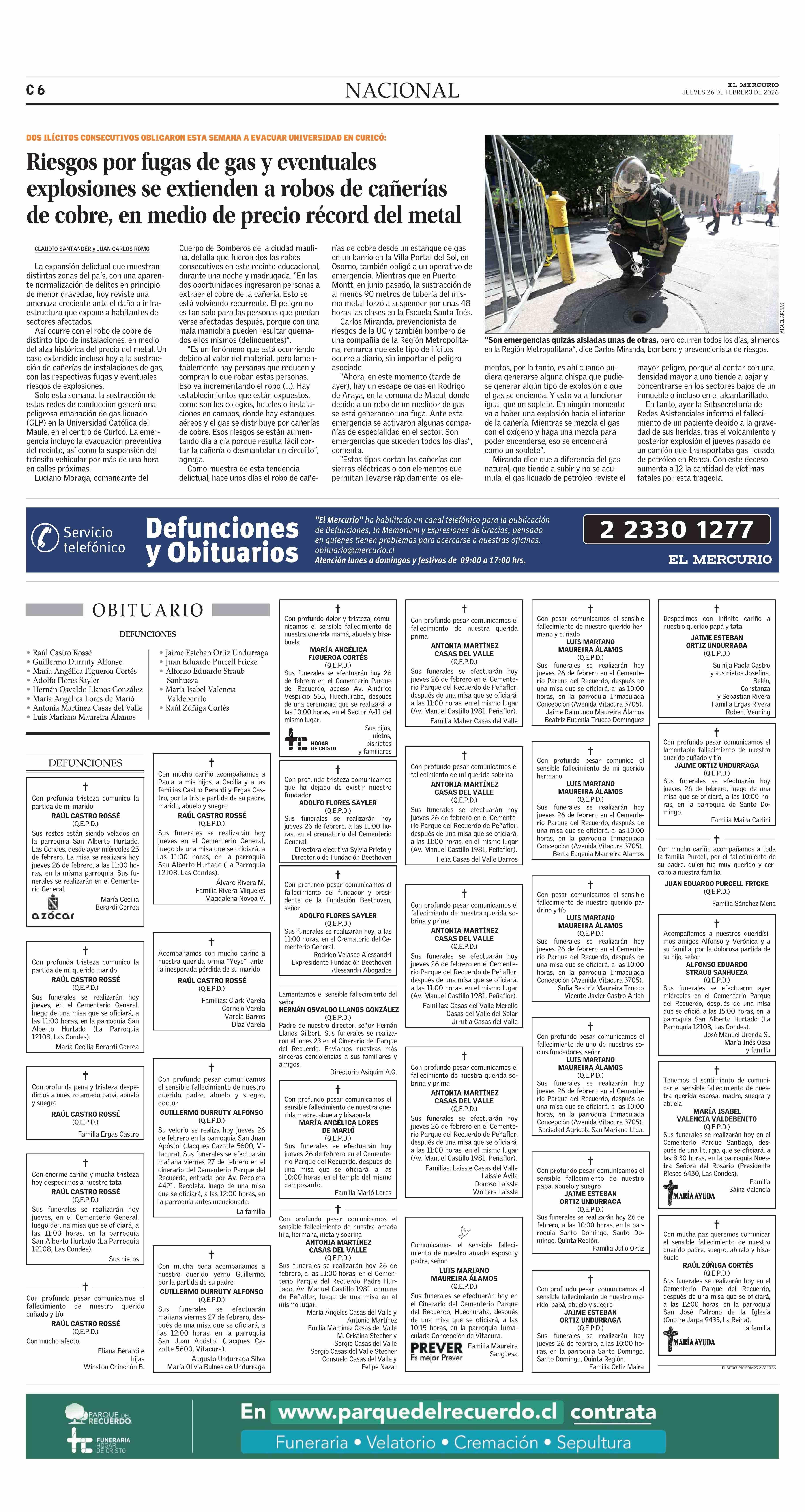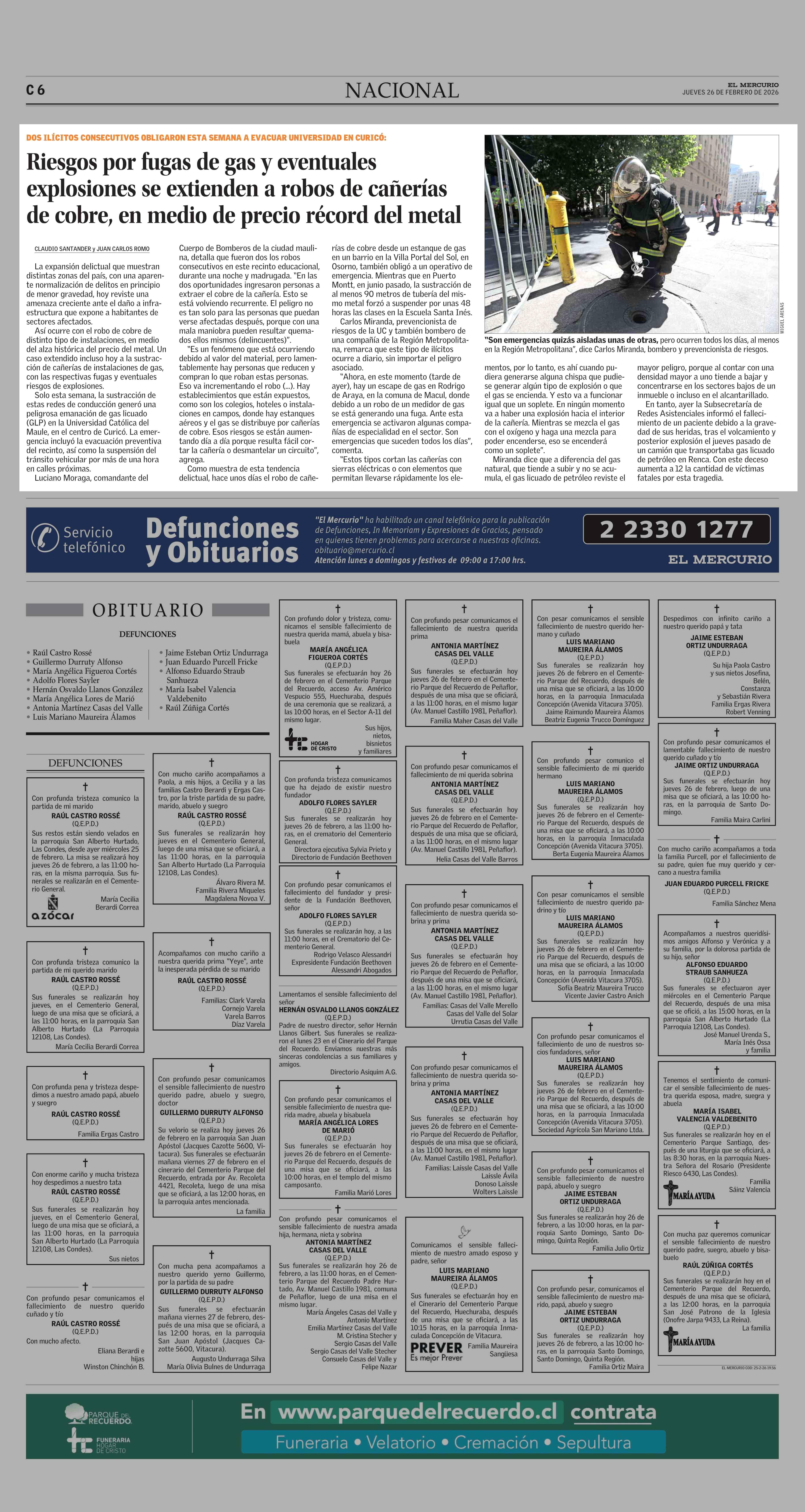 Riesgos por fugas de gas y eventuales explosiones se extienden a robos de cañerías de cobre, en medio de precio récord del metal 26-02-2026 El Mercurio |