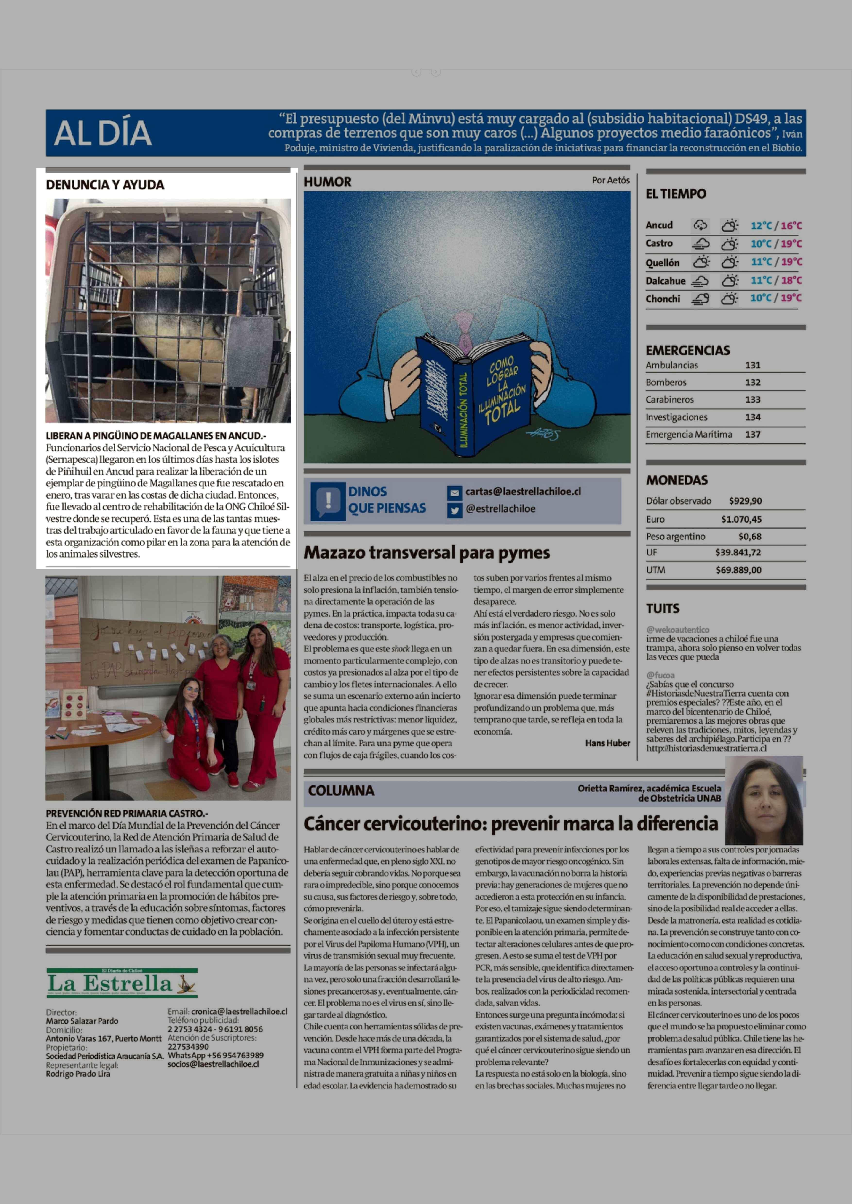 | Título: | LIBERAN A PINGÜINO DE MAGALLANES EN ANCUD .Funcionarios del Servicio Nacional de Pesca y Acuicultura (Sernapesca) llegaron en los últimos días hasta los islotes de Piñihuil en Ancud para realizar la liberación de un ejemplar de pingüino de Magallanes que fue rescatado en enero, tras varar en las cos |