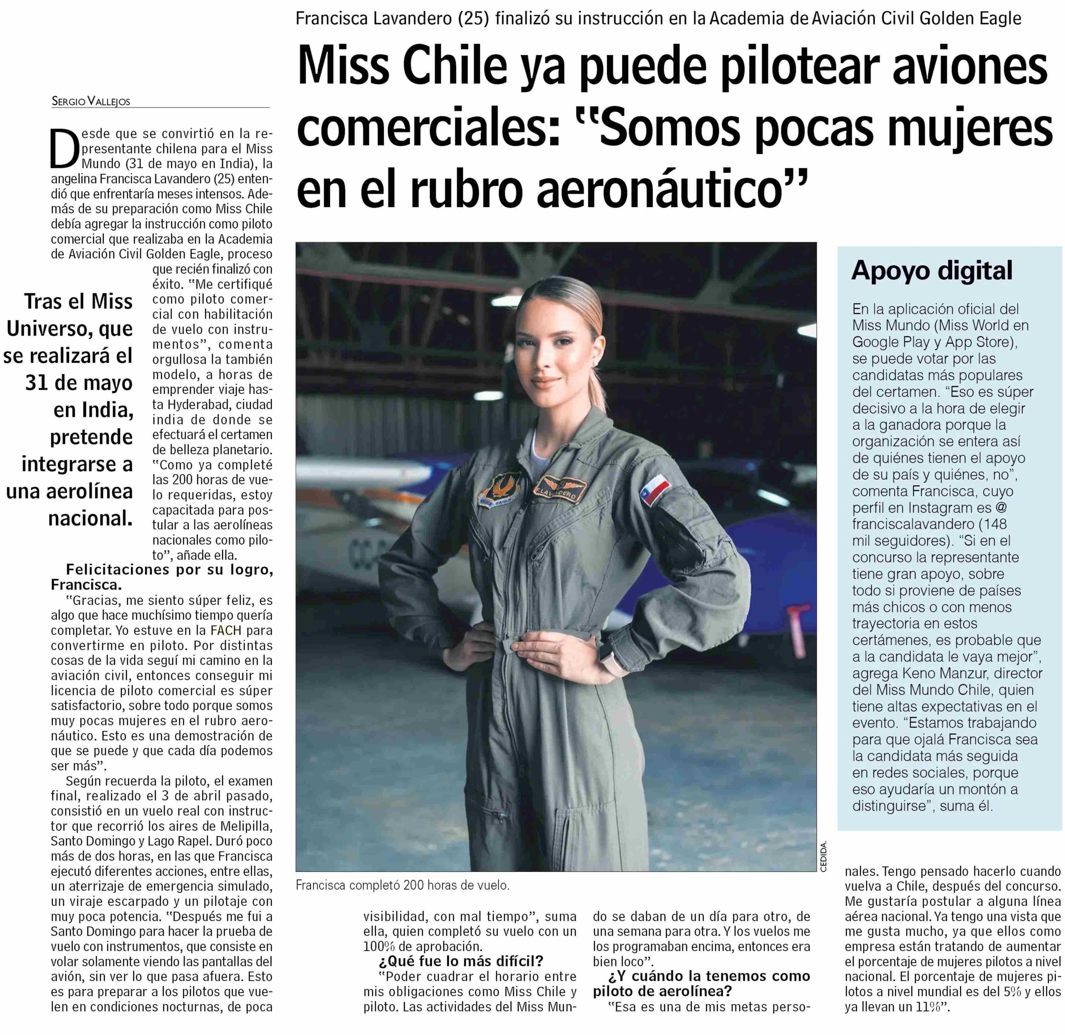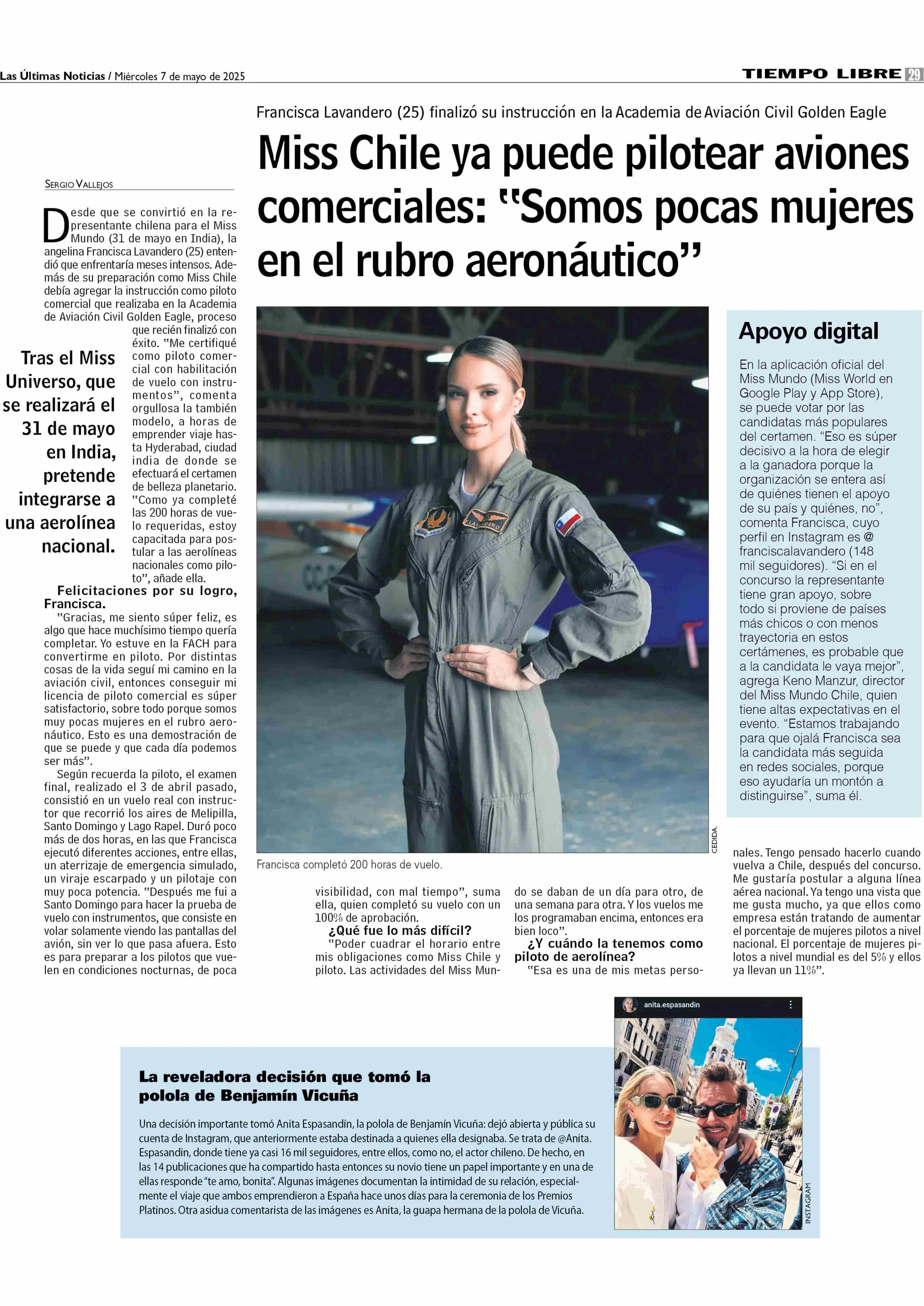 Miss Chile ya puede pilotear aviones comerciales: "Somos pocas mujeres en el rubro aeronáutico" 07-05-2025 Las Últimas Noticias |