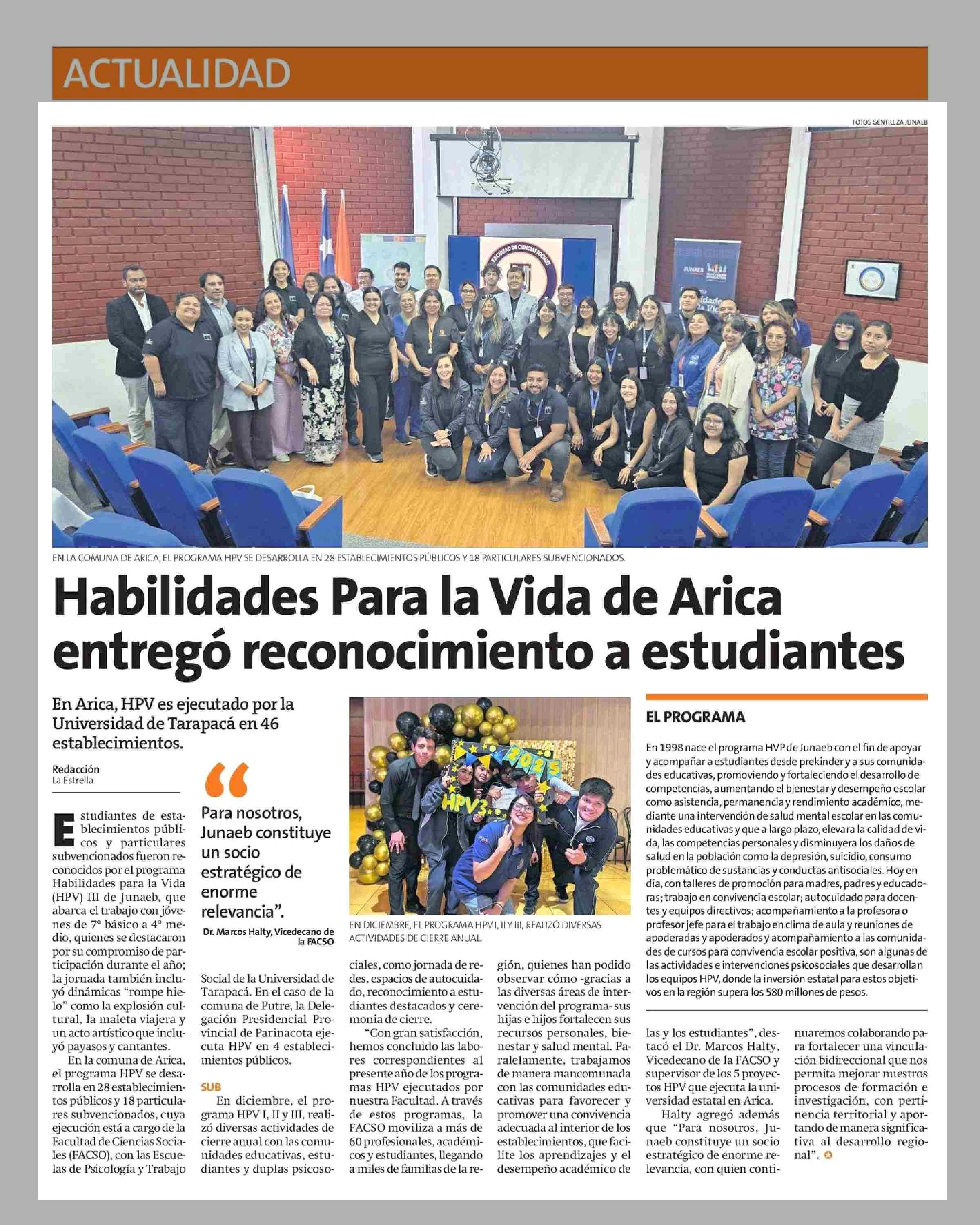 Habilidades Para la Vida de Arica entrego reconocimiento a estudiantes 06-01-2026 La Estrella de Arica |