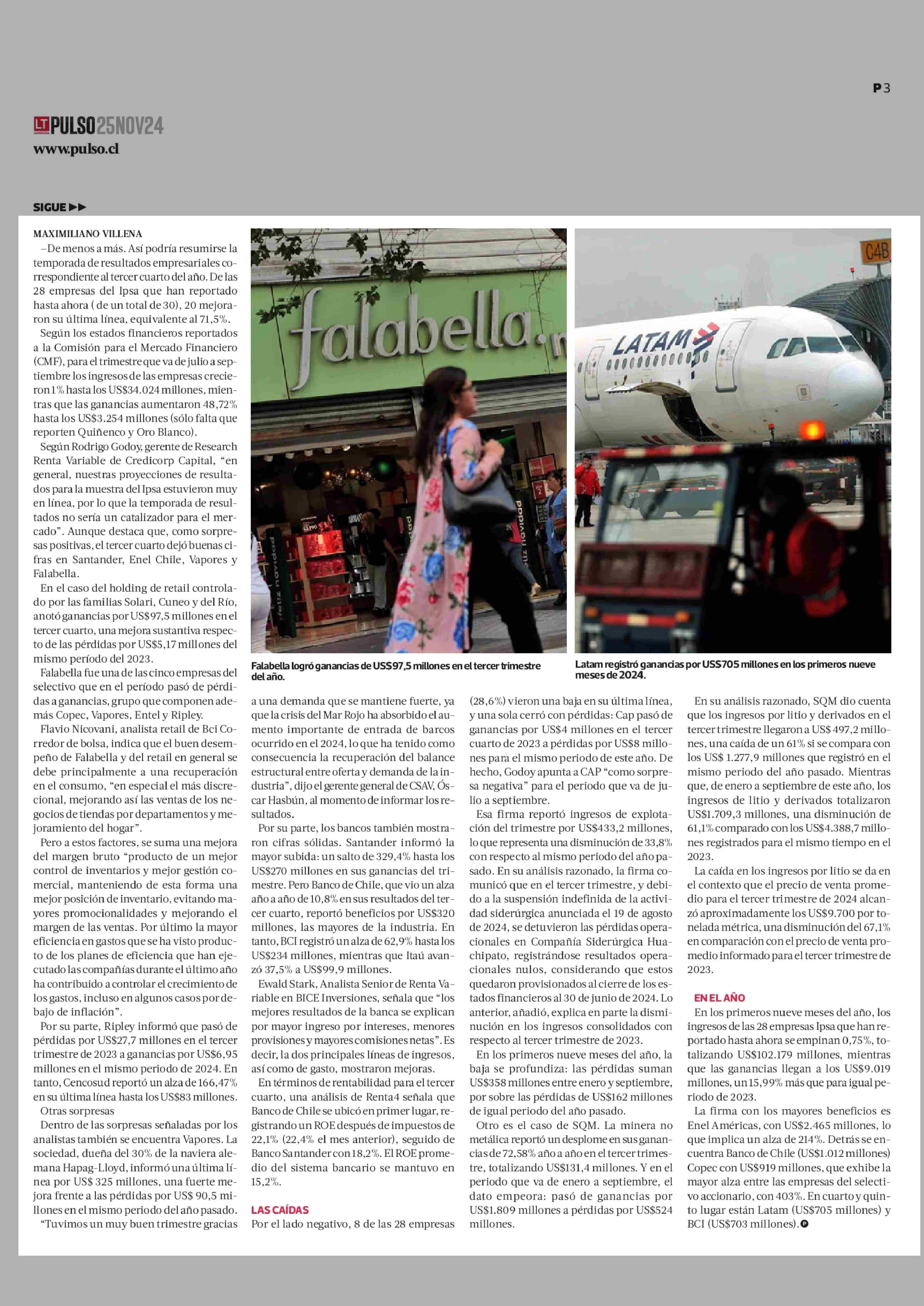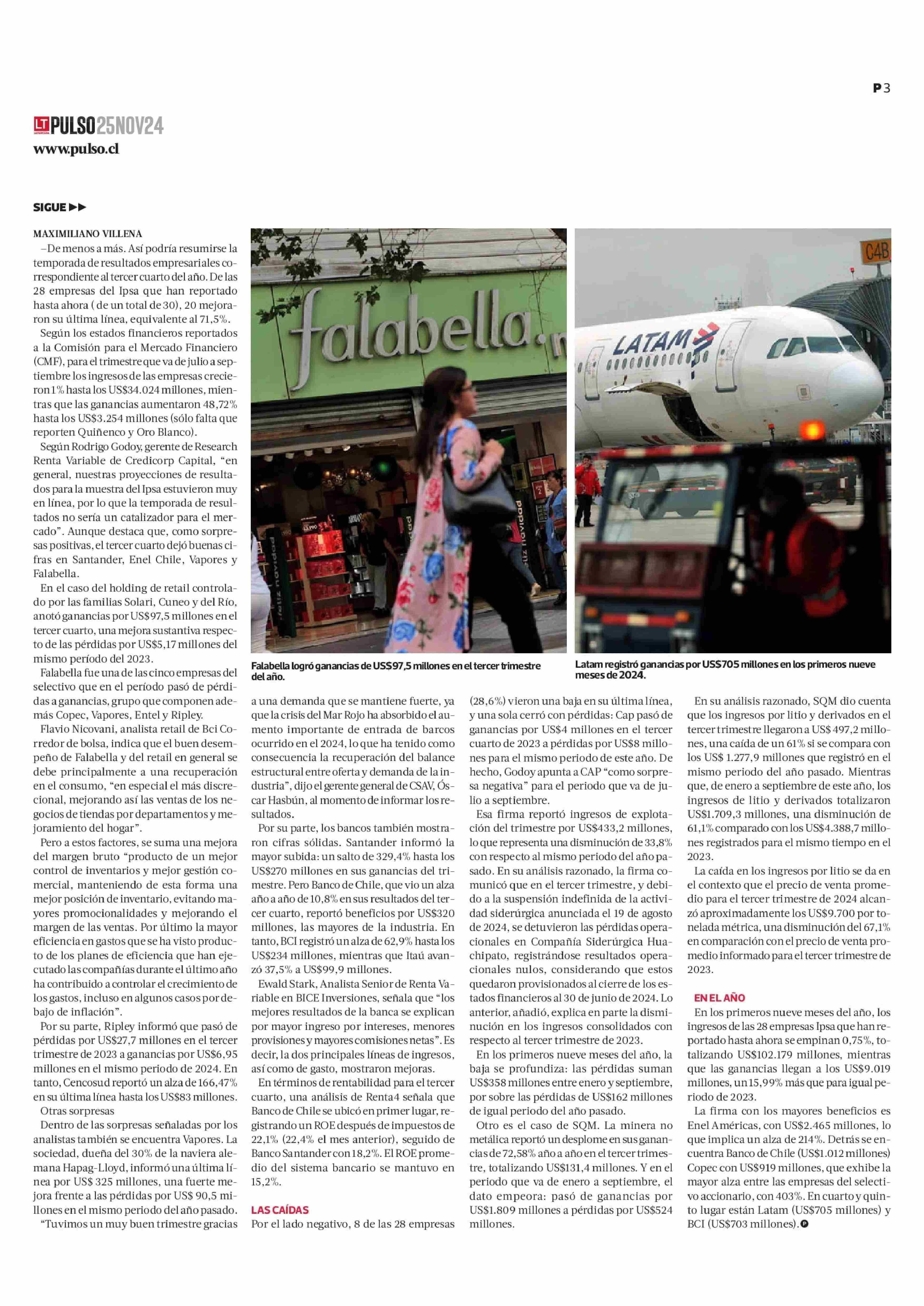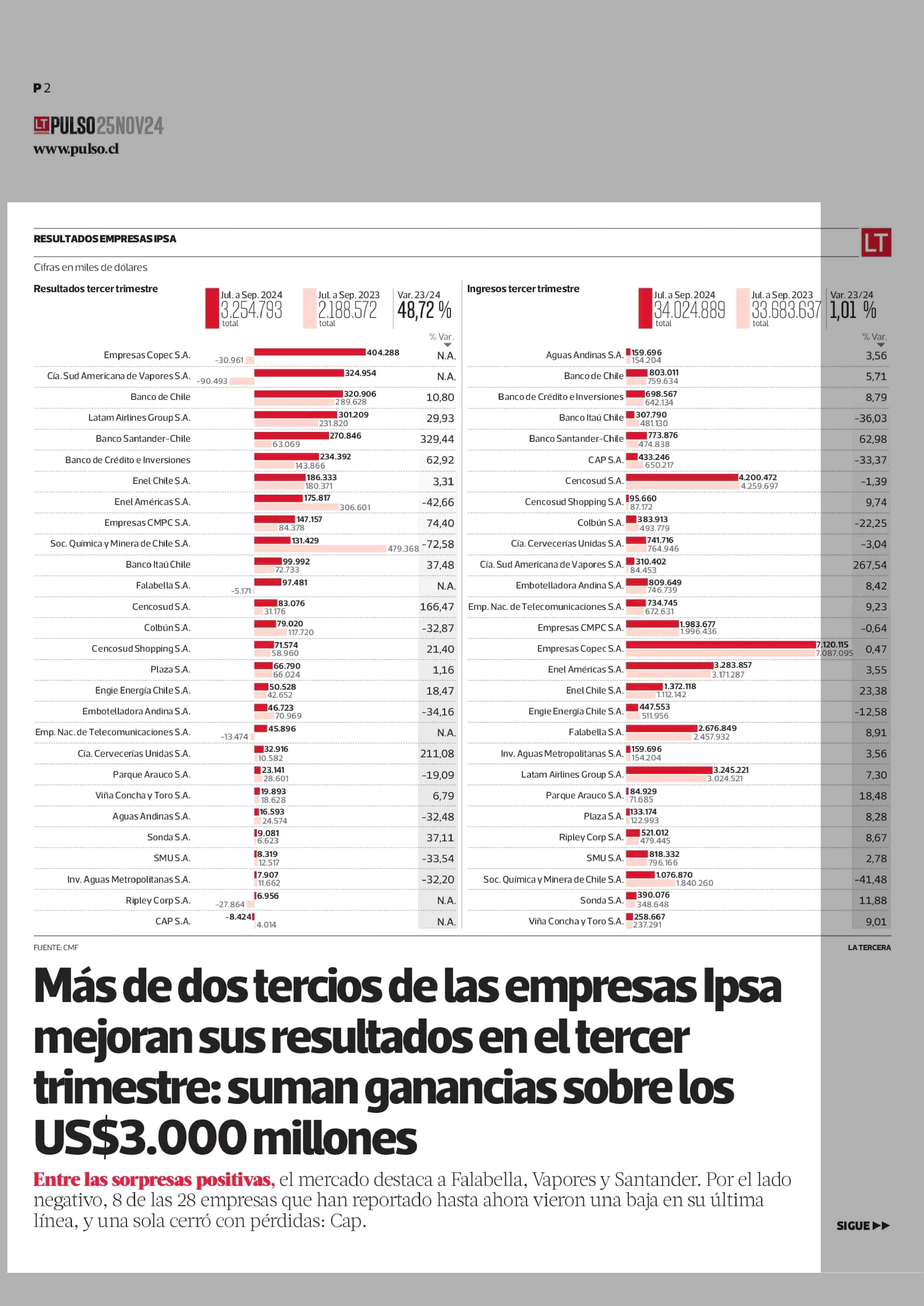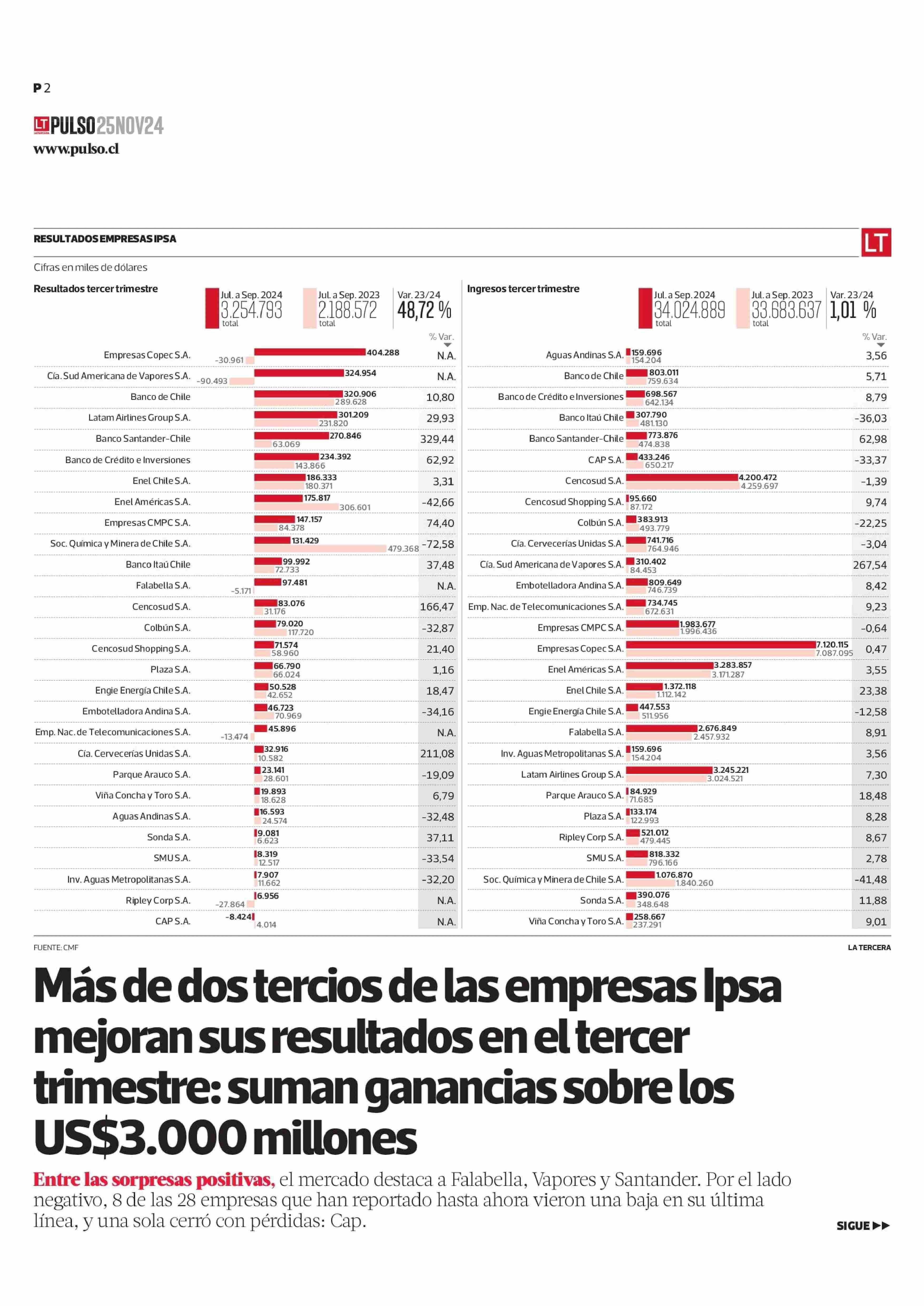 Más de dos tercios de las empresas Ipsa mejoran sus resultados en el tercer trimestre: suman ganancias sobre los US$3.000 millones 25-11-2024 La Tercera |