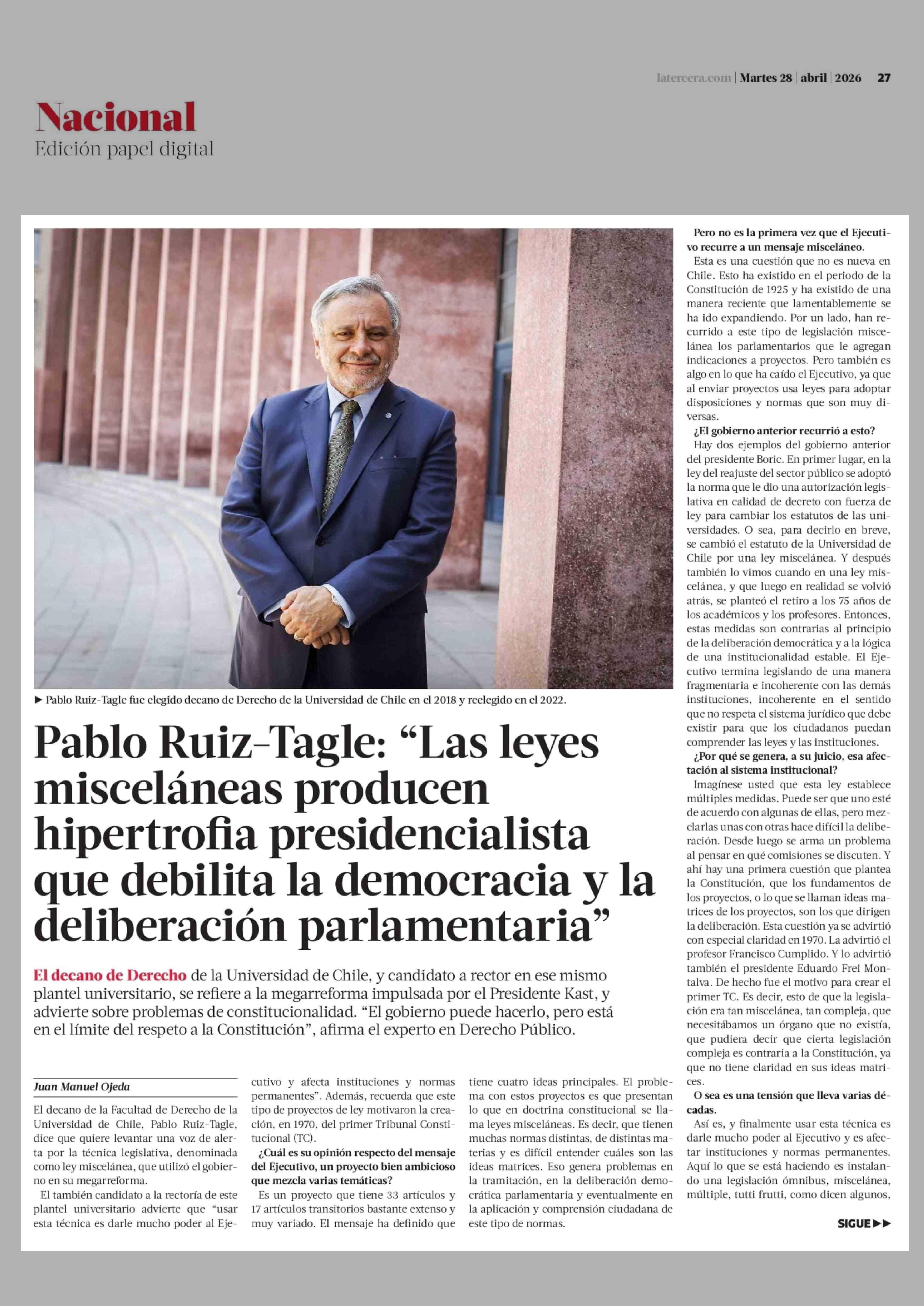 Título: Pablo Ruiz-Tagle: "Las leyes misceláneas producen hipertrofia presidencialista que debilita la democracia y la deliberación parlamentaria"