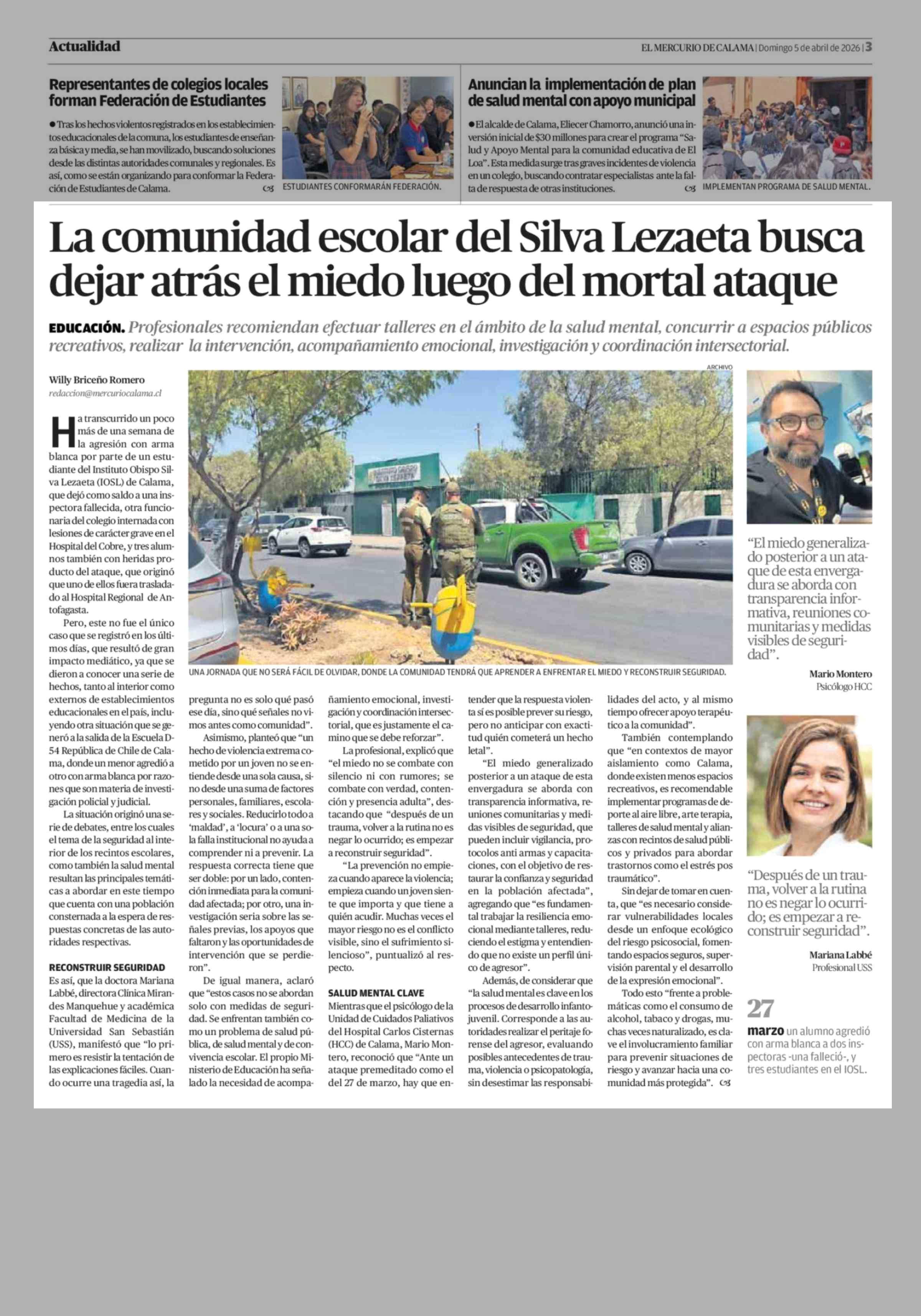 La comunidad escolar del Silva Lezaeta busca dejar atrás el miedo luego del mortal ataque 05-04-2026 El Mercurio de Calama |