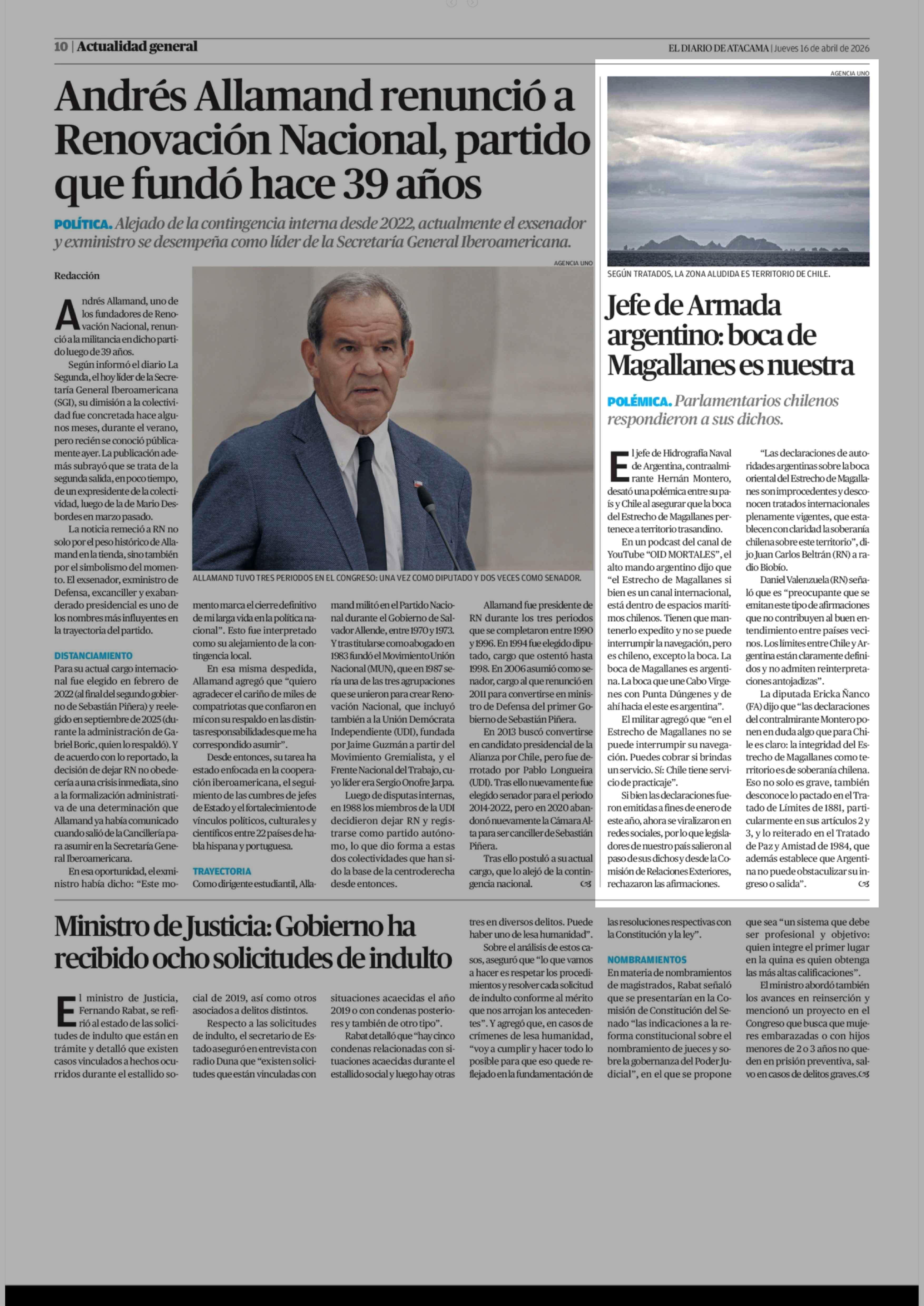 Jefe de Armada argentino: boca de Magallanes es nuestra 16-04-2026 El Diario de Atacama |