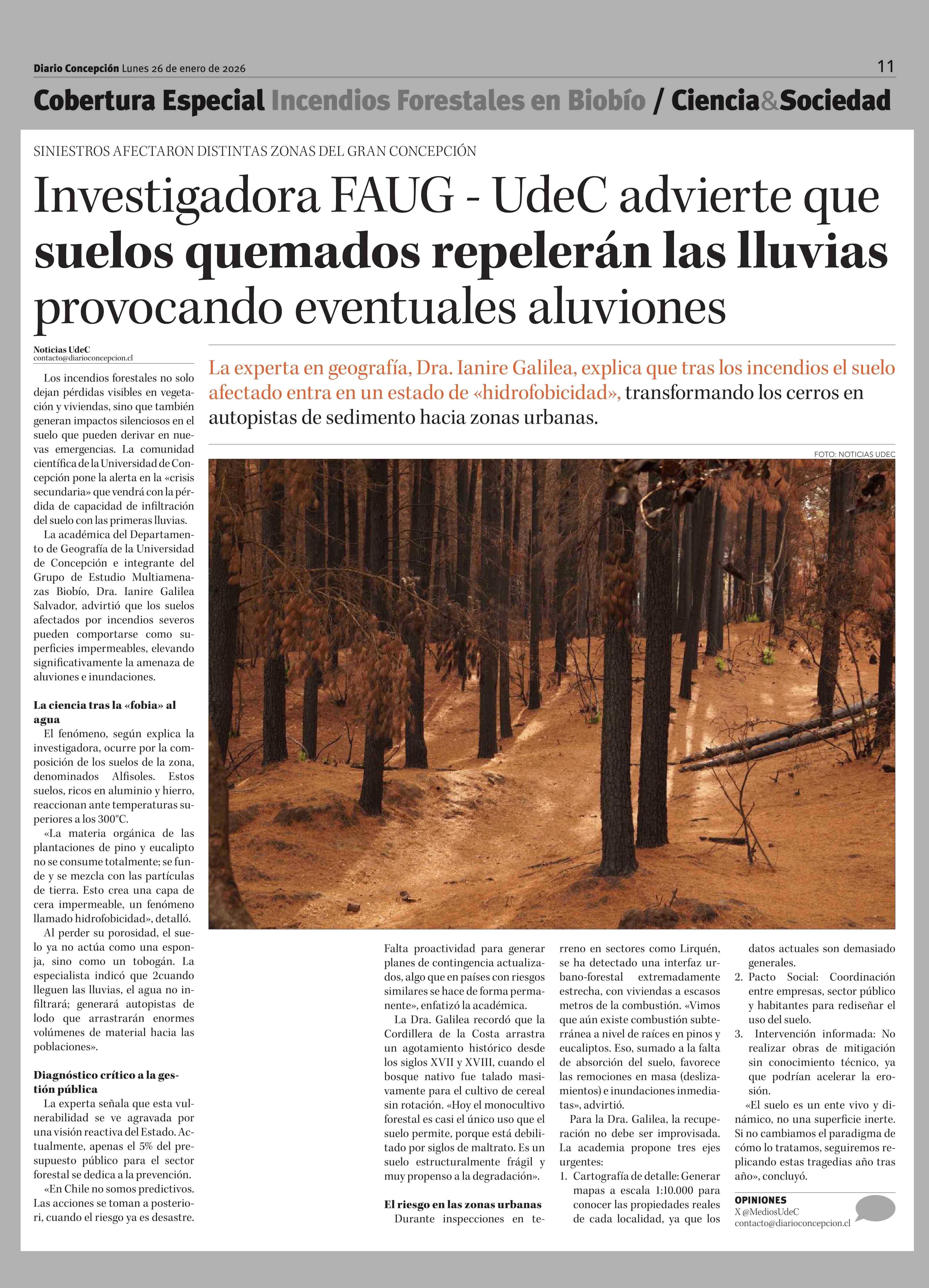 Título: Investigadora FAUG - UdeC advierte que suelos quemados repelerán las lluvias provocando eventuales aluviones