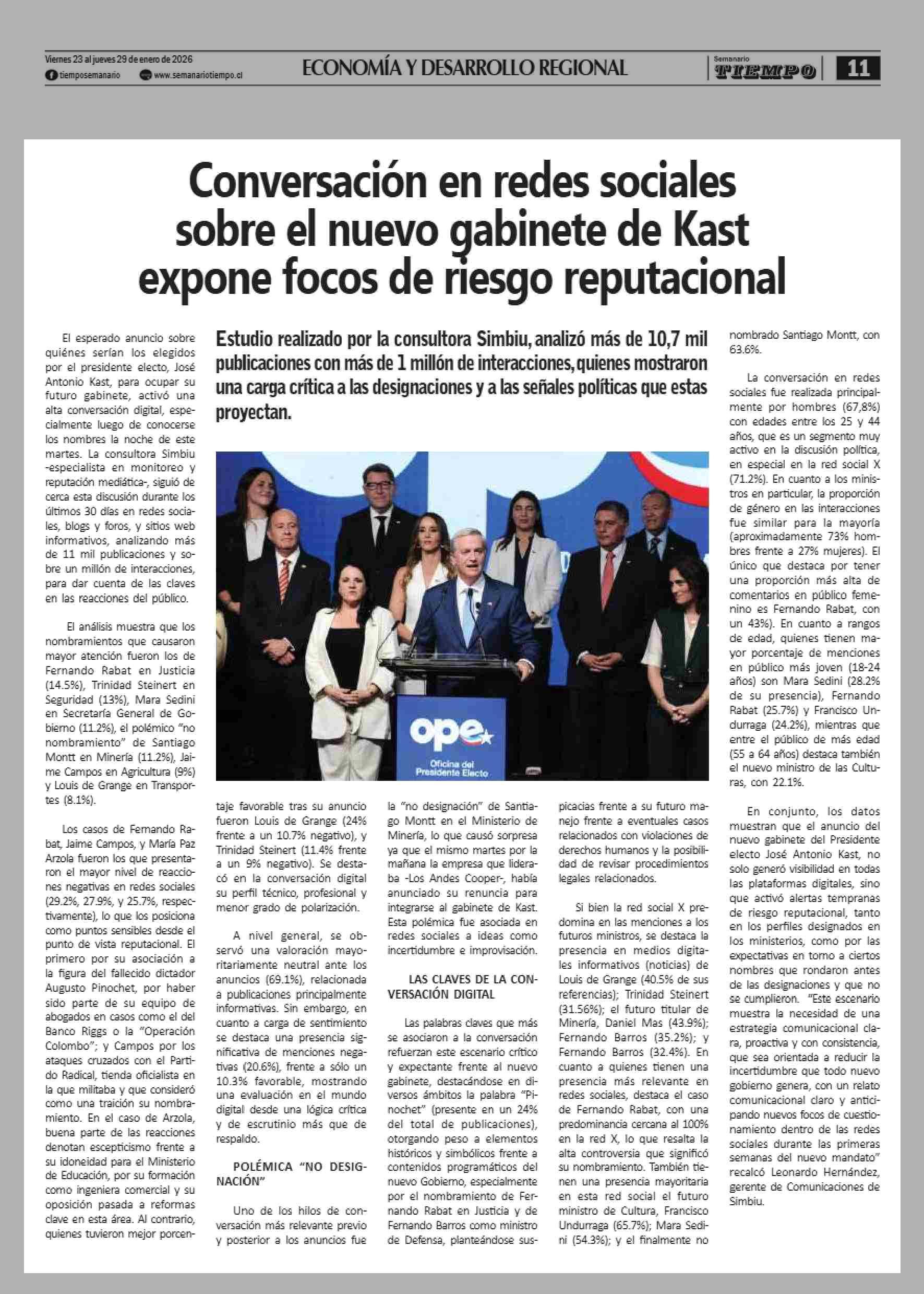 Conversación en redes sociales sobre el nuevo gabinete de Kast expone focos de riesgo reputacional 23-01-2026 Semanario Tiempo |