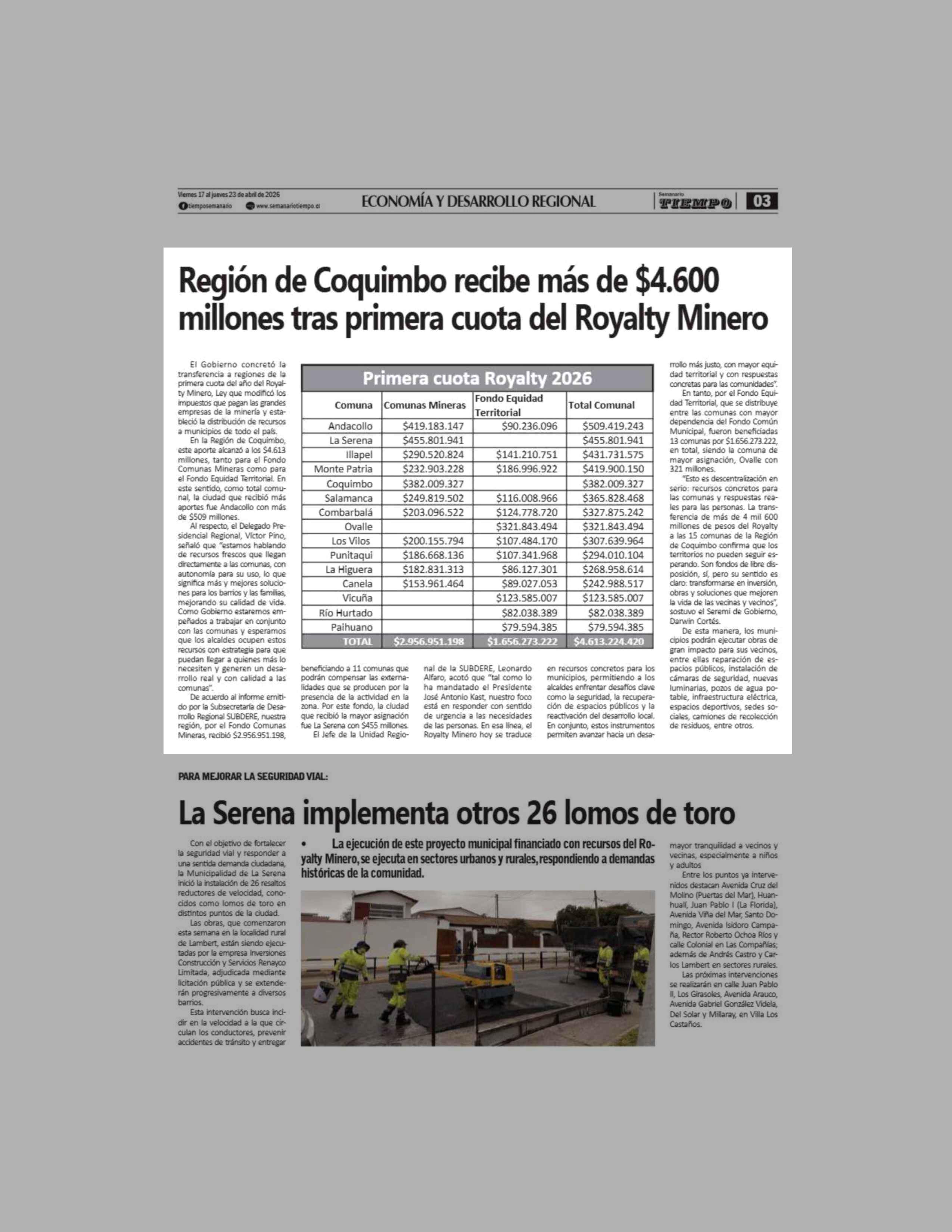 Título: Región de Coquimbo recibe más de $4.600 millones tras primera cuota del Royalty Minero