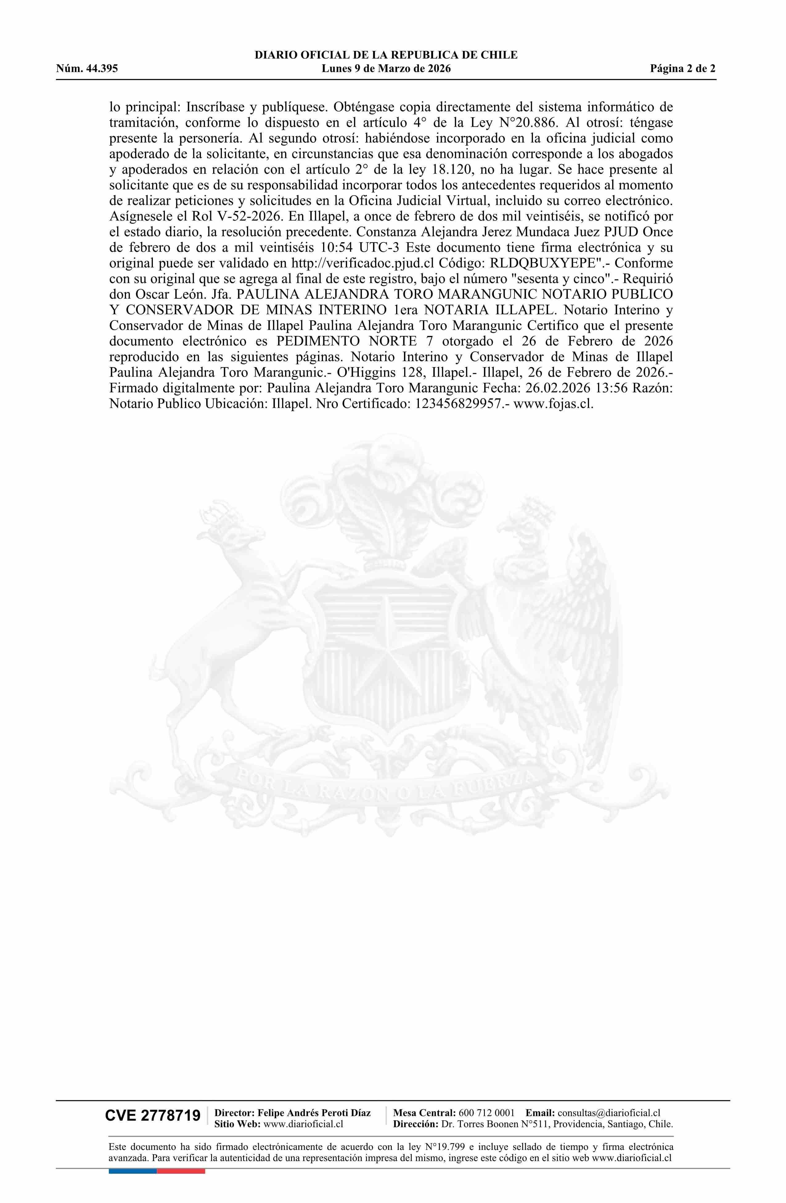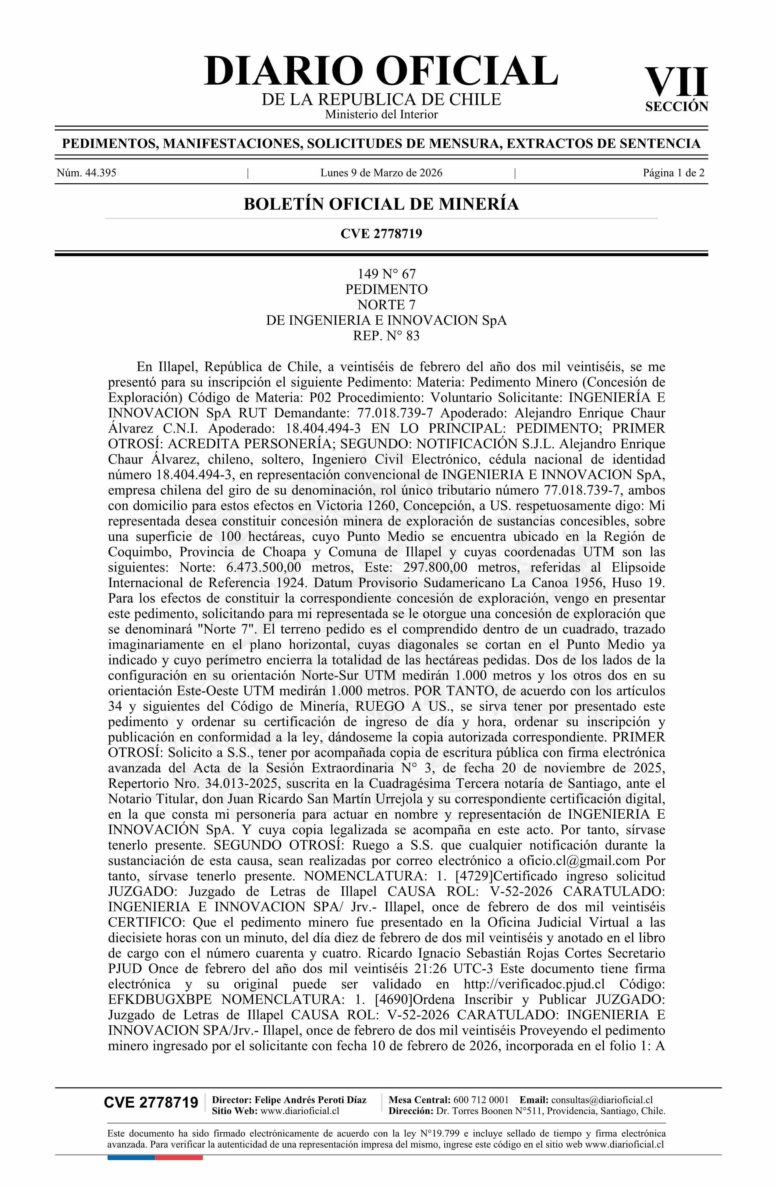 NORTE 7 / Ingeniería e Innovación SpA 09-03-2026 DIARIO OFICIAL CHILE - BOLETÍN OFICIAL DE MINERÍA |