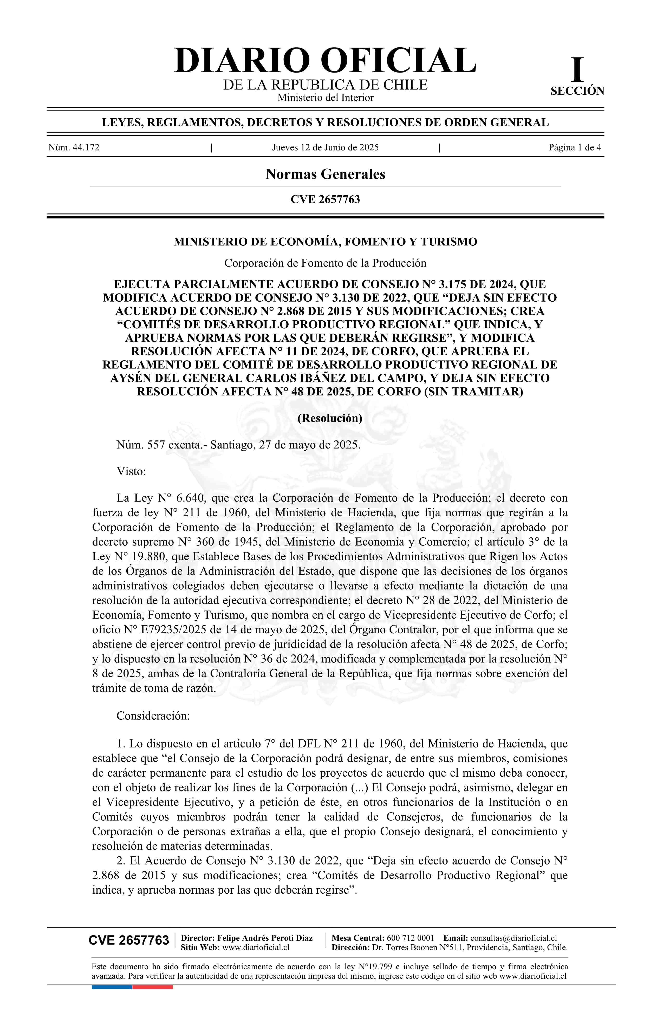 Título: Resolución exenta número 557, de 2025.- Ejecuta parcialmente Acuerdo de Consejo N° 3.175 de 2024, que modifica Acuerdo de Consejo N° 3.130 de 2022, que deja sin efecto Acuerdo de Consejo N° 2.868 de 2015 y sus modificaciones; crea Comités de Desarrollo Productivo Regional que indica, y aprueba norma