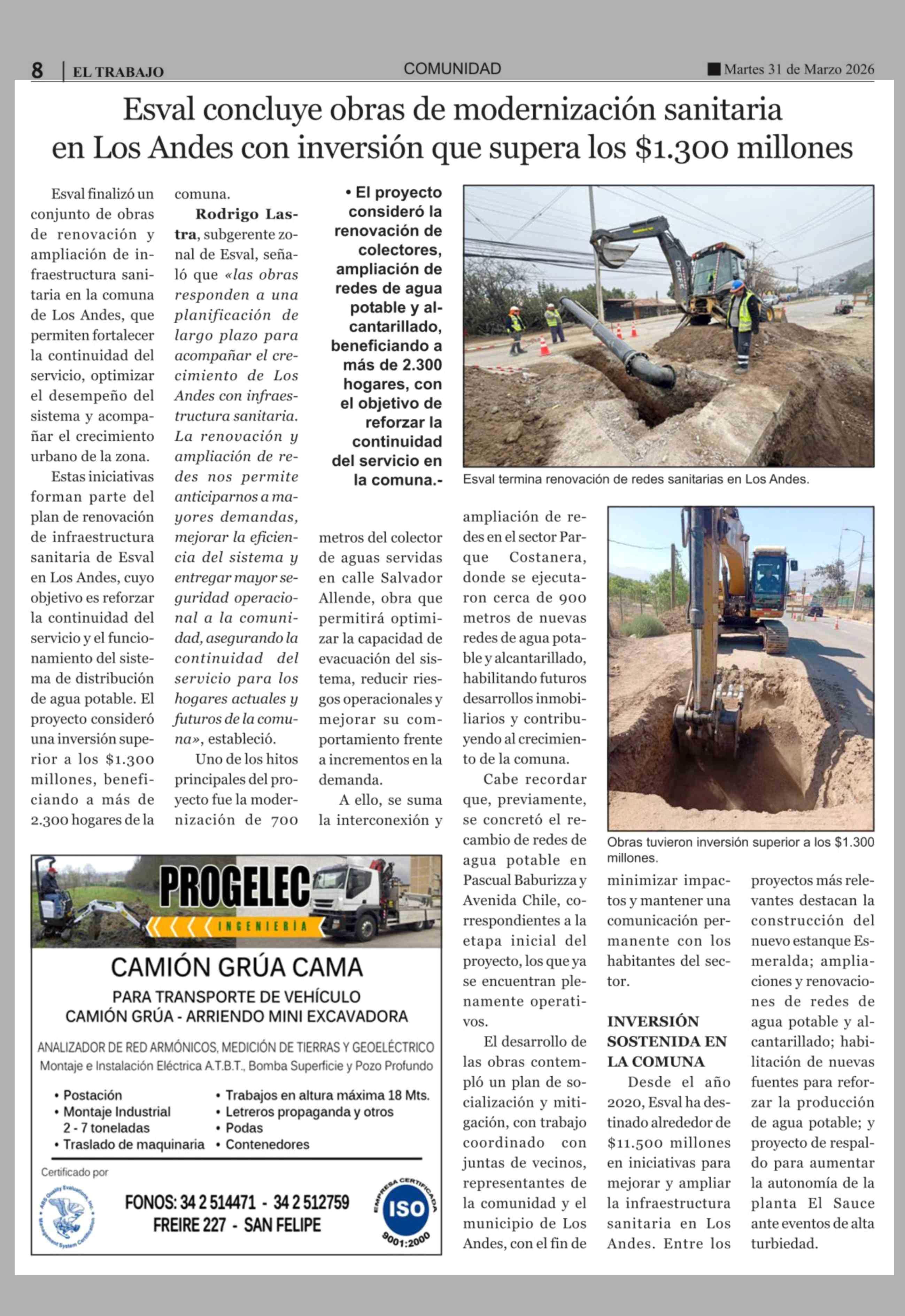 Esval concluye obras de modernización sanitaria en Los Andes con inversión que supera los $1.300 millones 31-03-2026 El Trabajo |