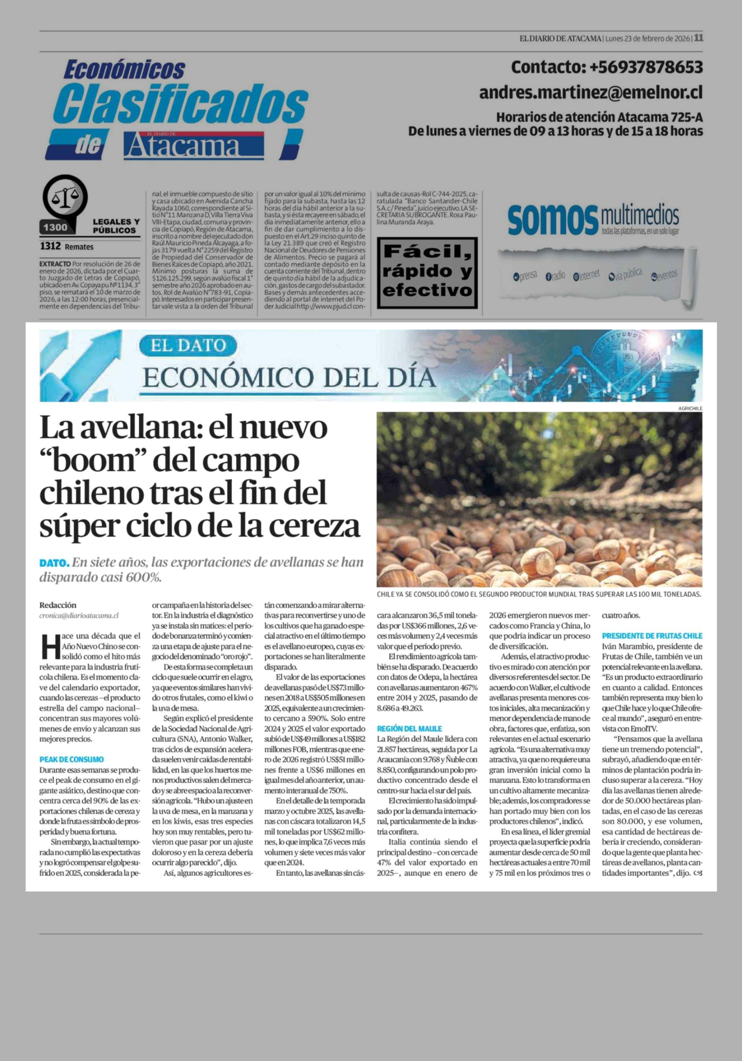 La avellana: el nuevo "boom" del campo chileno tras el fin del súper ciclo de la cereza 23-02-2026 El Diario de Atacama |