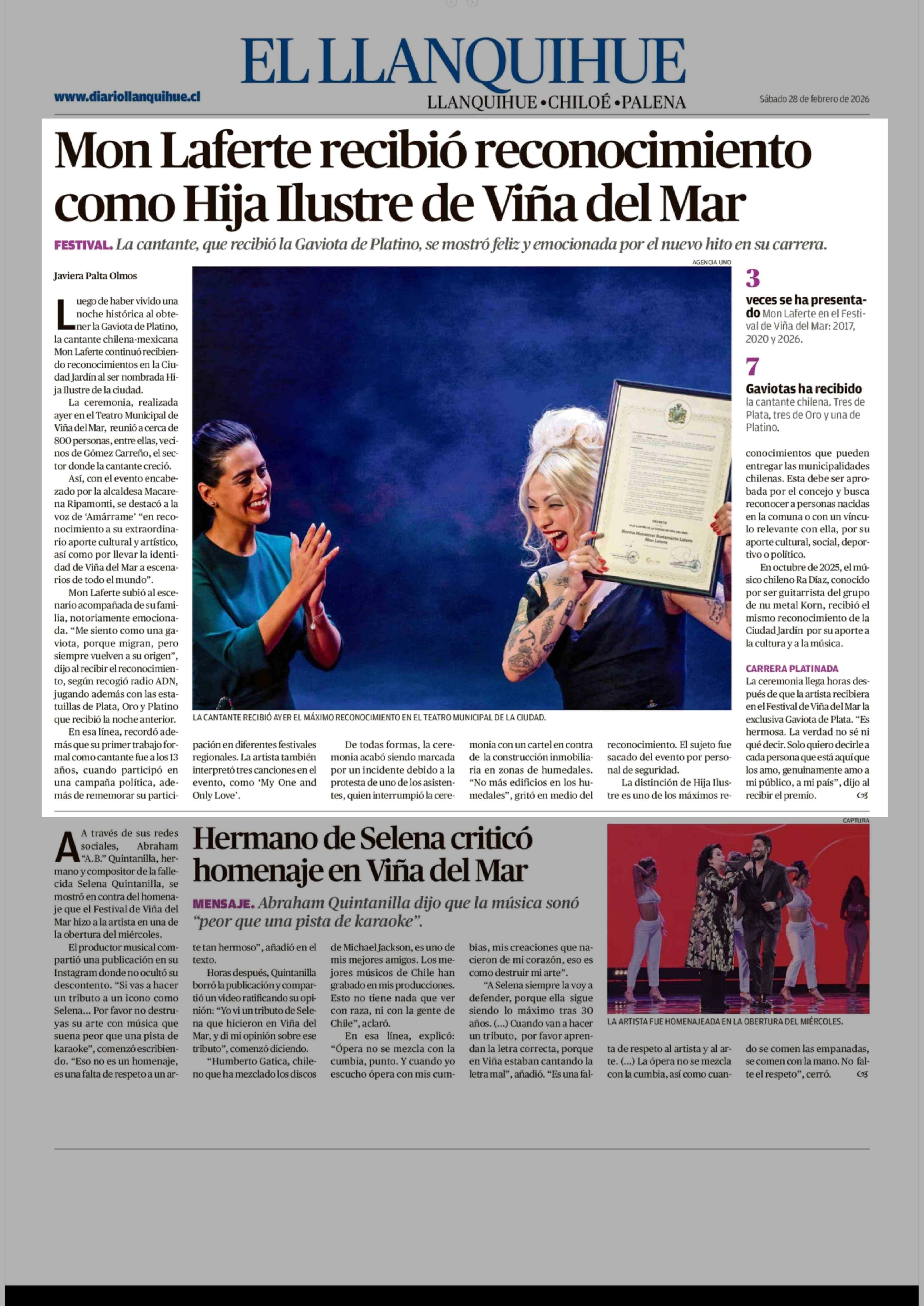 Título: Mon Laferte recibió reconocimiento como Hija Ilustre de Viña del Mar