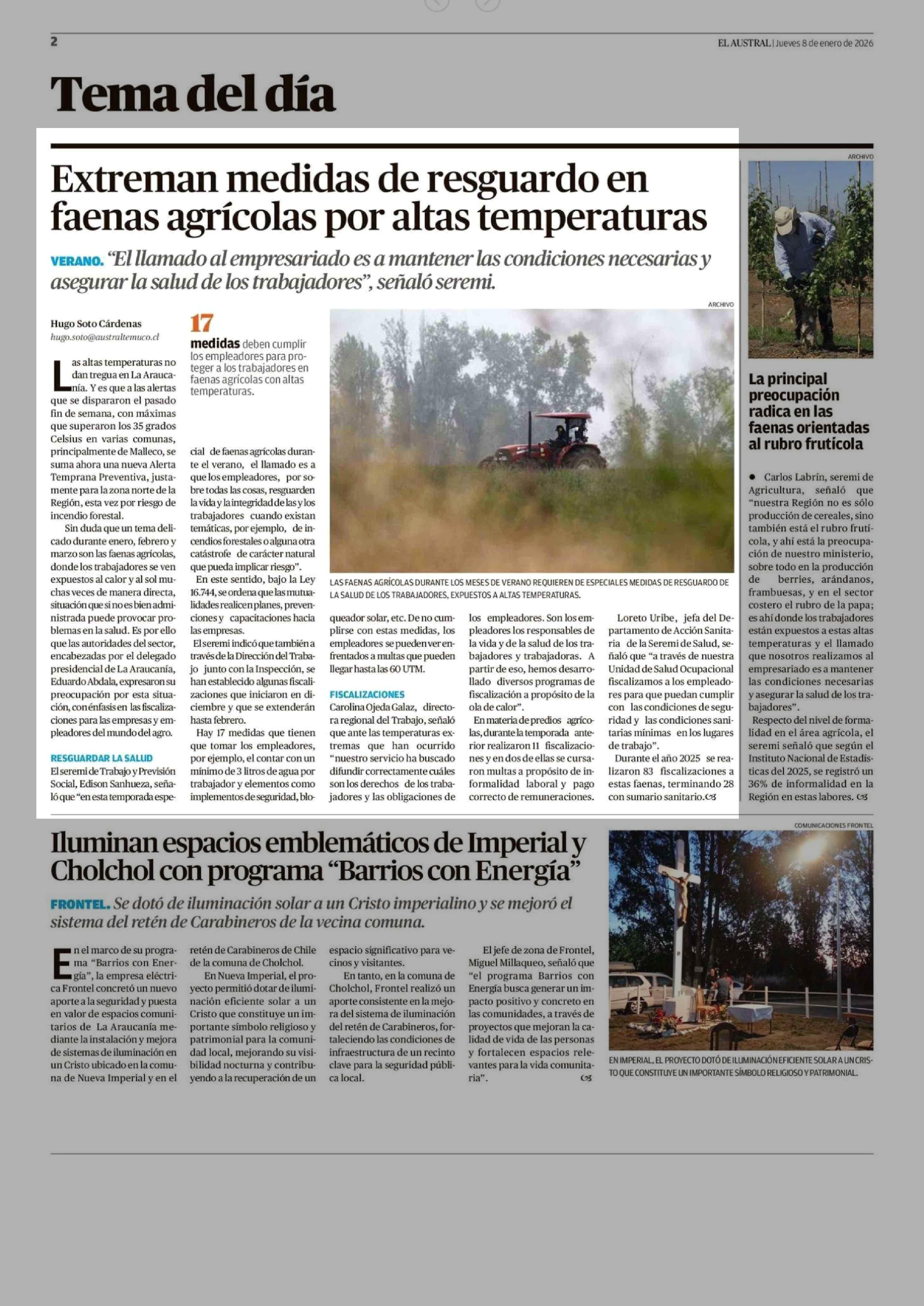 Extreman medidas de resguardo en faenas agrícolas por altas temperaturas 08-01-2026 El Austral de la Araucanía |