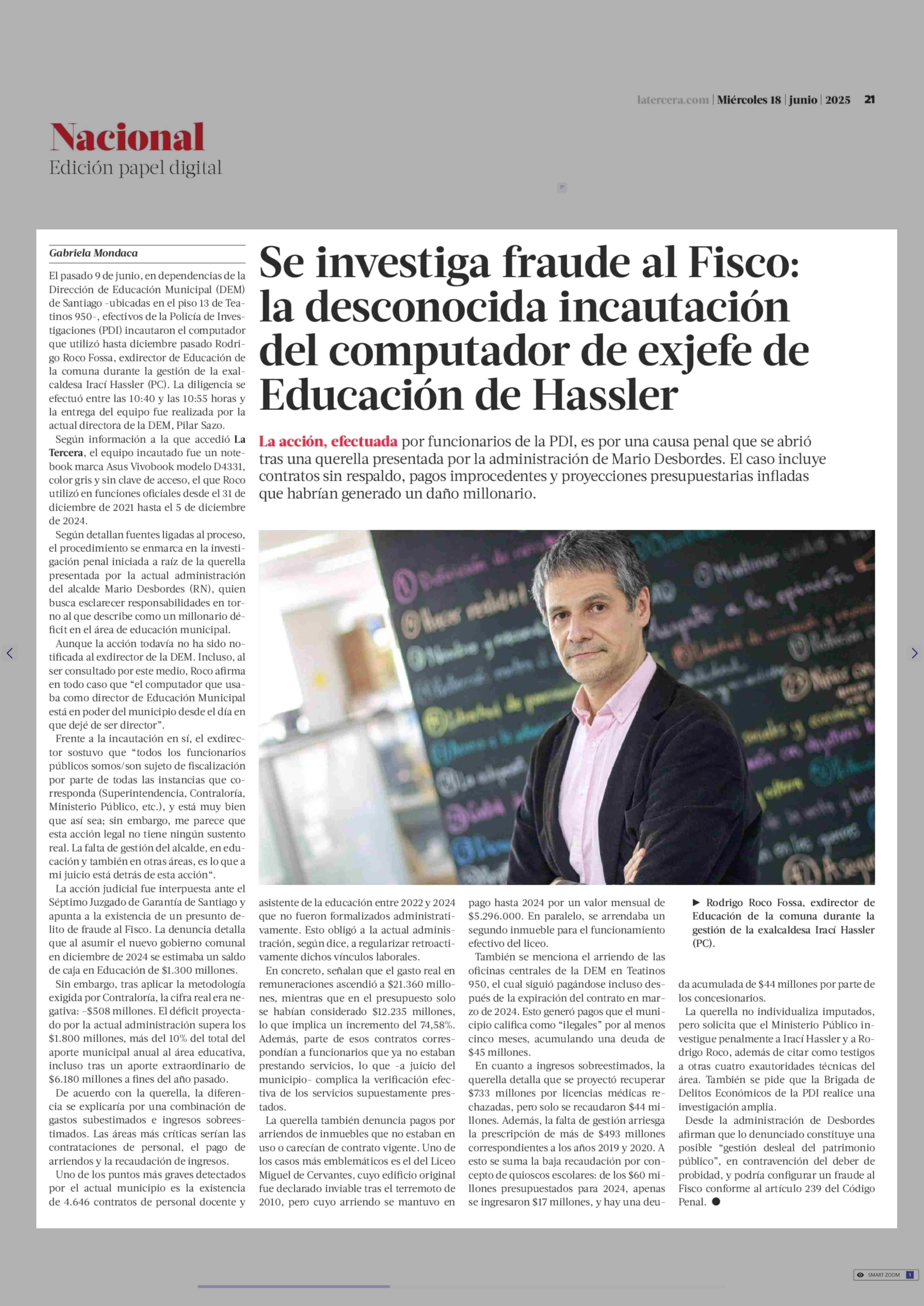 Se investiga fraude al Fisco: la desconocida incautación del computador de exjefe de Educación de Hassler 18-06-2025 La Tercera |