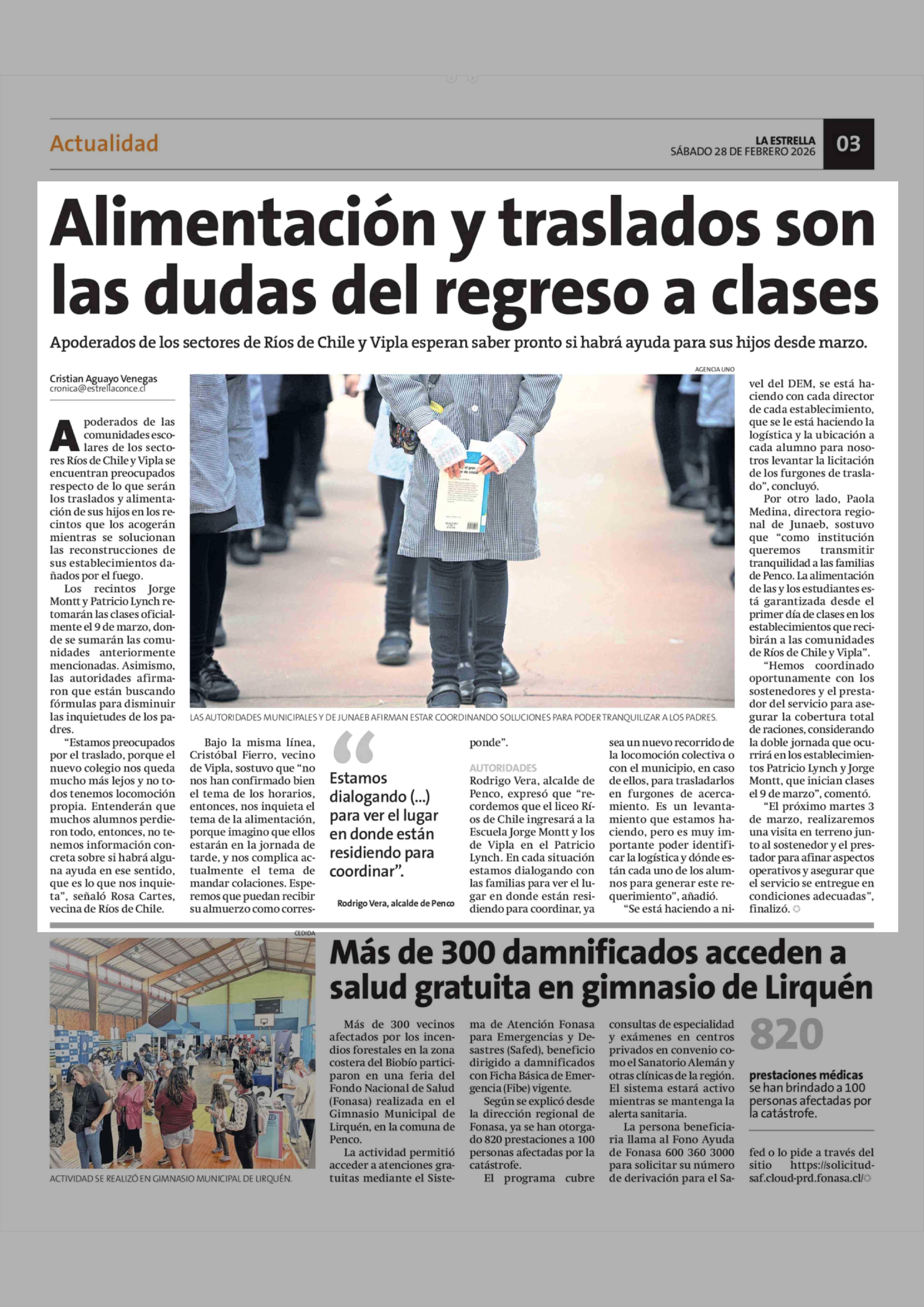 Alimentación y traslados son las dudas del regreso a clases 28-02-2026 La Estrella de Concepción |
