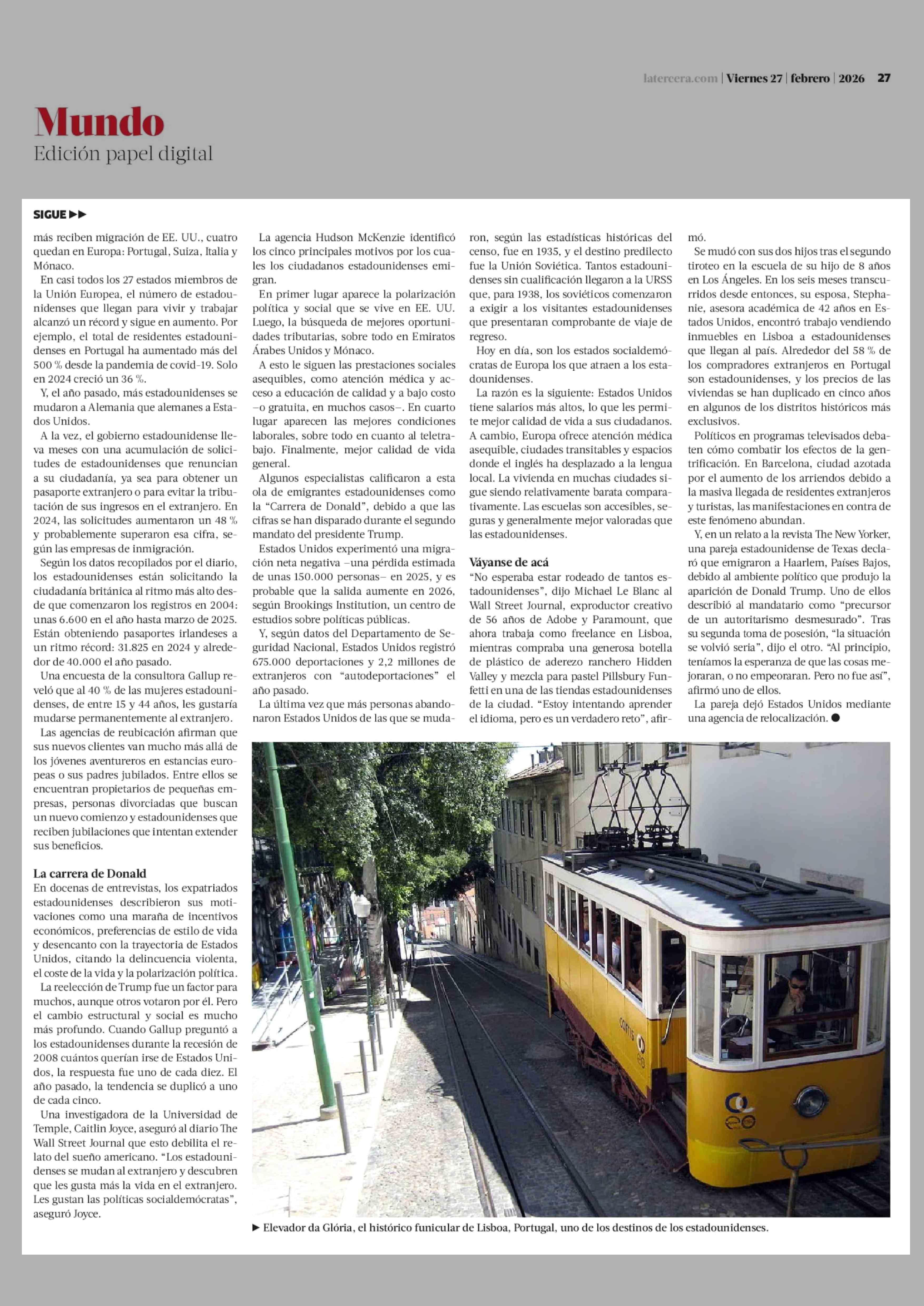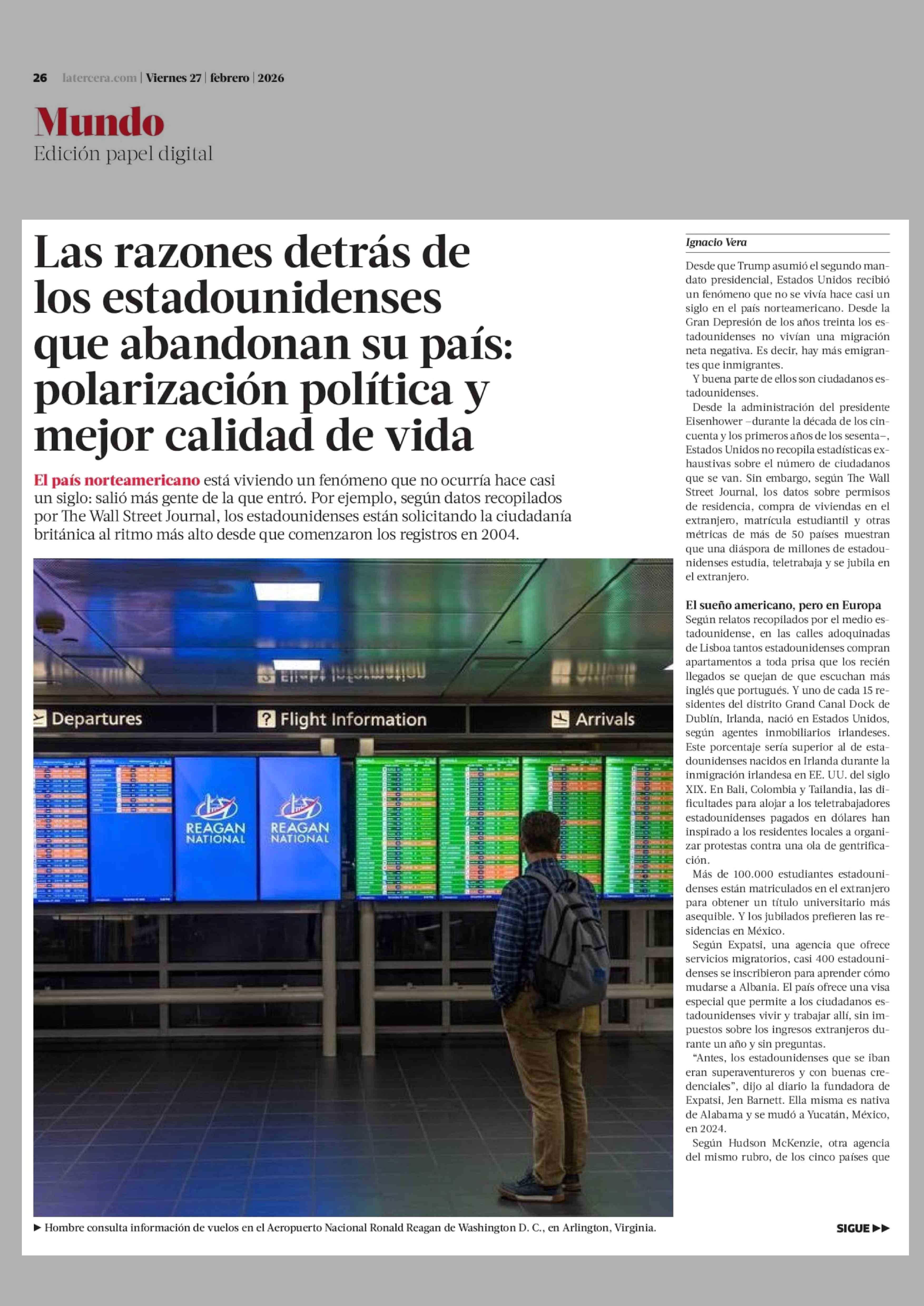 Las razones detrás de los estadounidenses que abandonan su país: polarización política y mejor calidad de vida 27-02-2026 La Tercera |