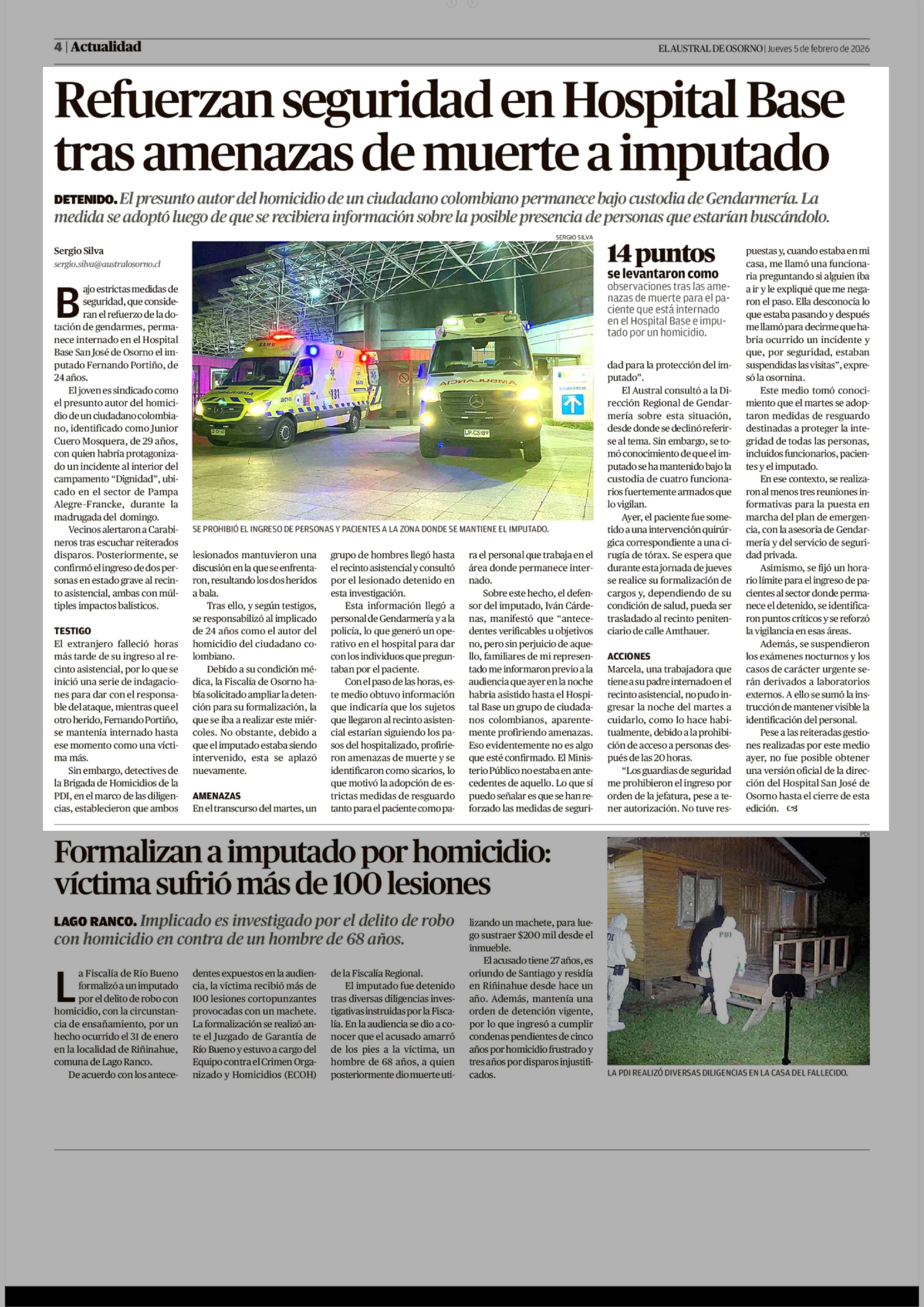 Refuerzan seguridad en Hospital Base tras amenazas de muerte a imputado 05-02-2026 El Austral de Osorno |