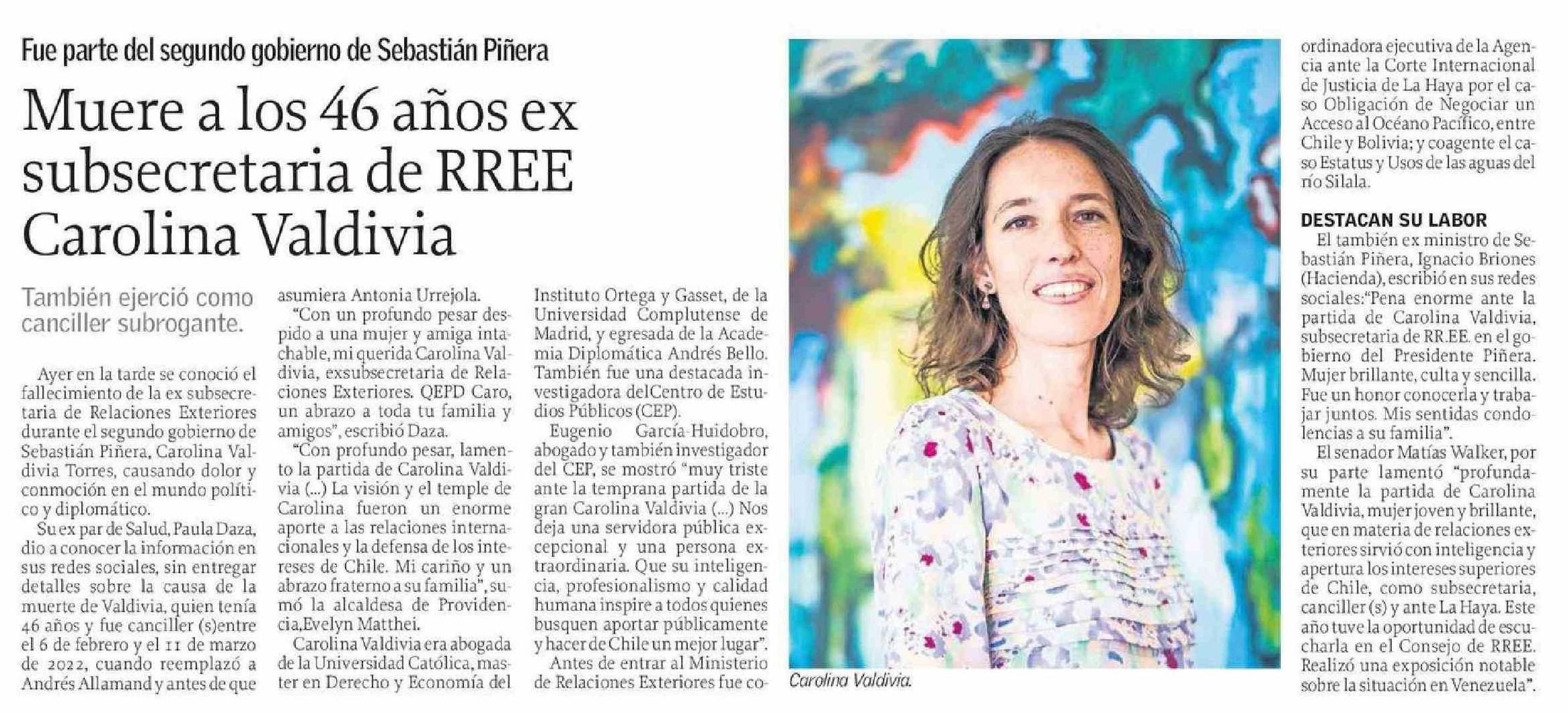 | Título: | Muere a los 46 años ex subsecretaria de RREE Carolina Valdivia |