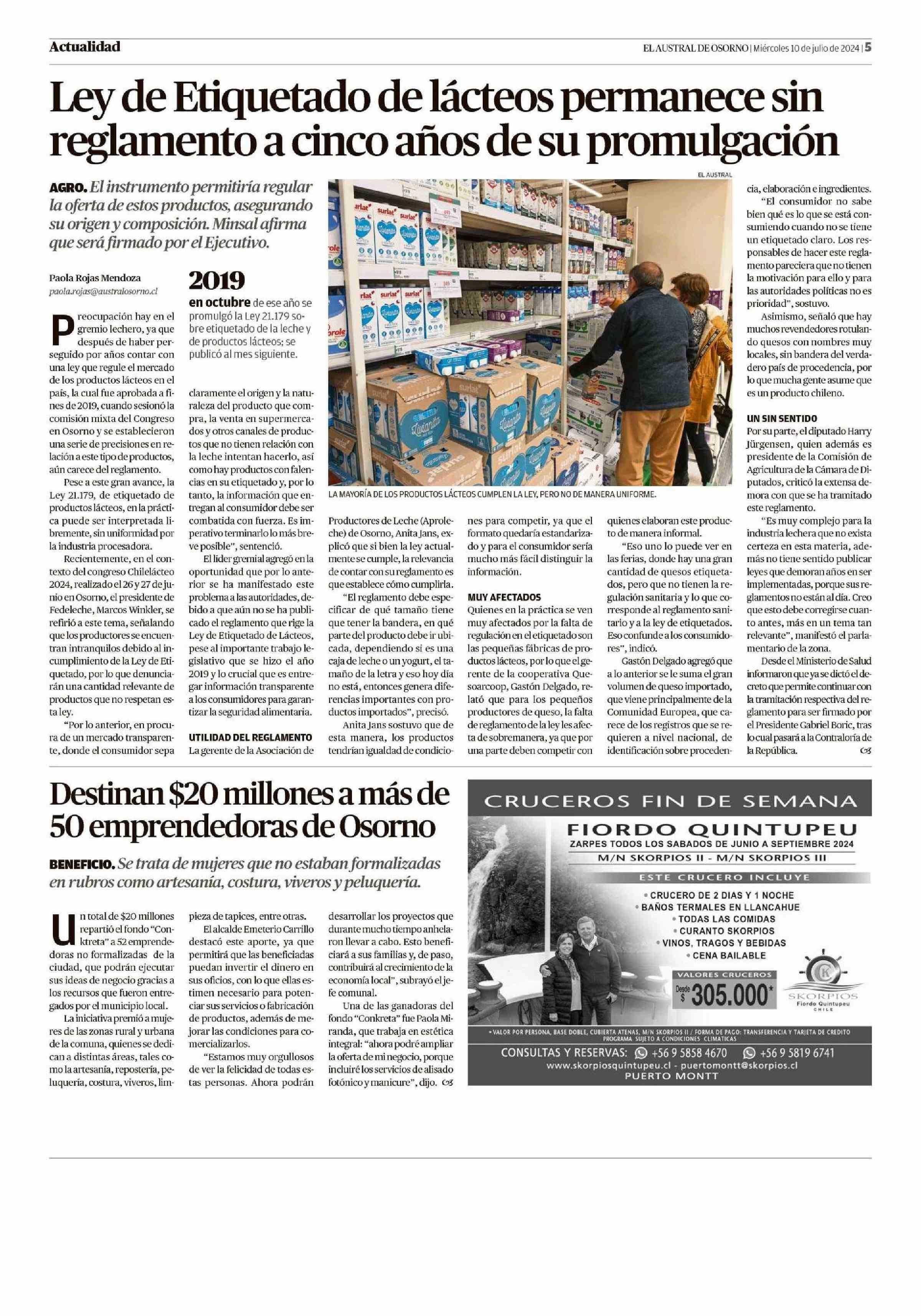 Ley de Etiquetado de lácteos permanece sin reglamento a cinco años de su promulgación 10-07-2024 El Austral de Osorno |