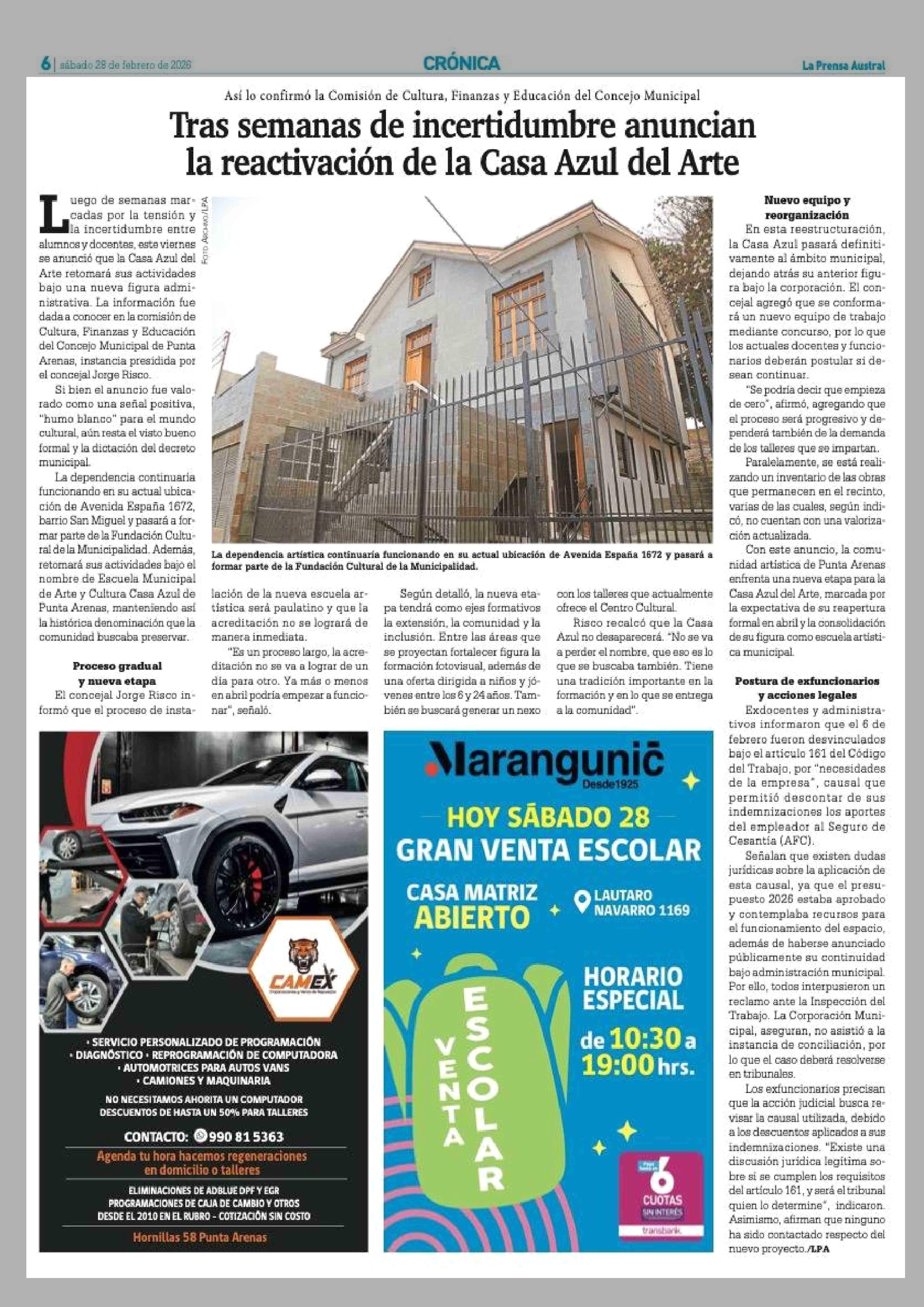 Tras semanas de incertidumbre anuncian la reactivación de la Casa Azul del Arte 28-02-2026 La Prensa Austral |