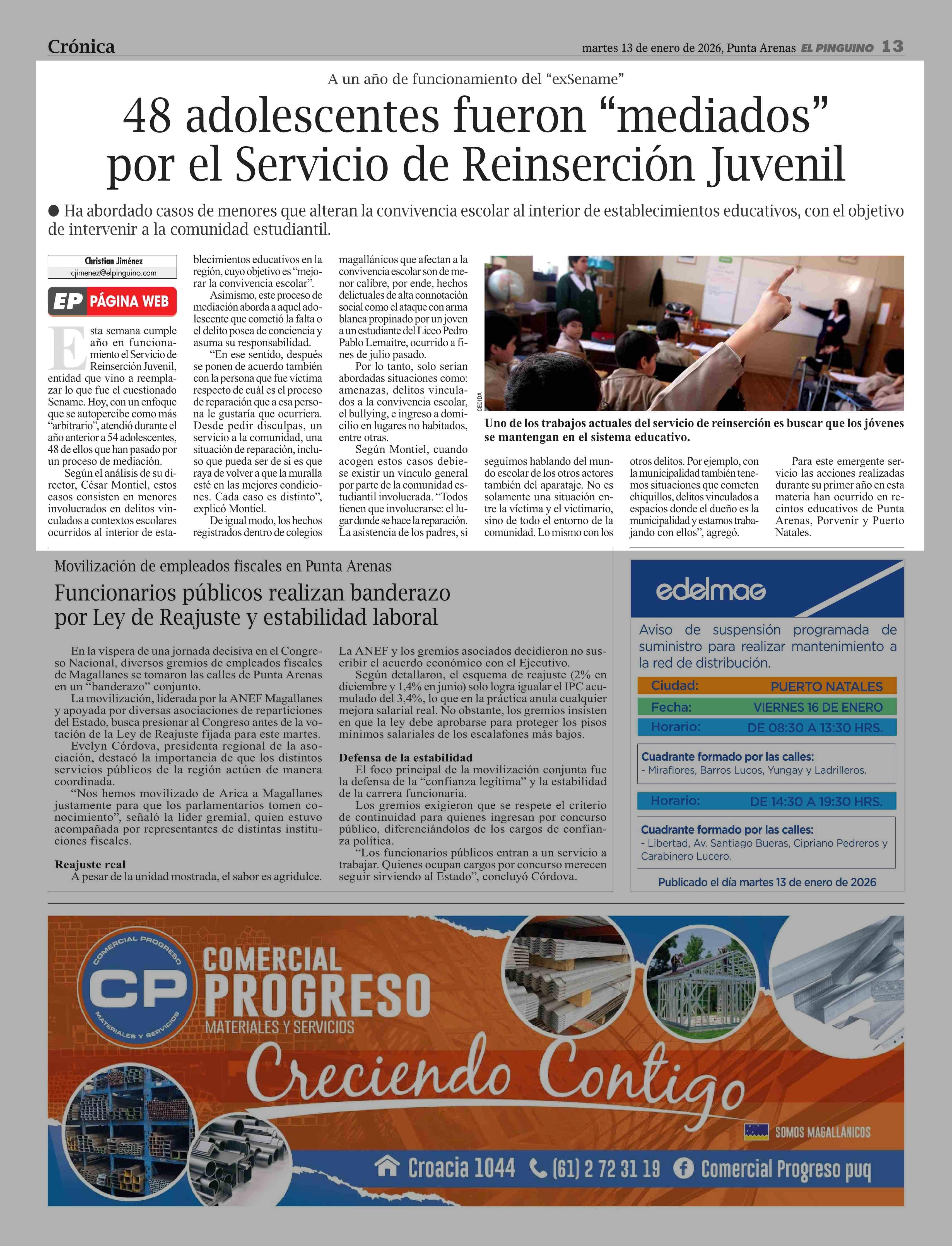48 Adolescentes fueron "mediados" por el Servicio de Reinserción Juvenil 13-01-2026 El Pingüino |
