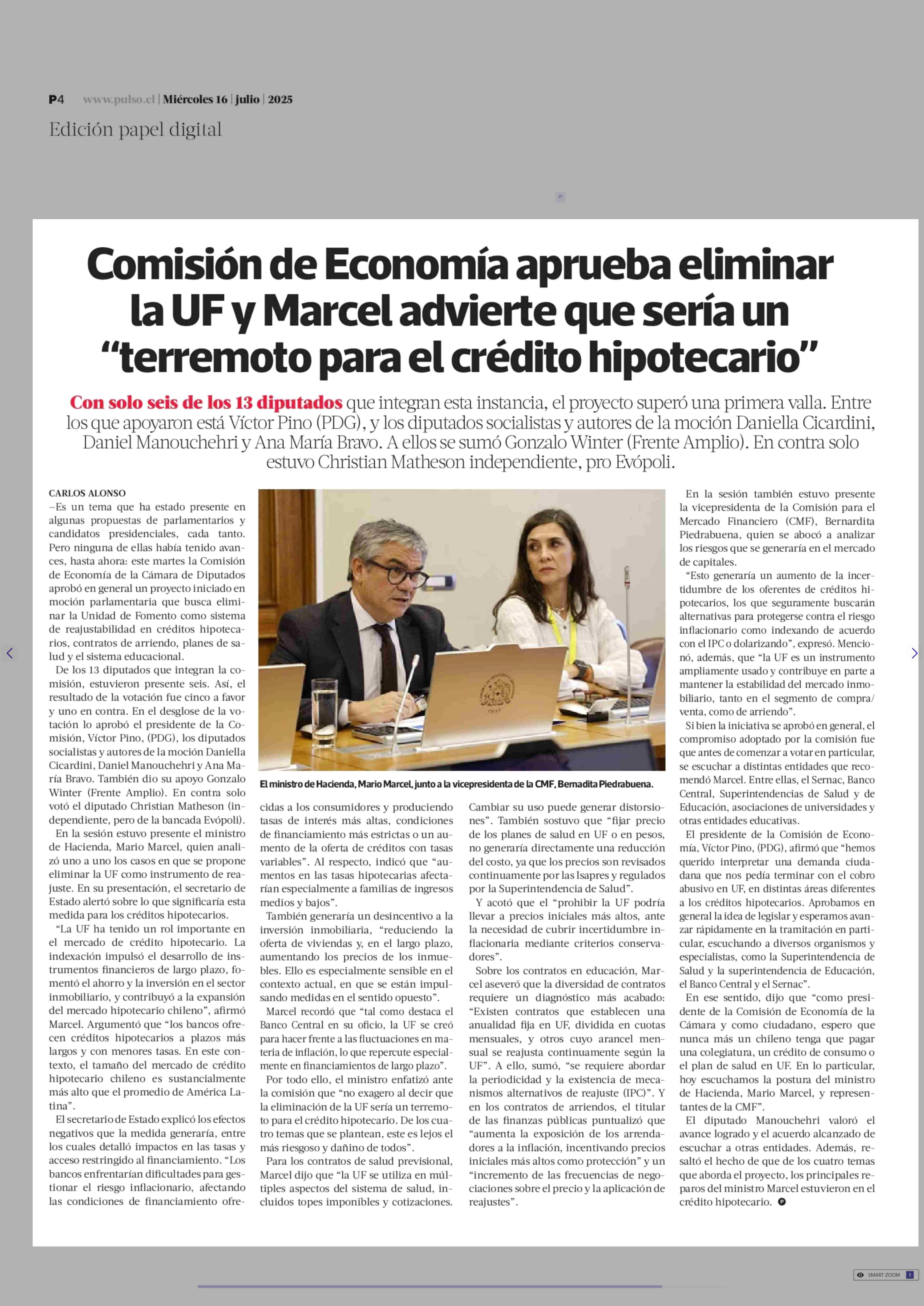 Comisión de Economía aprueba eliminar la UF y Marcel advierte que sería un “terremoto para el crédito hipotecario” 16-07-2025 La Tercera |