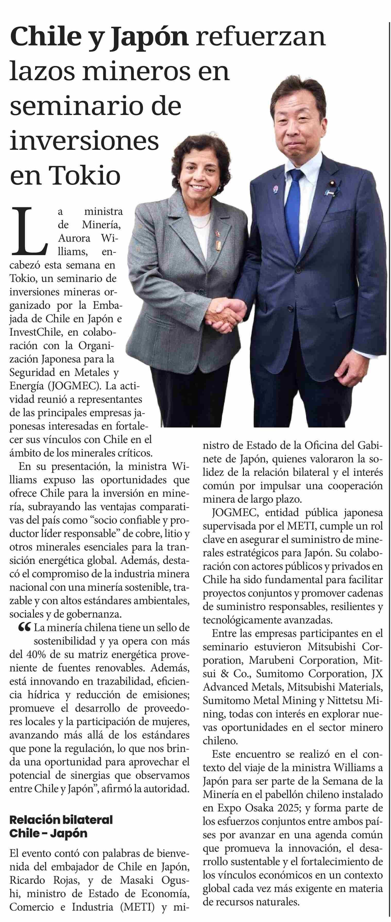 Chile y Japón refuerzan lazos mineros en seminario de inversiones en Tokio 22-06-2025 Diario Chañarcillo |