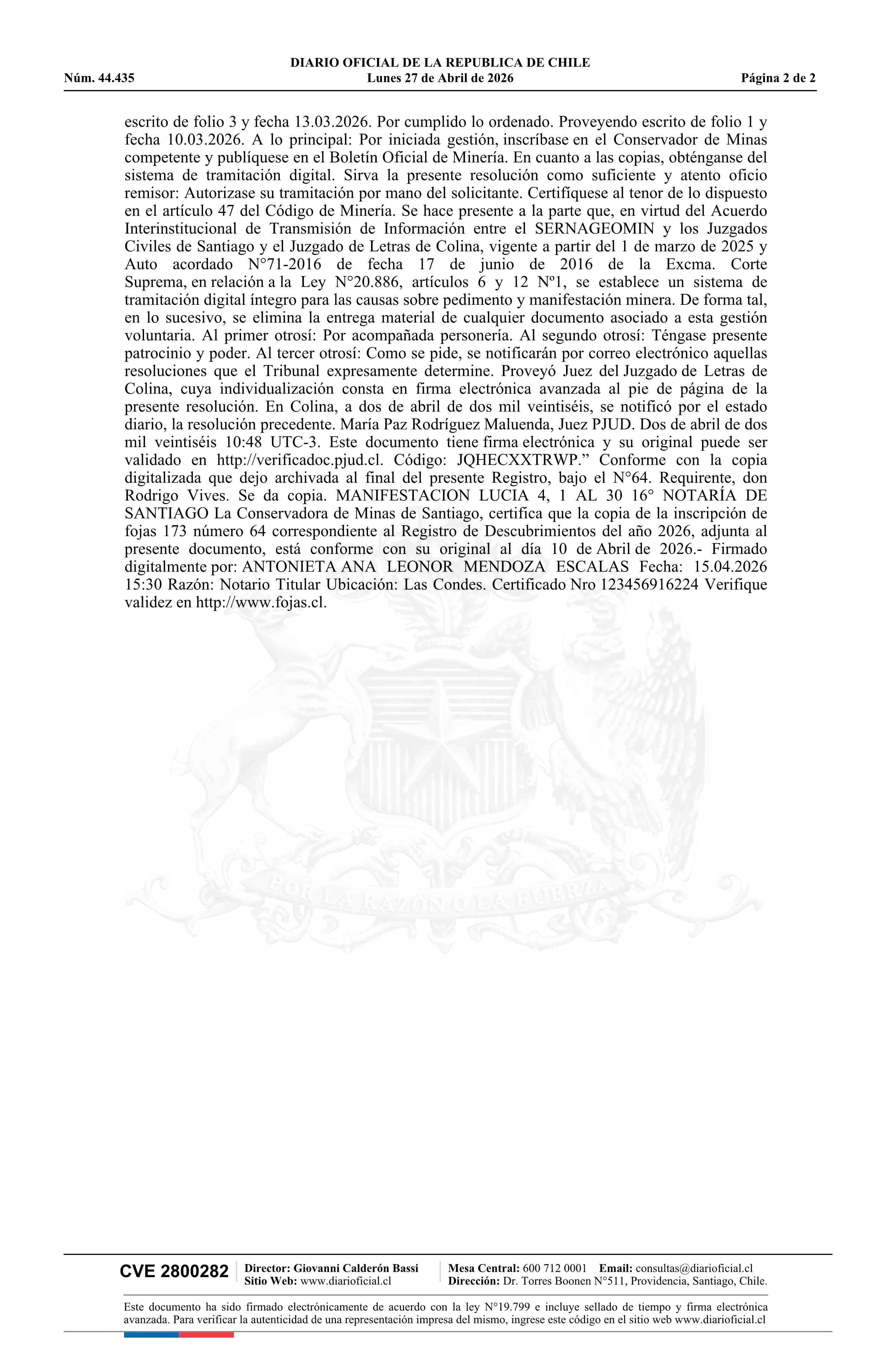 LUCIA 4, 1 AL 30 / CVE Proyecto Treinta y Cuatro SpA 27-04-2026 DIARIO OFICIAL CHILE - BOLETÍN OFICIAL DE MINERÍA |