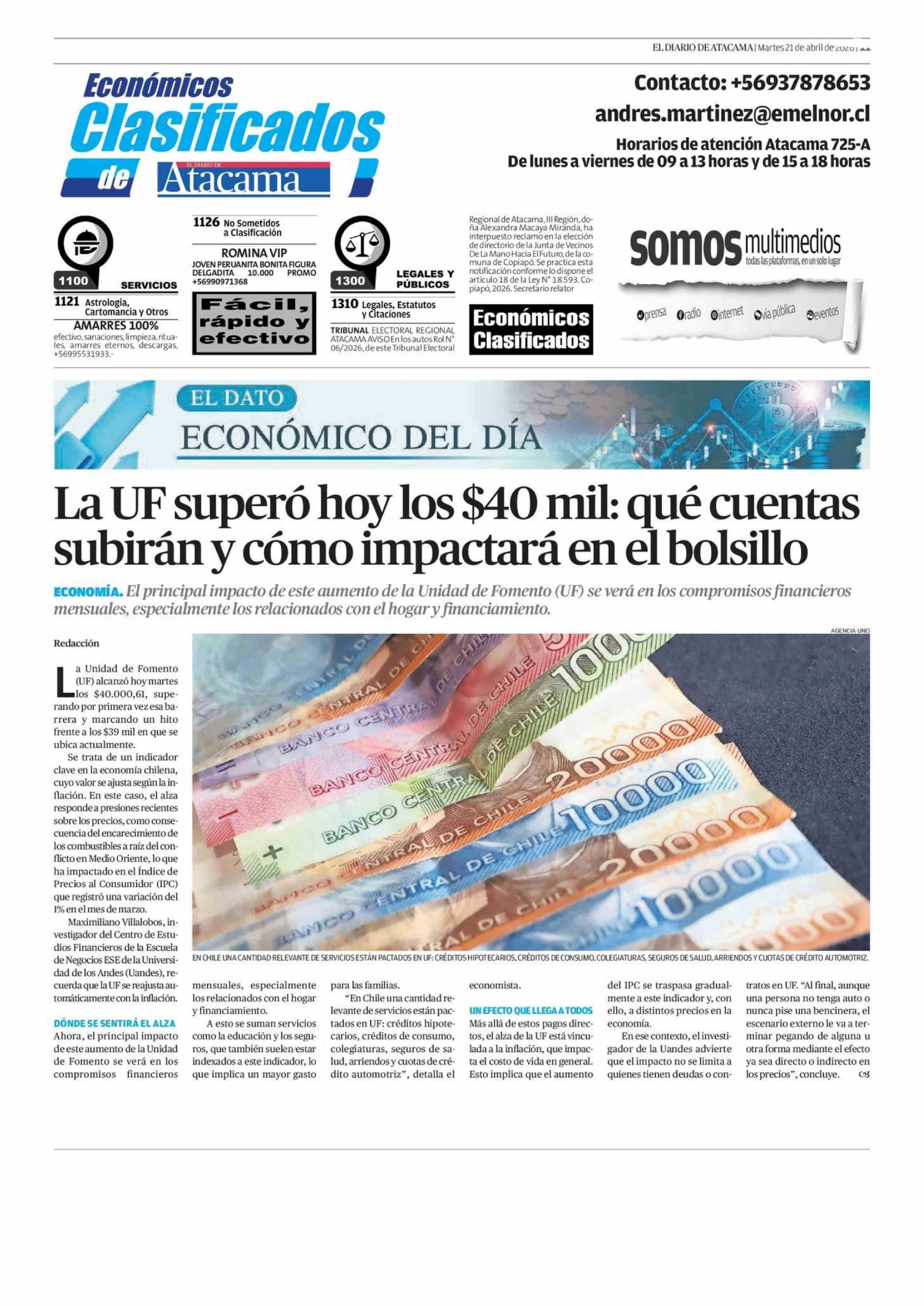 La UF superó hoy los $40 mil: qué cuentas subirán y cómo impactará en el bolsillo 21-04-2026 El Diario de Atacama |