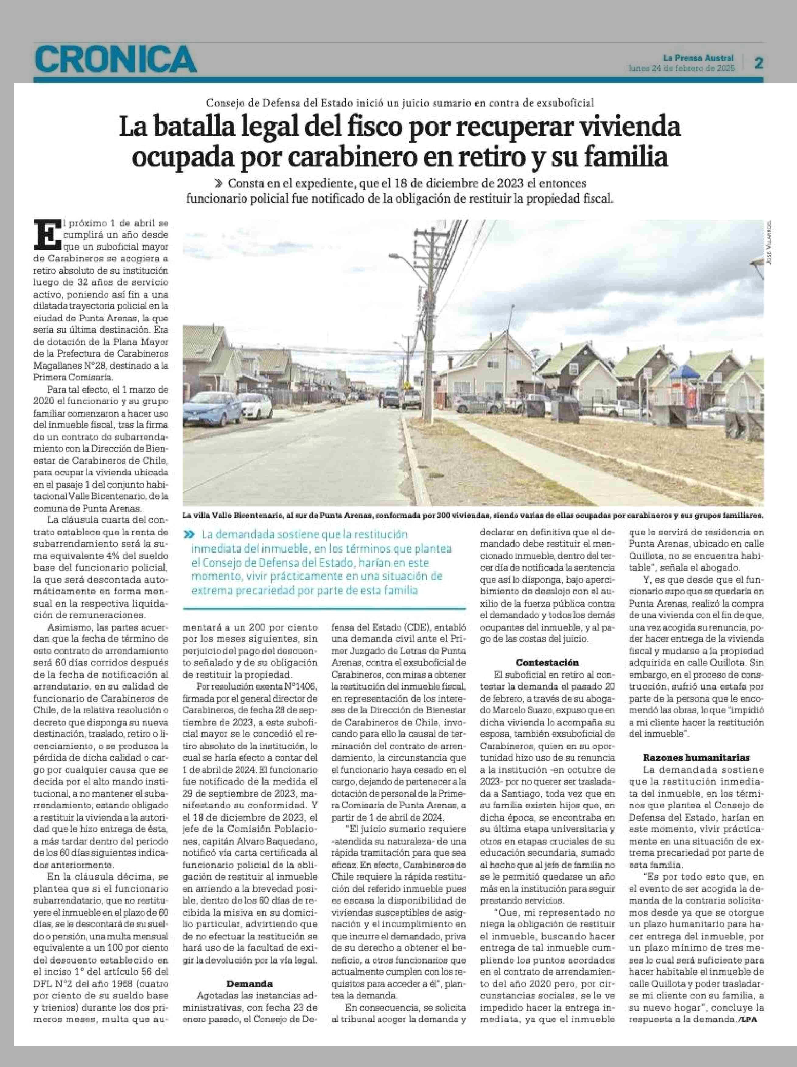 La batalla legal del fisco por recuperar vivienda ocupada por carabinero en retiro y su familia 24-02-2025 La Prensa Austral |