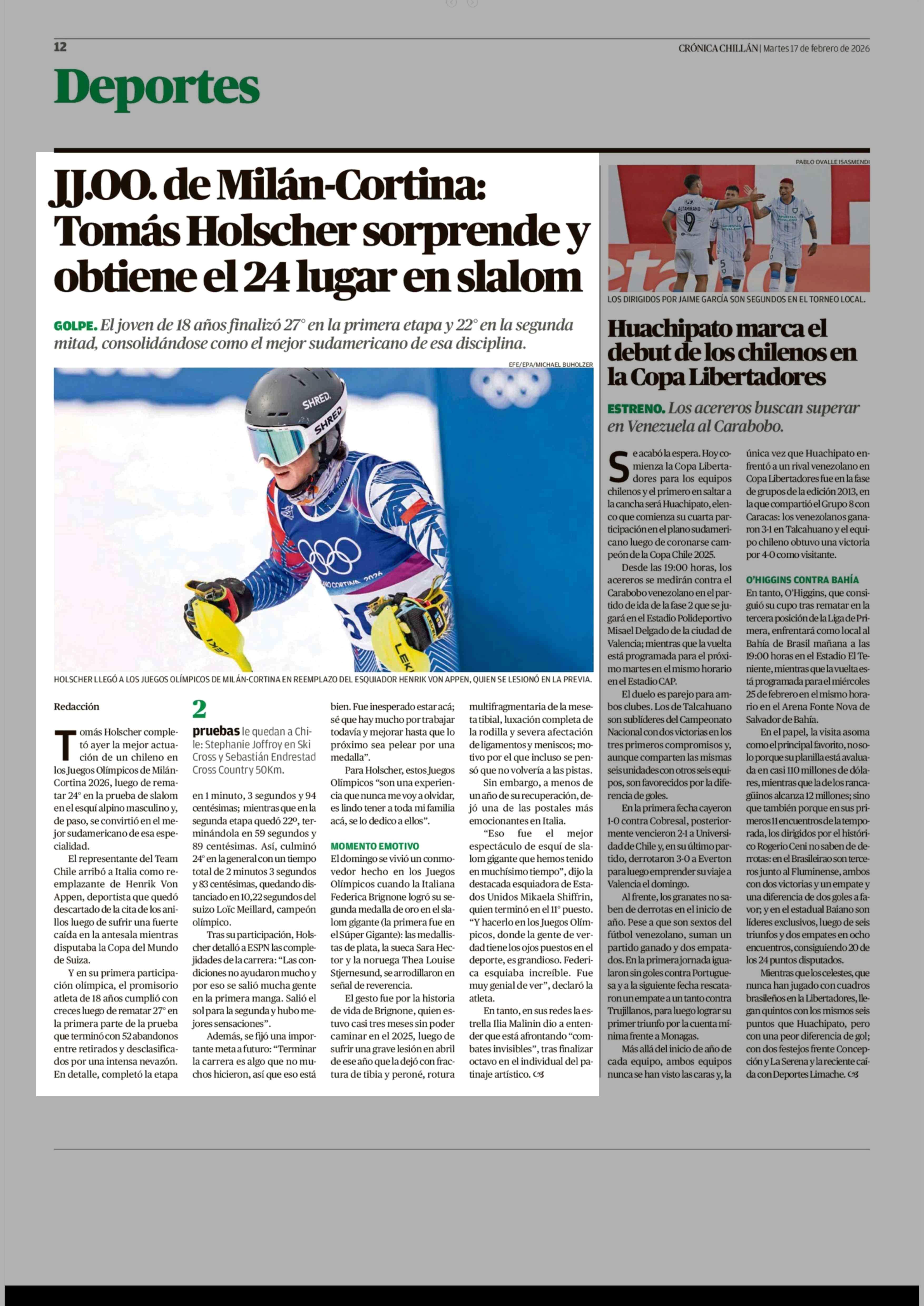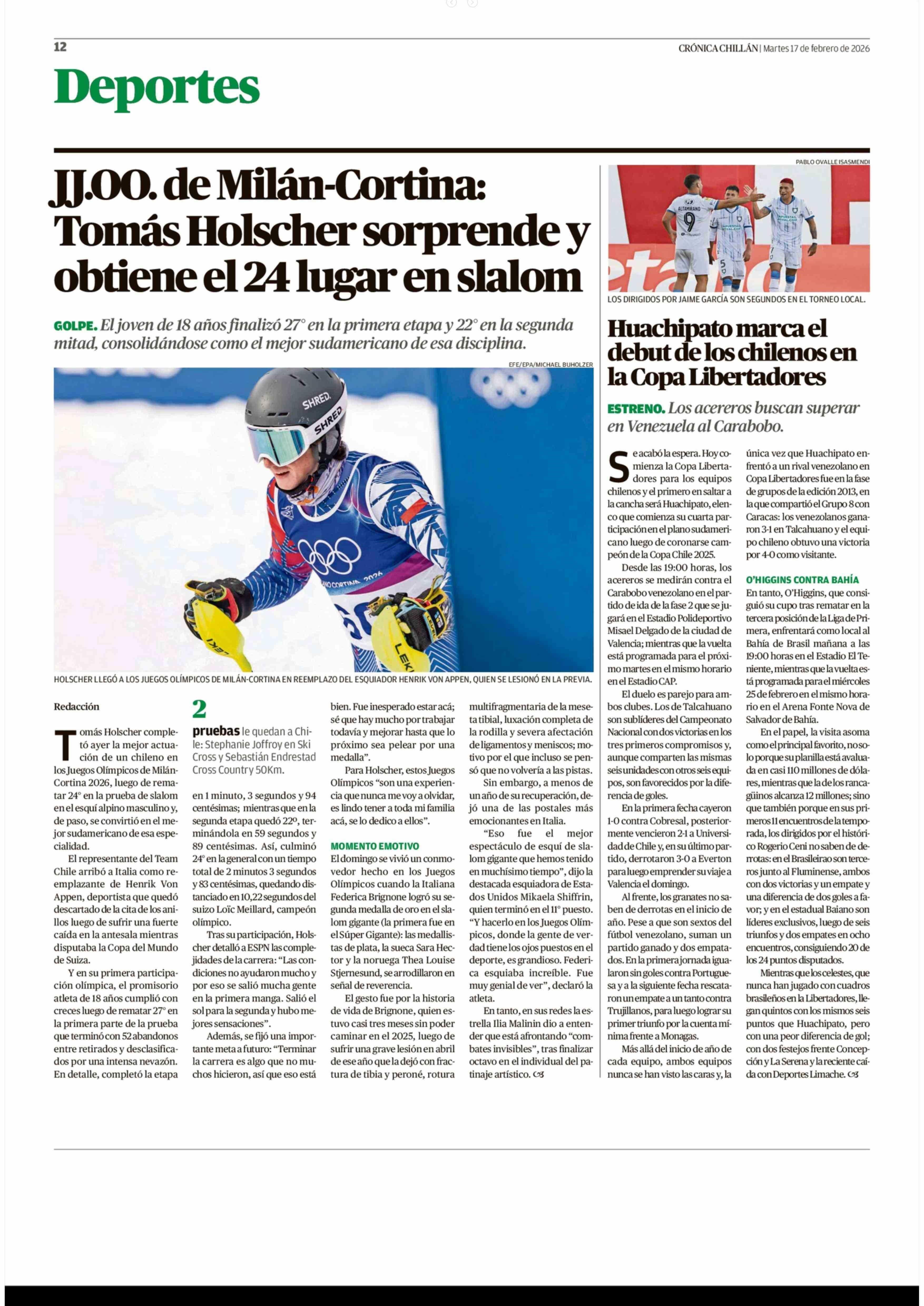 JJ.OO. de Milán-Cortina: Tomás Holscher sorprende y obtiene el 24 lugar en slalom 17-02-2026 Crónica de Chillán |