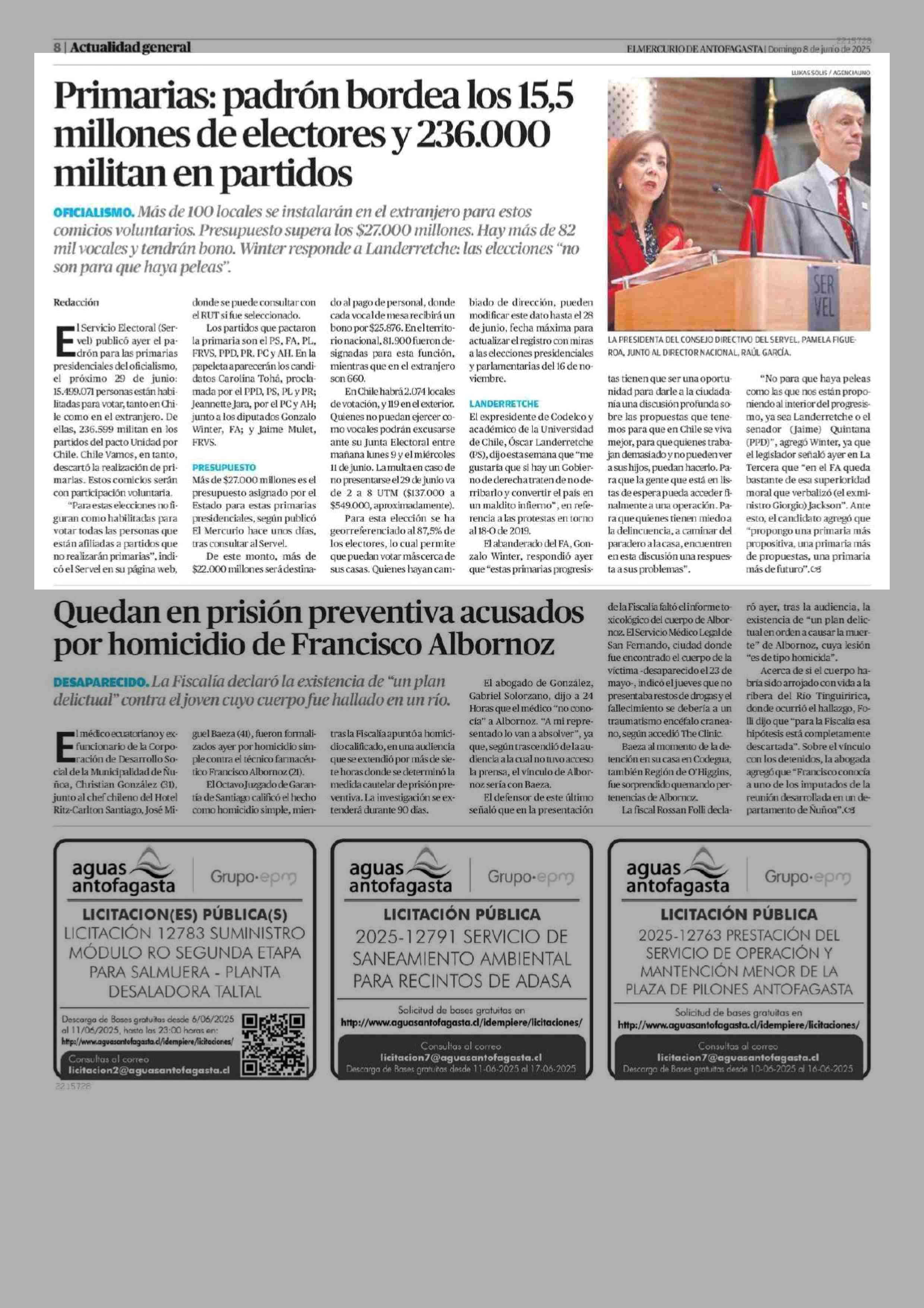 Primarias: padrón bordea los 15,5 millones de electores y 236.000 militan en partidos 08-06-2025 El Mercurio de Antofagasta |